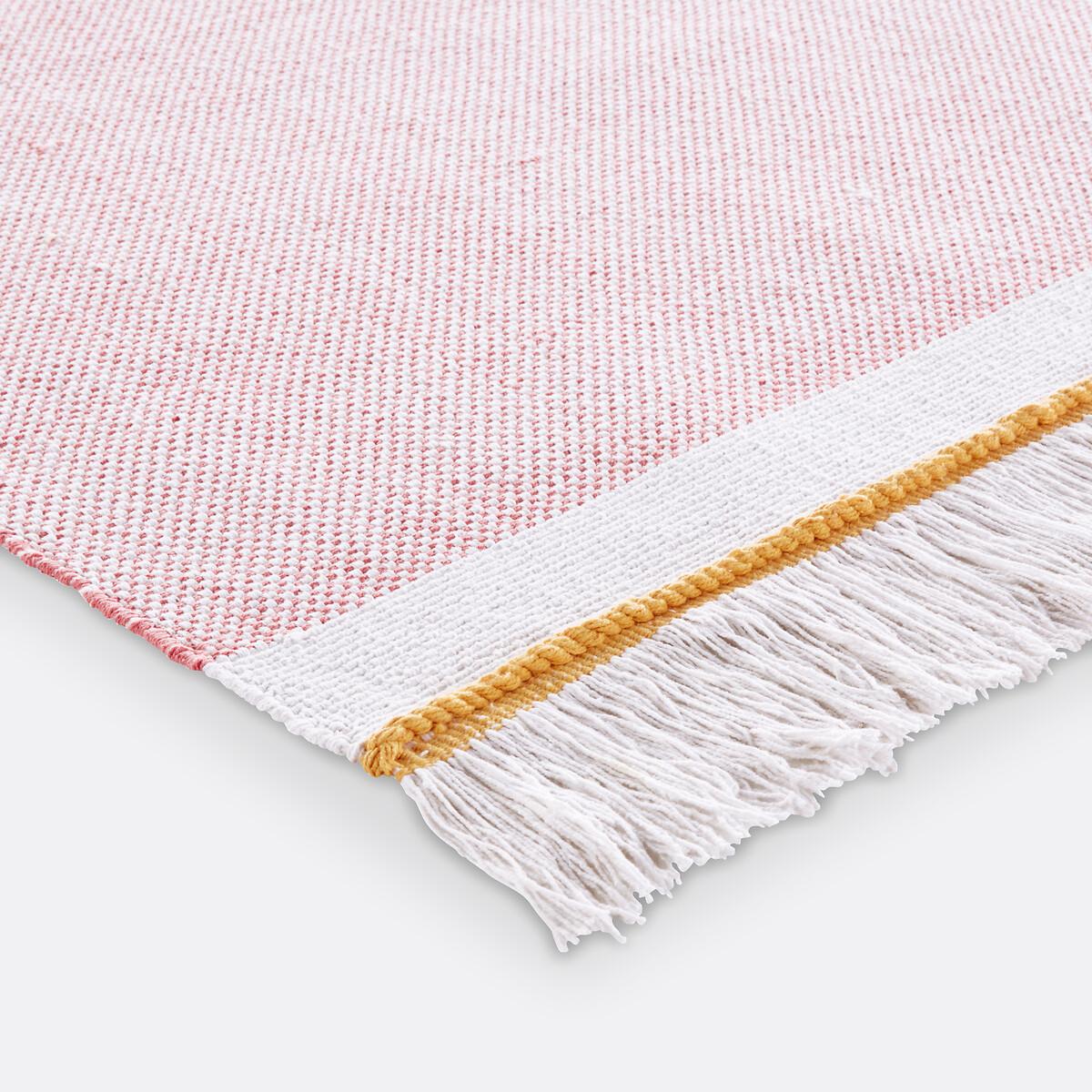 The Naga rug looks great in a bedroom. Available in a palette of soft colours. Product Details • 100% cotton, 1150 g/m2 • Flat woven • Fringed edging • Thickness: 1 cm max. Dimensions • Width: 90 cm x Length : 120cm • Width: 120cm x Length : 170cm. Home Delivery. Available for home delivery. • OEKO-TEX® Standard 100. Standard 100 certification by OEKO-TEX® tests textile products for harmful substances via an independent, international label.
