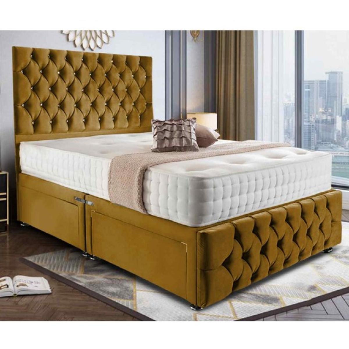 The all-new modern designer divan bed frame, handmade in the UK. Beautiful chesterfield upholstered headboard and footboard with diamantes with optional storage options. To complete the look this bed comes with chrome feet. This bed is sure to add a glamourous look to any bedroom setting. Recommended mattress is a 10 inch.