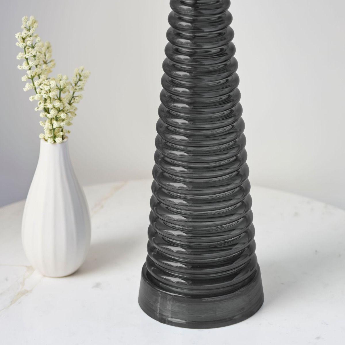 Timeless table lamp with grey glass base and velvet shade Classic and timeless in design, the Naia table lamp is a gorgeous mixed material light. Boasting grey ribbed glass design base and velvet mocha shade, this light is perfect for on beside tables, console and side tables. Style this light with one of our vast selection of LED E27 light bulbs. Timeless table lamp with grey glass base and velvet shade Classic and timeless in design, the Naia table lamp is a gorgeous mixed material light. Boasting grey ribbed glass design base and velvet mocha shade, this light is perfect for on beside tables, console and side tables. Style this light with one of our vast selection of LED E27 light bulbs.
