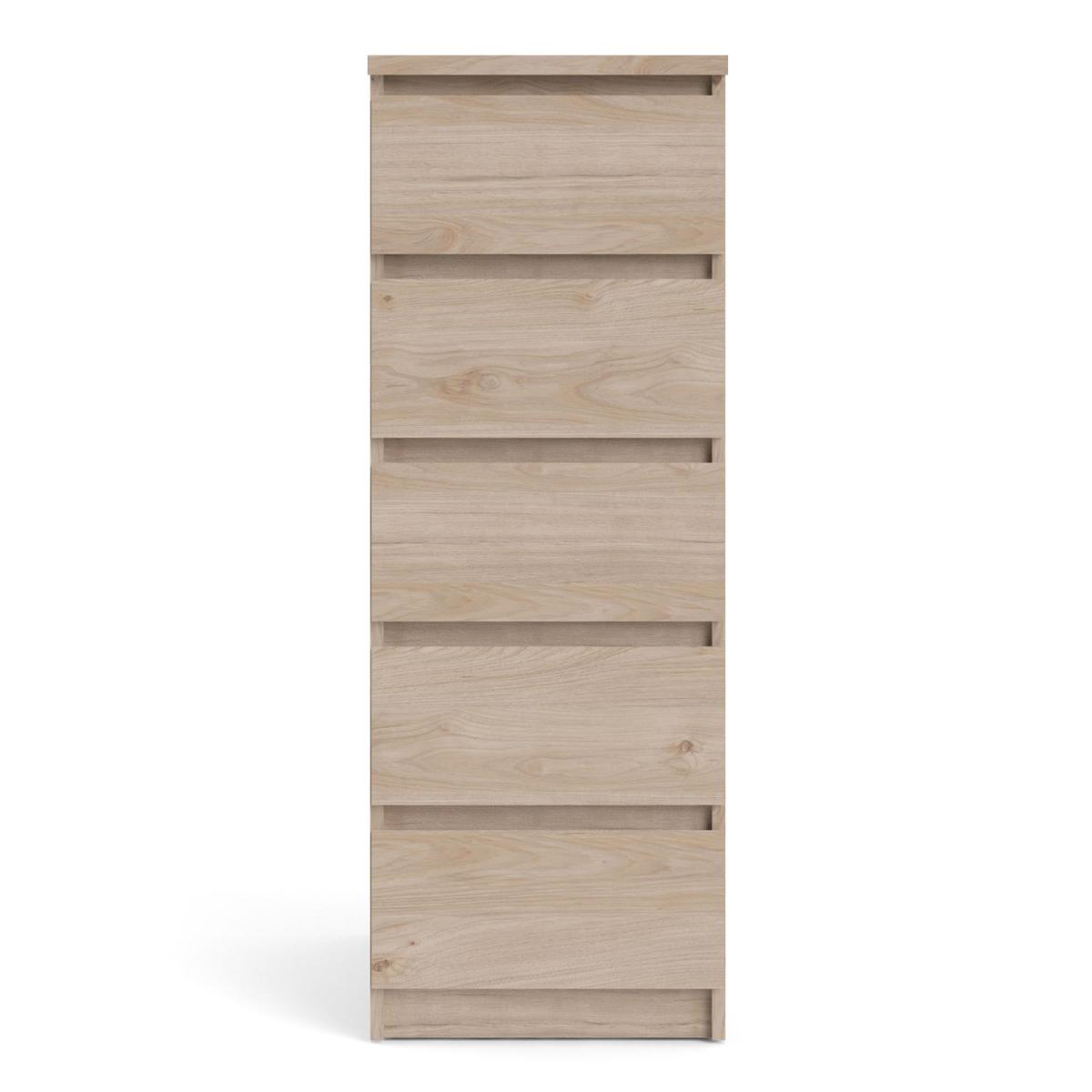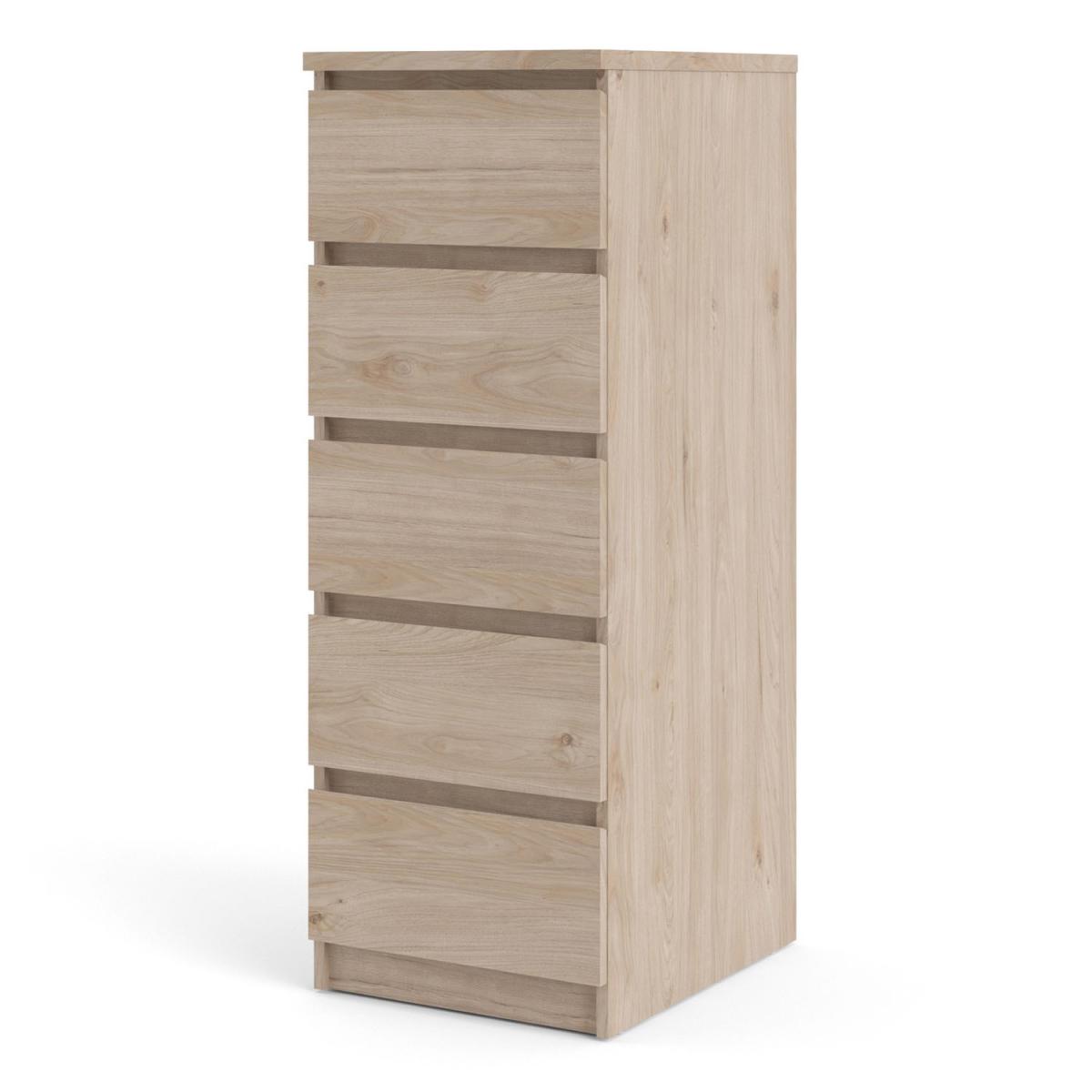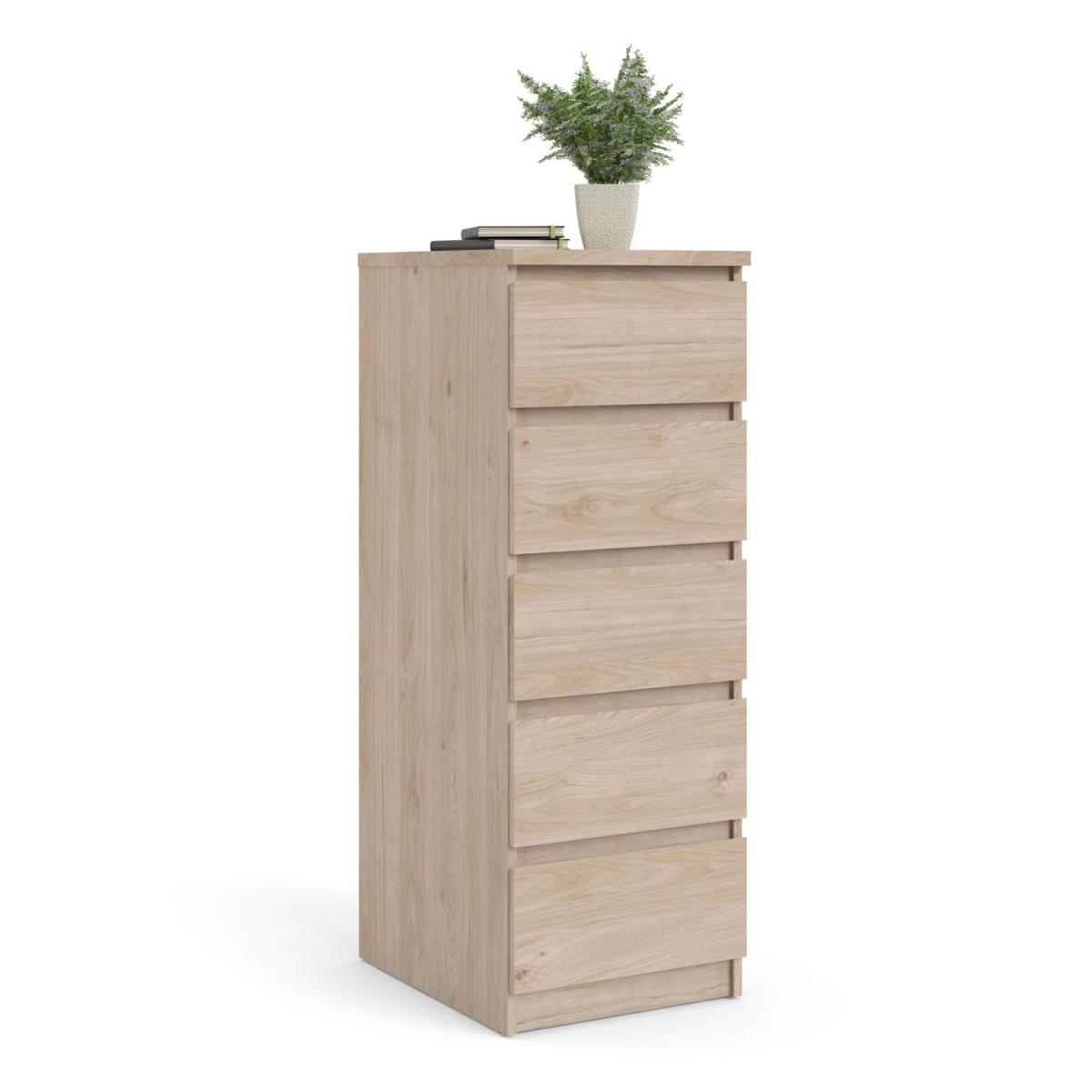 The Naia Narrow Chest of 5 Drawers offers a tribute to timeless furniture design with a modern edge. With convenient storage, Naia can easily fit into your interior and provide the space you need for clothes and more. Perfect for the living room, hallway, or living room, the drawers are finished with a high-quality laminated board that's resistant to damage and scratches, moisture and high temperature for your convenience.