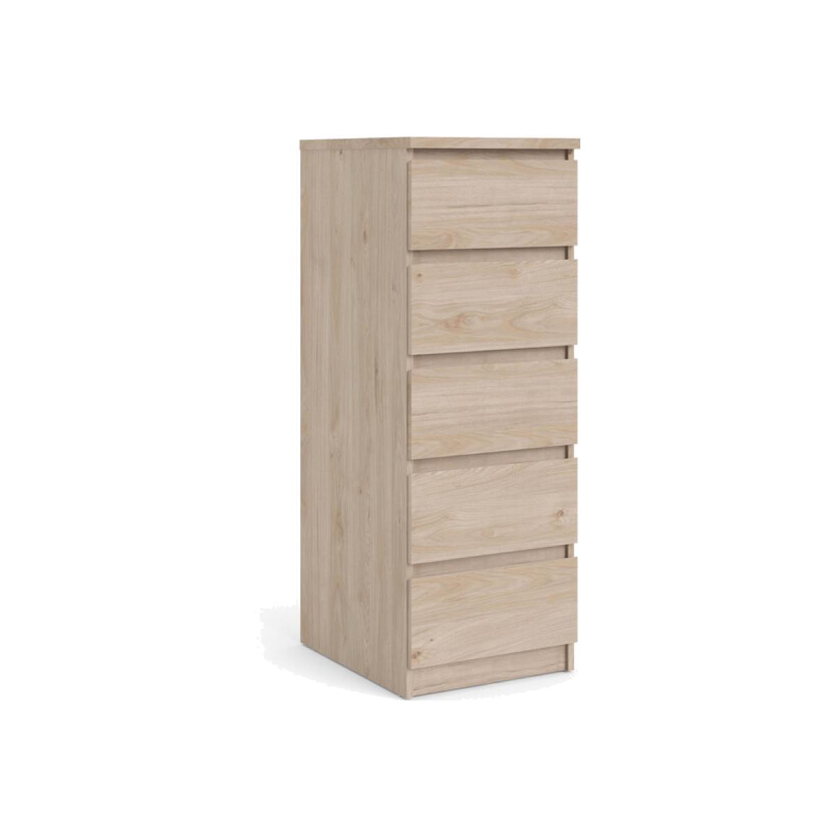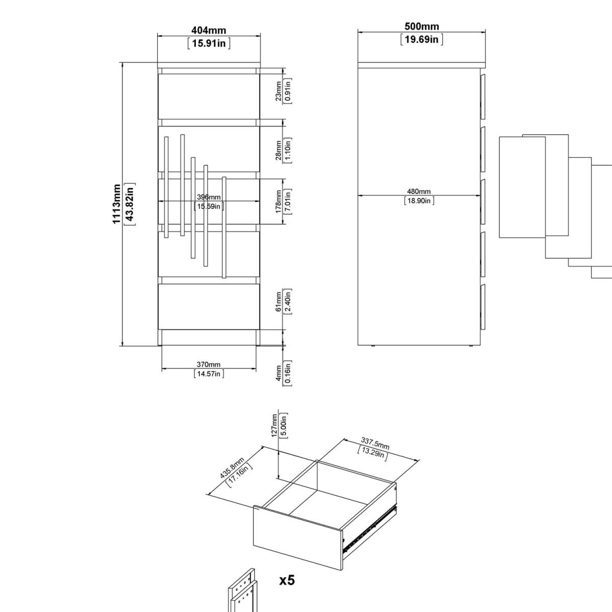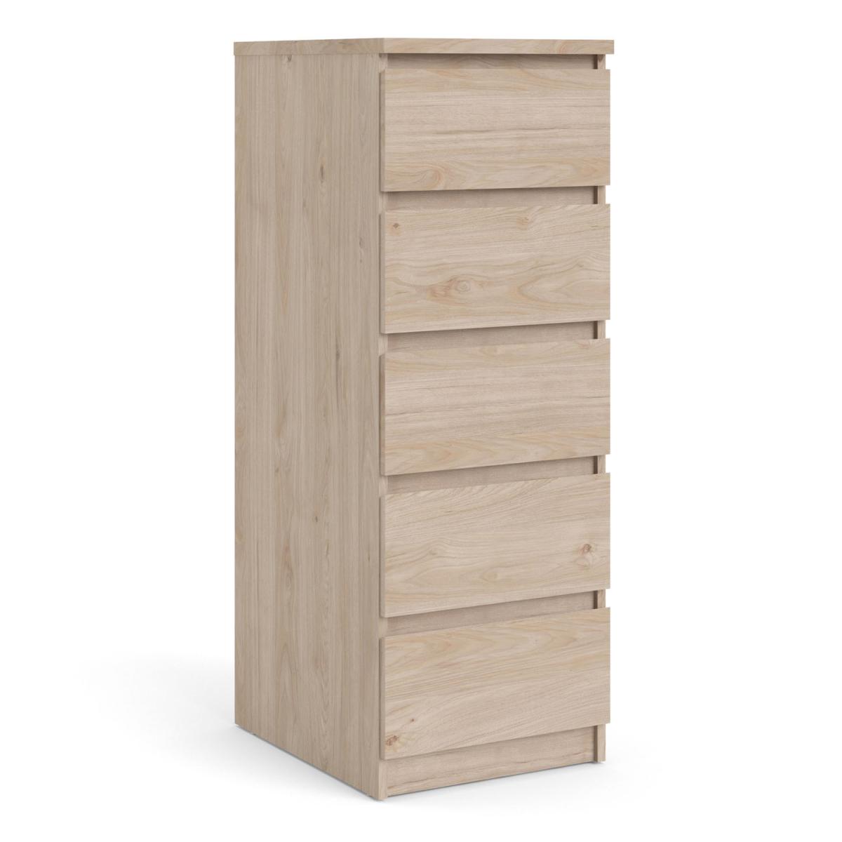 The Naia Narrow Chest of 5 Drawers offers a tribute to timeless furniture design with a modern edge. With convenient storage, Naia can easily fit into your interior and provide the space you need for clothes and more. Perfect for the living room, hallway, or living room, the drawers are finished with a high-quality laminated board that's resistant to damage and scratches, moisture and high temperature for your convenience.