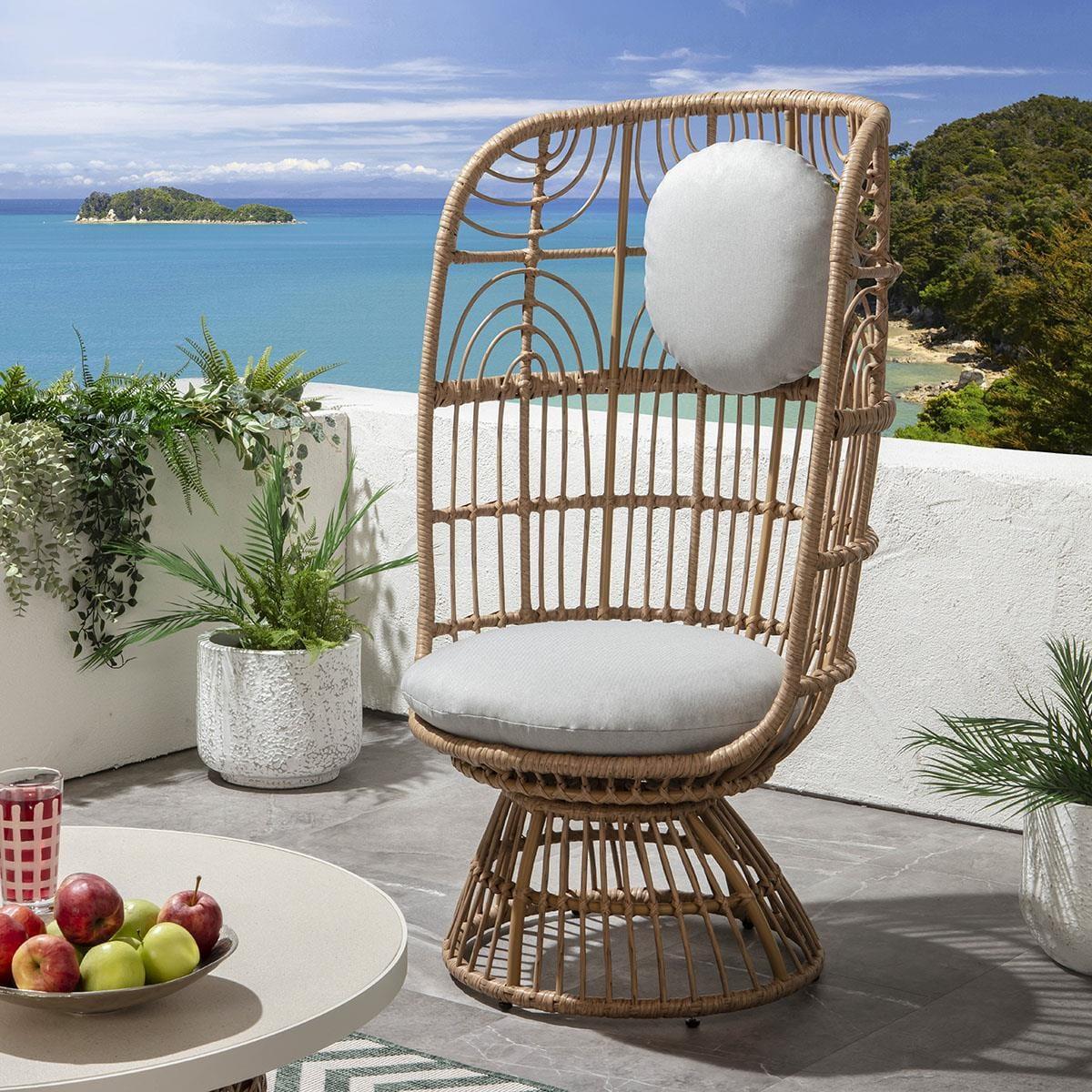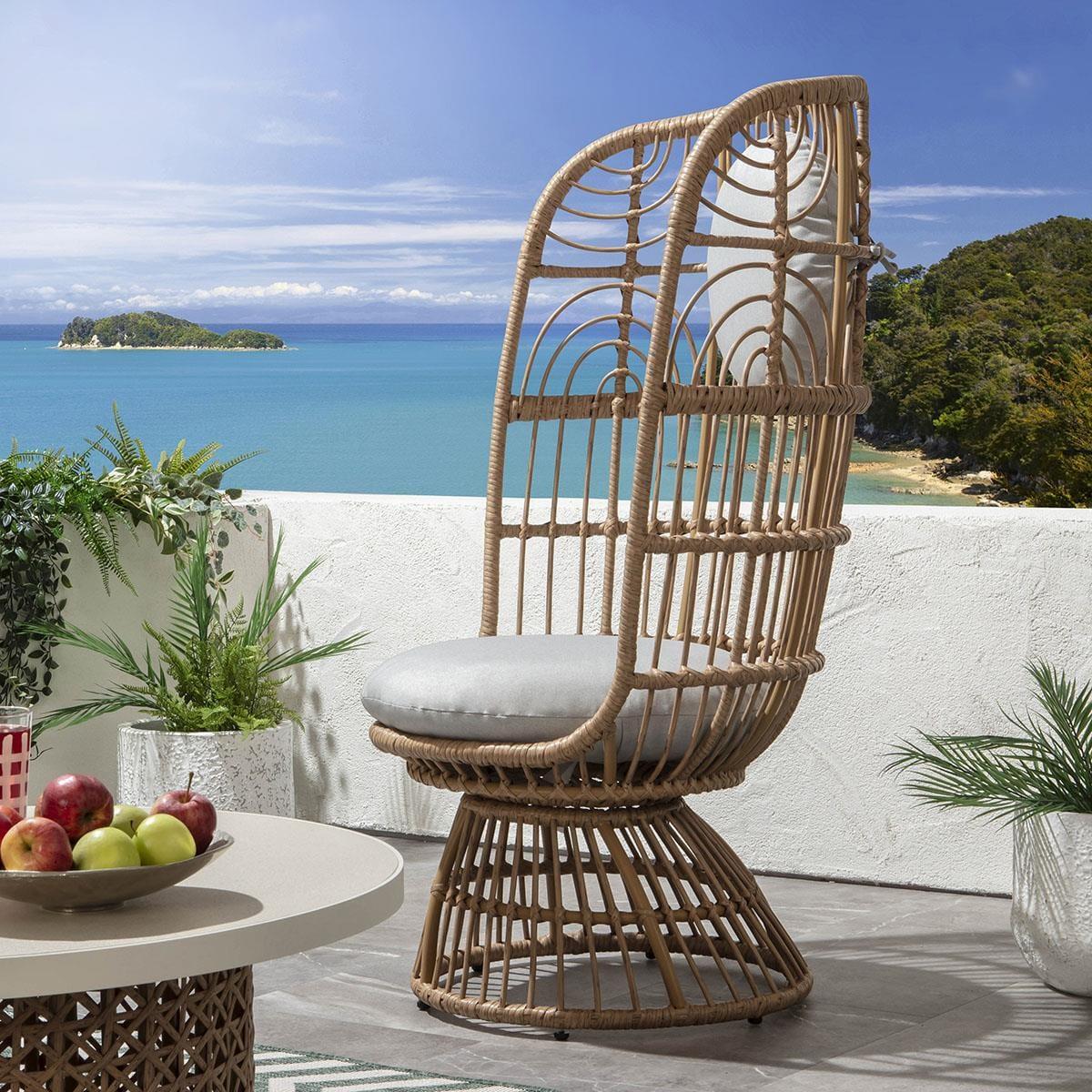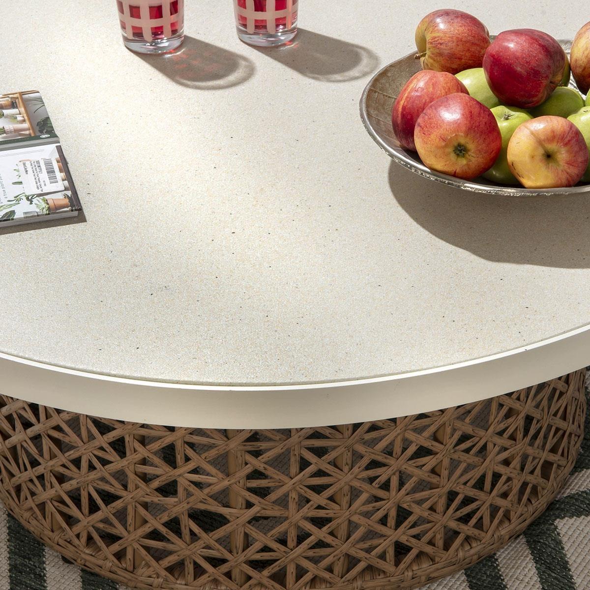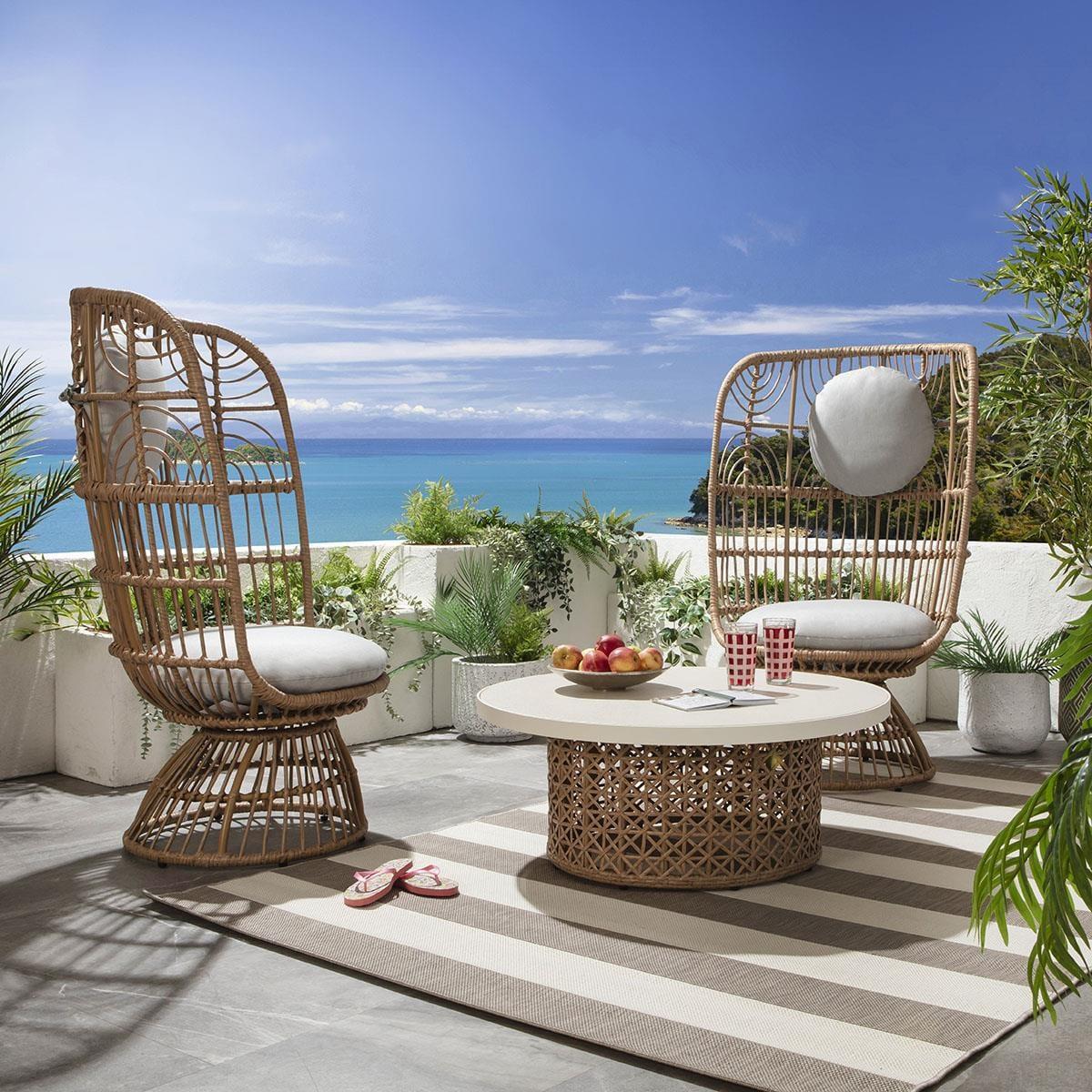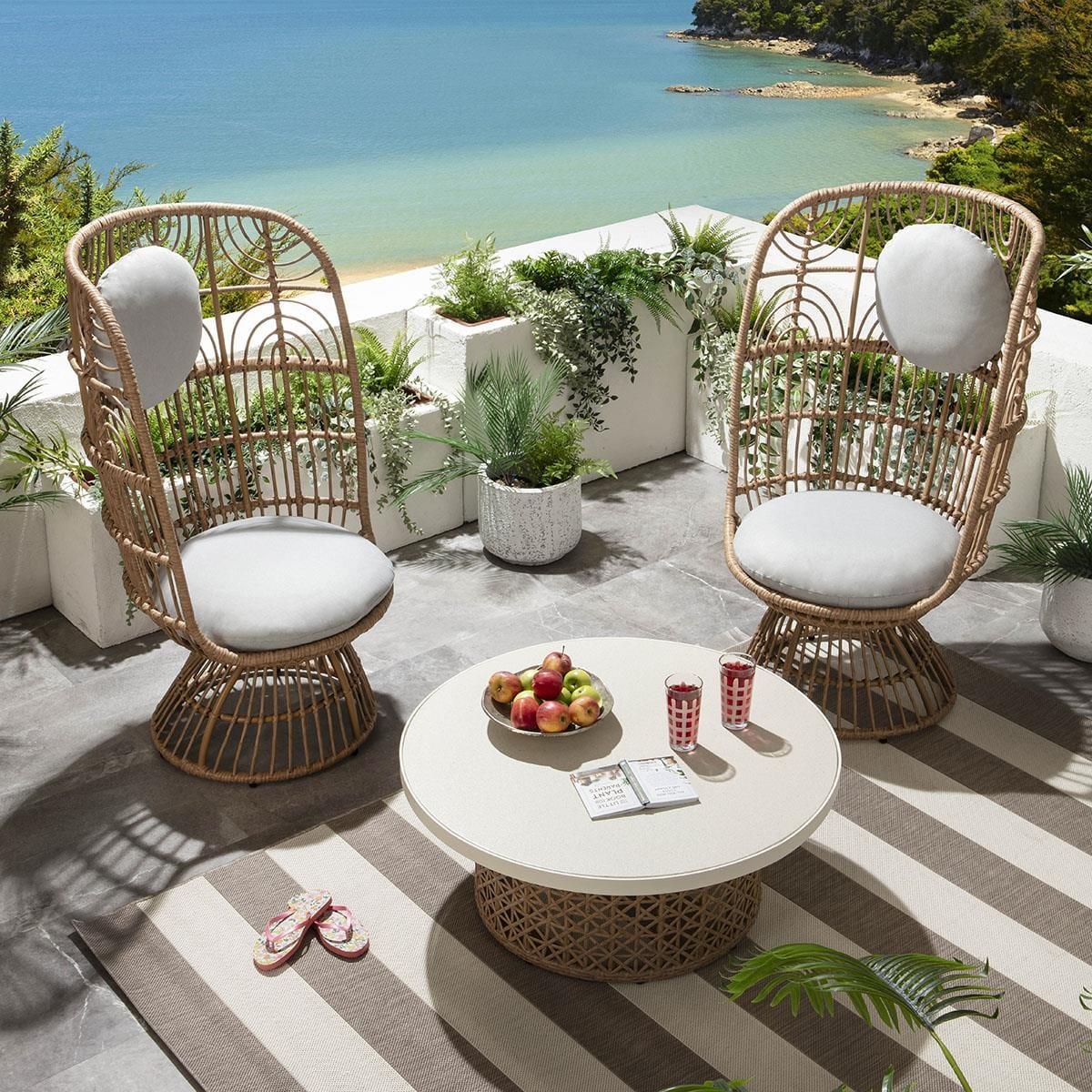 Handcrafted by artisans using traditional methods, this garden chair set features a brown woven rattan cane frame, offering a relaxed and organic look. Upholstered in light grey outdoor fabric, the plush seat cushion ensures utmost comfort. Easily assemble by attaching the base to the seat part. Crafted with precision, the brown woven rattan cane frame of this patio chair set adds a touch of elegance to your outdoor decor. Its traditional handcrafted design guarantees durability and style, making it a perfect addition to any garden or patio setting. Enjoy the natural beauty and timeless appeal of this set which includes 2 x chairs and a coffee table, designed to elevate your outdoor living experience. The 90cm diameter round garden coffee table is a perfect sofa companion. Its tabletop features a textured natural stone finish tempered glass top with a natural stone colour metal trim. Store the cushion of this patio chair set when not in use to maintain its pristine condition. The easy assembly process involves attaching the base to the seat part, allowing you to quickly set up your outdoor seating area. Table; W90cm H370 Chairs; W78cm D74cm H1260cm Seat Height 45cm