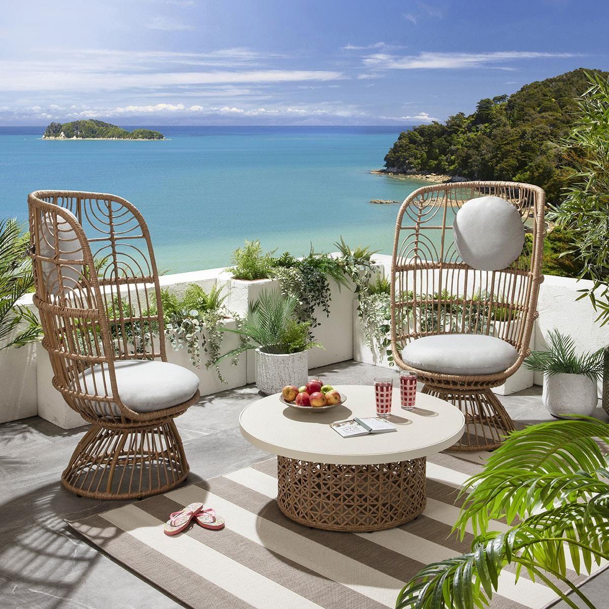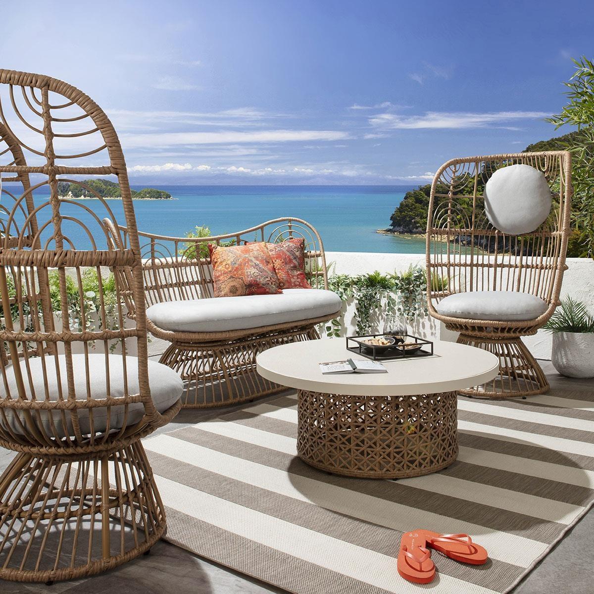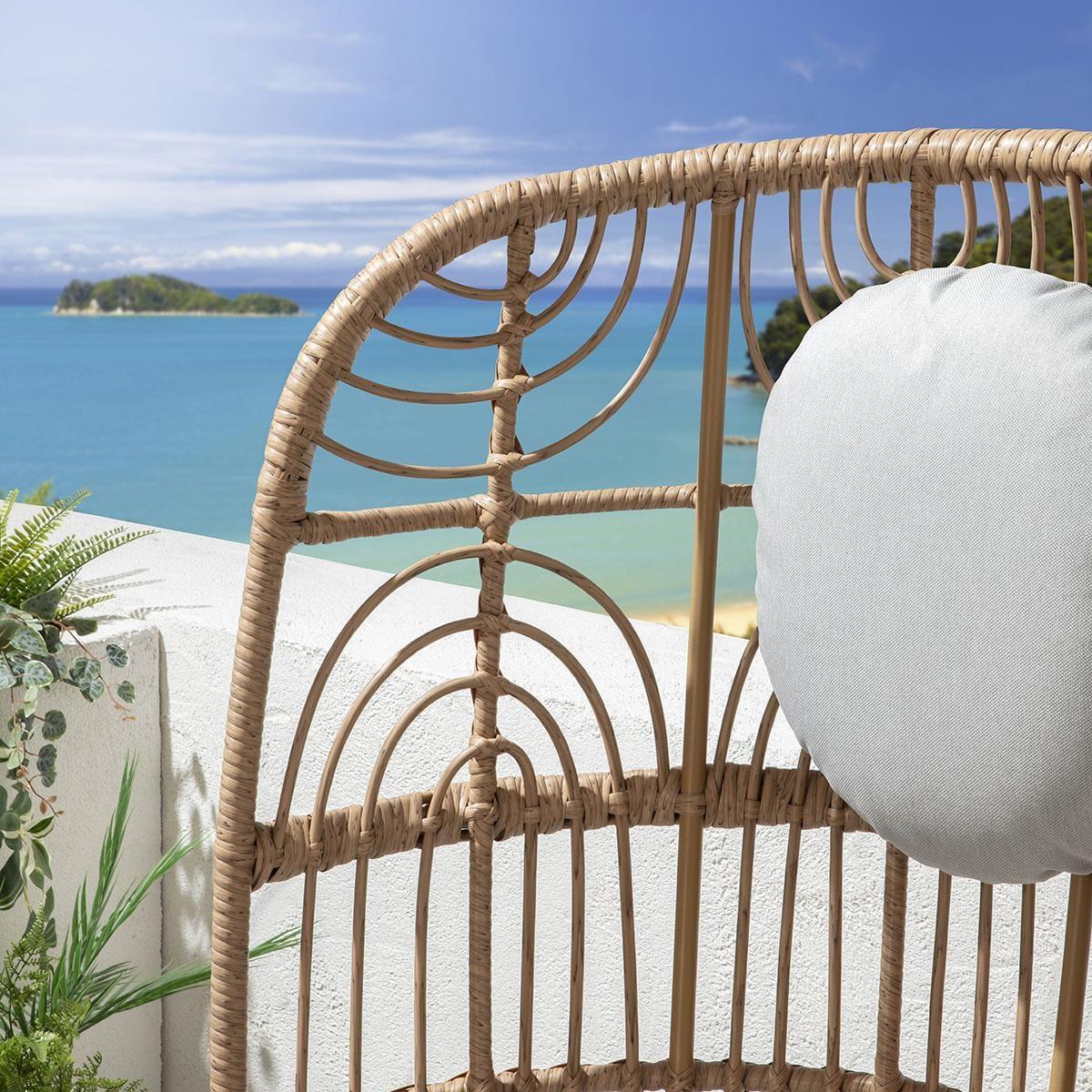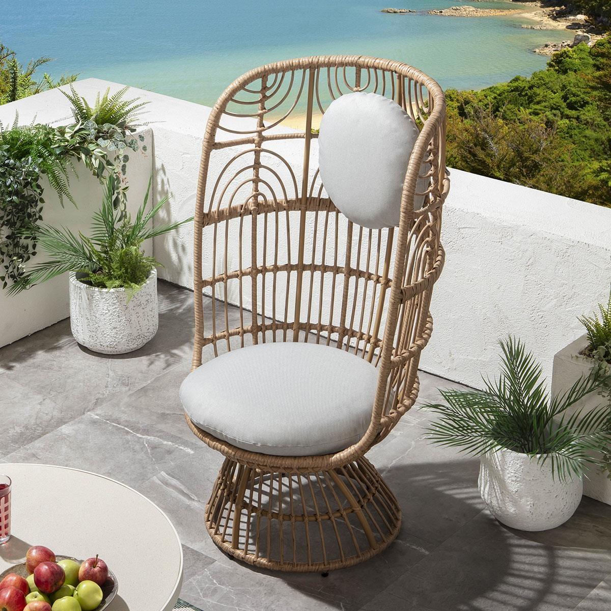 Handcrafted by artisans using traditional methods, this high back rattan garden armchair features a brown woven rattan cane frame, offering a relaxed and organic look. Upholstered in light grey outdoor fabric, the plush seat cushions ensure utmost comfort. Easily assemble by attaching the base to the seat part. Crafted with precision, the brown woven rattan cane frame of this garden chair adds a touch of elegance to your outdoor decor. Its traditional handcrafted design guarantees durability and style, making it a perfect addition to any garden or patio setting. Enjoy the natural beauty and timeless appeal of this accent chair, designed to elevate your outdoor living experience. Indulge in luxury with the plush seat cushions. Wrapped in light grey outdoor fabric, the cushions offer a cosy seating experience while complementing the brown woven rattan cane frame. Whether lounging with a book or entertaining guests, this garden armchair provides unmatched comfort and sophistication for your outdoor relaxation. Store the chair cushions when not in use to maintain its pristine condition. The easy assembly process involves attaching the base to the seat part, allowing you to quickly set up your outdoor seating area. W78cm D74cm H126cm Seat Height 45cm Crafted from weather and UV resistant rattan cane
