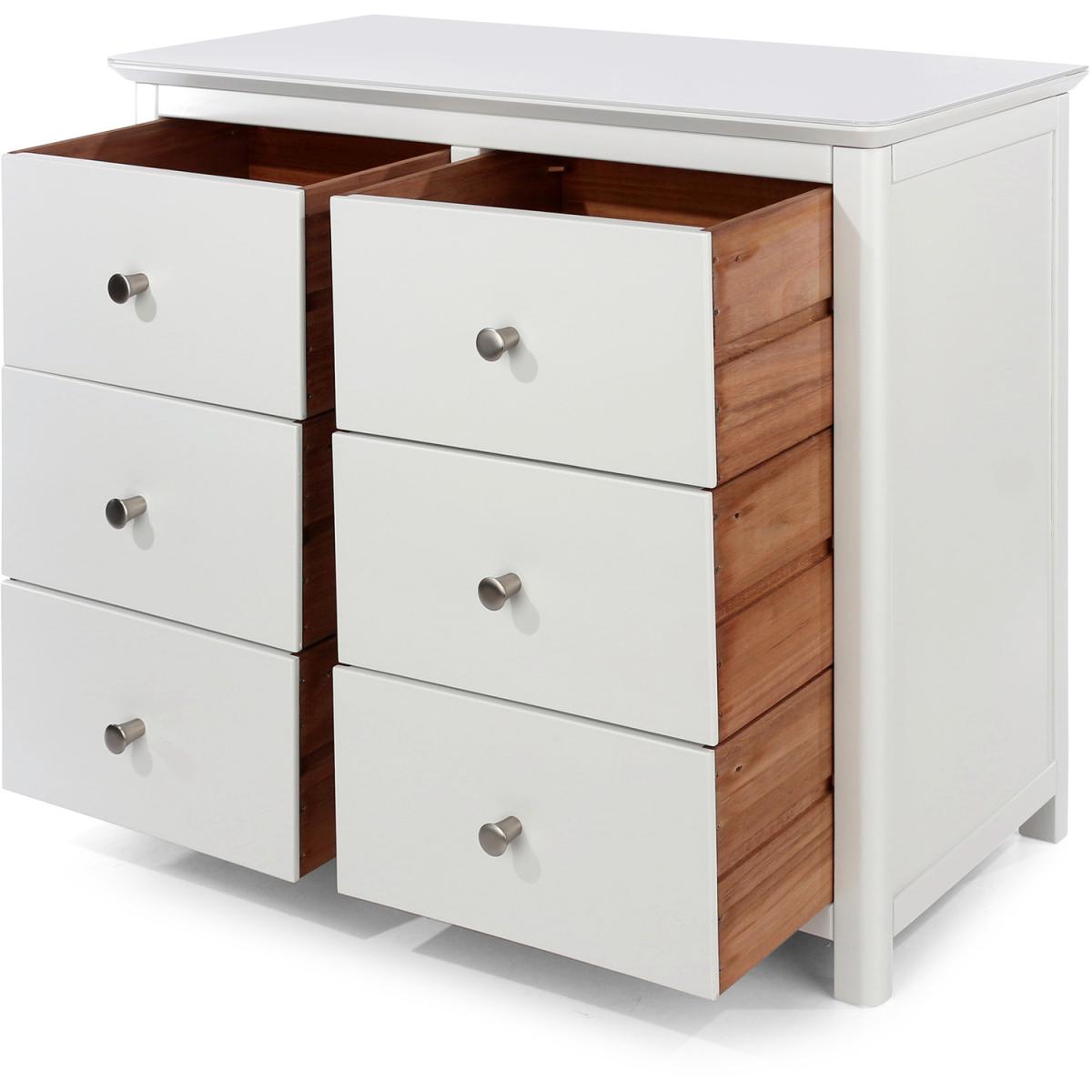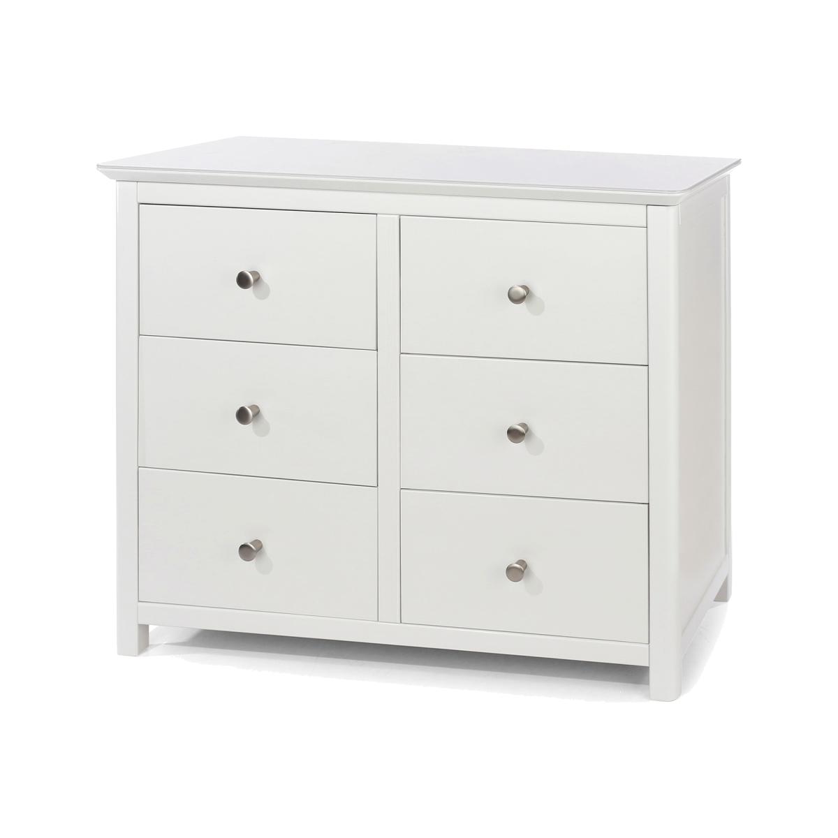 The Nairn bedroom collection is a modern contemporary interpretation on a traditional design in a luxurious white paint finish with the added feature of easy to clean glass tops. The glass top is toughened and bonded to the cabinet for your safety, it has a smooth polished edge and a special paint on the underside to compliment the cabinet and therefore forms an integral part of your furniture. The finishing touch is stylish polished steel convex shaped handles. The Nairn range is manufactured using traditional cabinet making construction techniques, which for ease of delivery are packed flat. Its designed to be as easy as possible for you to build with no complicated fittings or special tools required. The Nairn 3 plus 3 double wide chest of drawers is a real statement piece for your bedroom. It offers two sets of three deep drawers neatly laid out alongside each other, so it's easy to share the storage space if you need to. The drawers offer plenty of space to keep jumpers, clothing, towels or bedding organised.