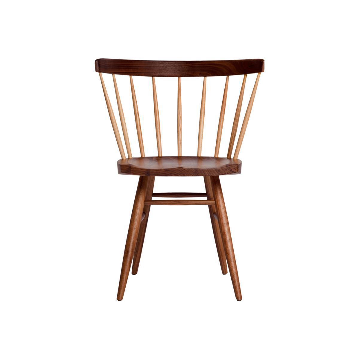 Originally designed by George Nakashima in 1948, the Nakashima Straight Chair would enhance any dining area with its clean lines and expert craftmanship. Crafted from solid American walnut with contrasting hickory wood spindles, the Nakashima Straight Chair is unique in its respect for the natural forms of the tree and its natural graining. Finished and authenticated with George Nakashima's signature underneath the seat, this shaker influenced chair is sure to lend a touch of classic design to any space. Master woodworker and highly skilled architect George Nakashima was one of the leading innovators of 20th century furniture design.
