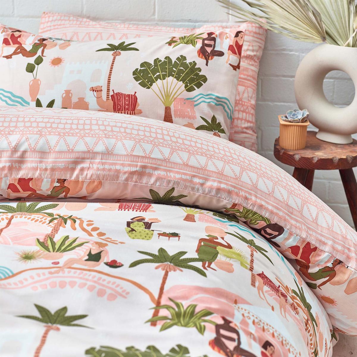 Featuring a scene of harmonious women in a dreamy dessert printed on this duvet set in neutral pink and earthy tones. This serene dessert scene and abstract pattern combination design is great for versatility with its reversible feature and matching pillow. The calm and playful illustrations will create serenity in any room while machine washable properties allow easy maintenance and the composition of crisp polycotton provides a soft and hard-wearing feel.