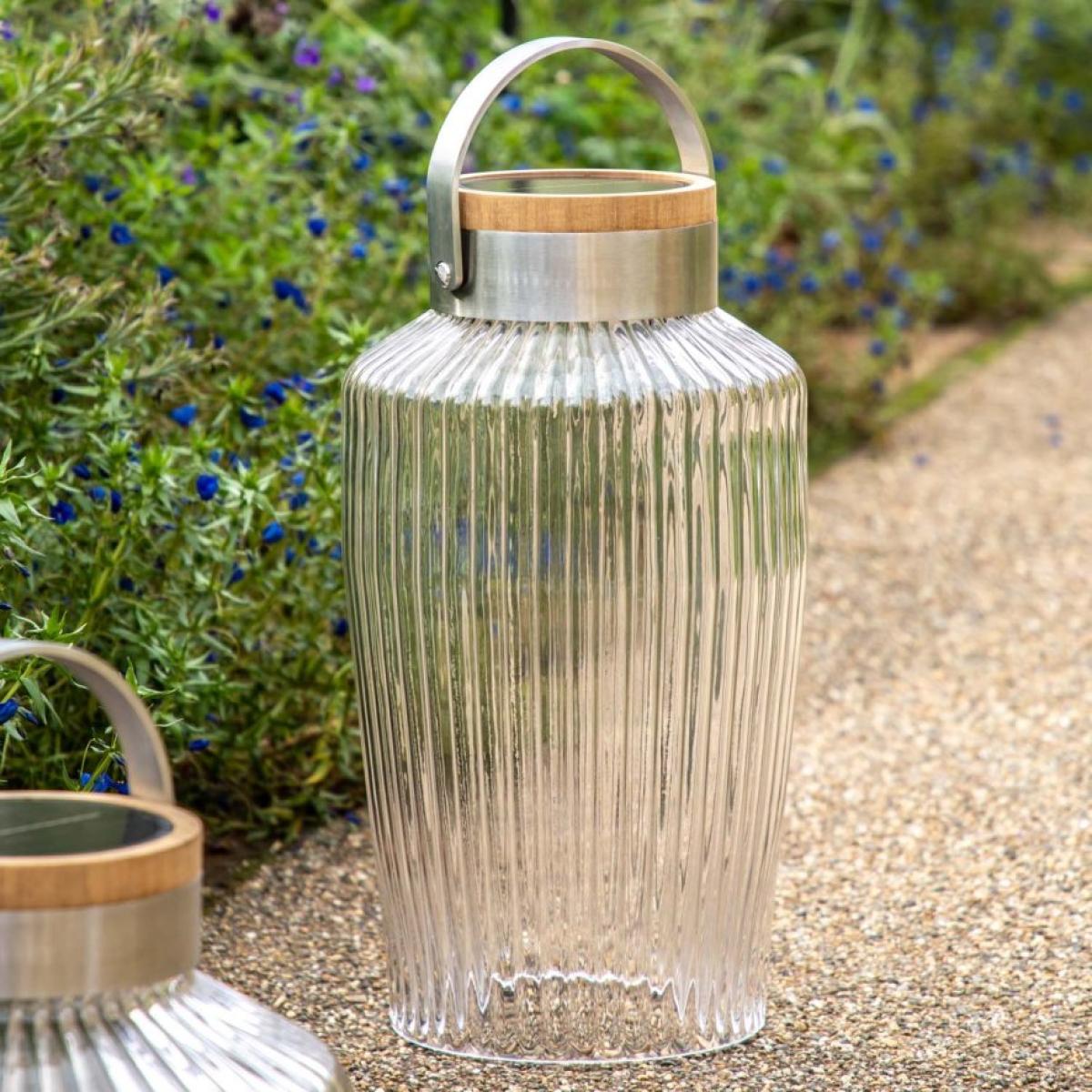 The Nalon LED Solar Lantern will wive a little glow and ambience to your outside space this Summer. Thanks to the aluminium handle, this garden accessory is easy to position wherever you need it. The ridged glass lamp is powered by a solar panel embedded in the teak wood top. With 3 light intensity settings, the lamp can run for up to 5 hours on the brightest setting, up to 8 hours on the middle setting, and up to 12 hours on the lowest setting, after charging by direct sunlight. It can also be charged by USB charger not included, which gives up to 32 hours of light on the brightest setting, and up to 60 hours on the lowest. *Dimensions: W26.7cm x D26.7cm x H48.2cm *Made From Glass, Stainless Steel, Aluminium, ABS, and Solid Teak *Available in large and small. *3 light intensity settings *Can be charged via USB charger not included