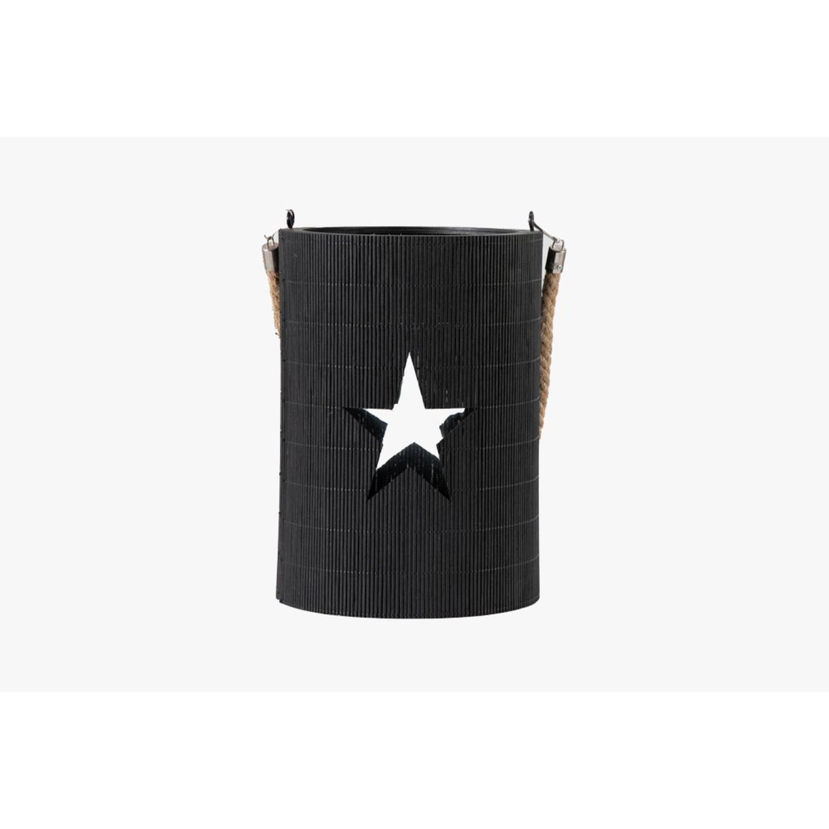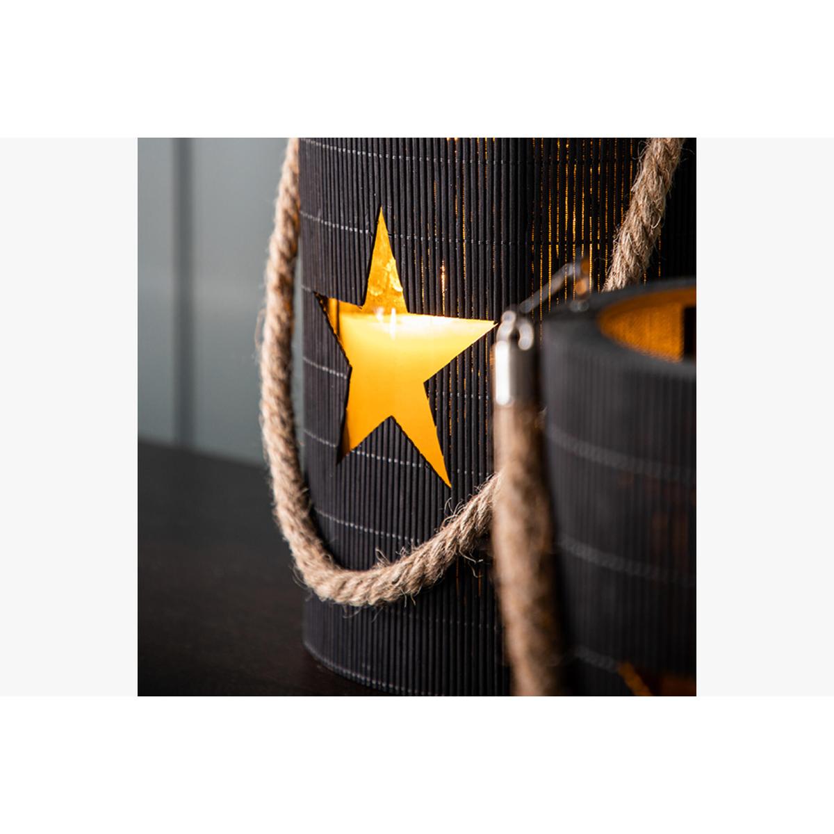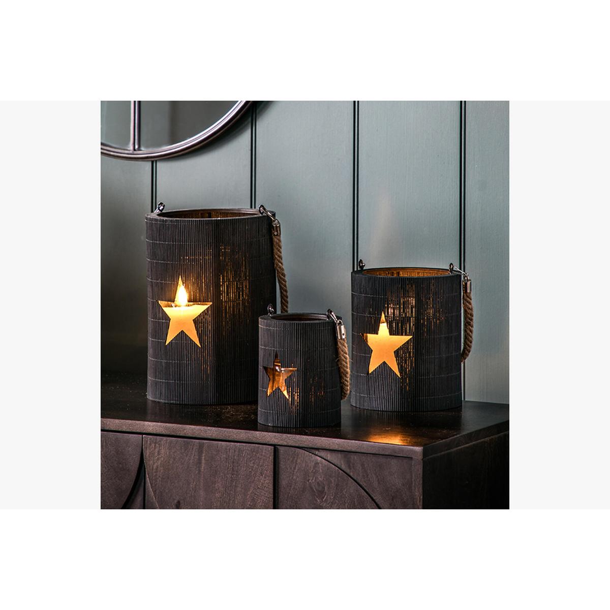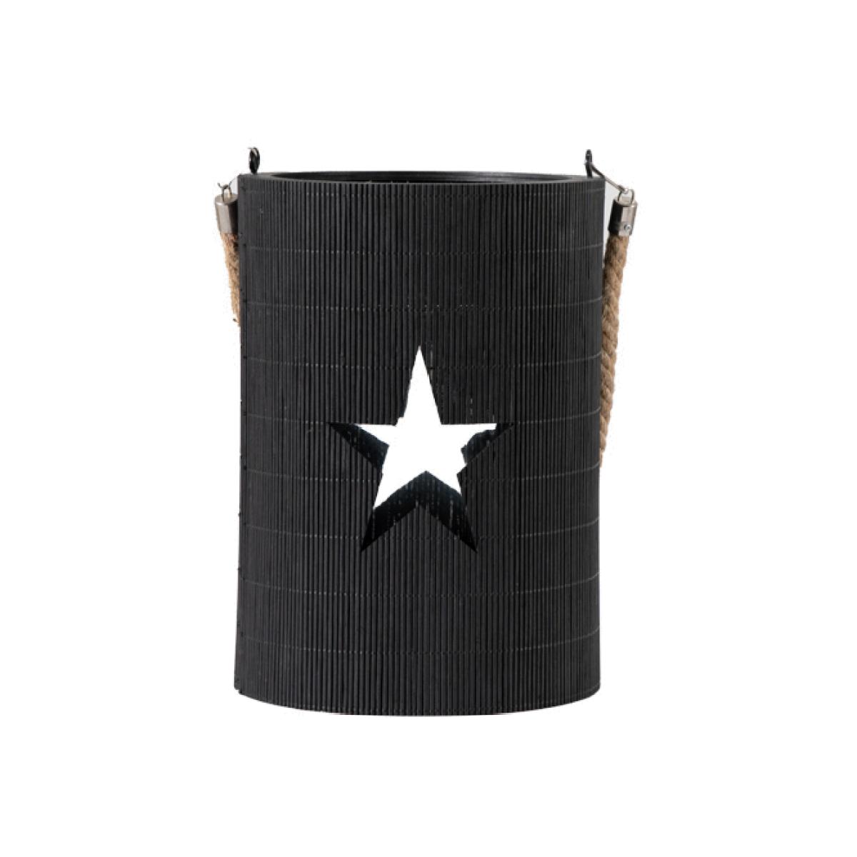 Understated cosiness perfect for adding rustic charm to your room. With striking black bamboo encasing a glass lantern and a stunning star cut out, all finished off with a rustic rope handle The Namid lantern gives your room a warm festive glow.