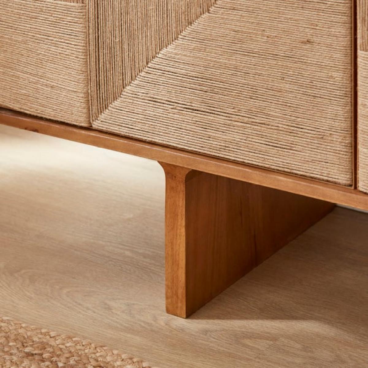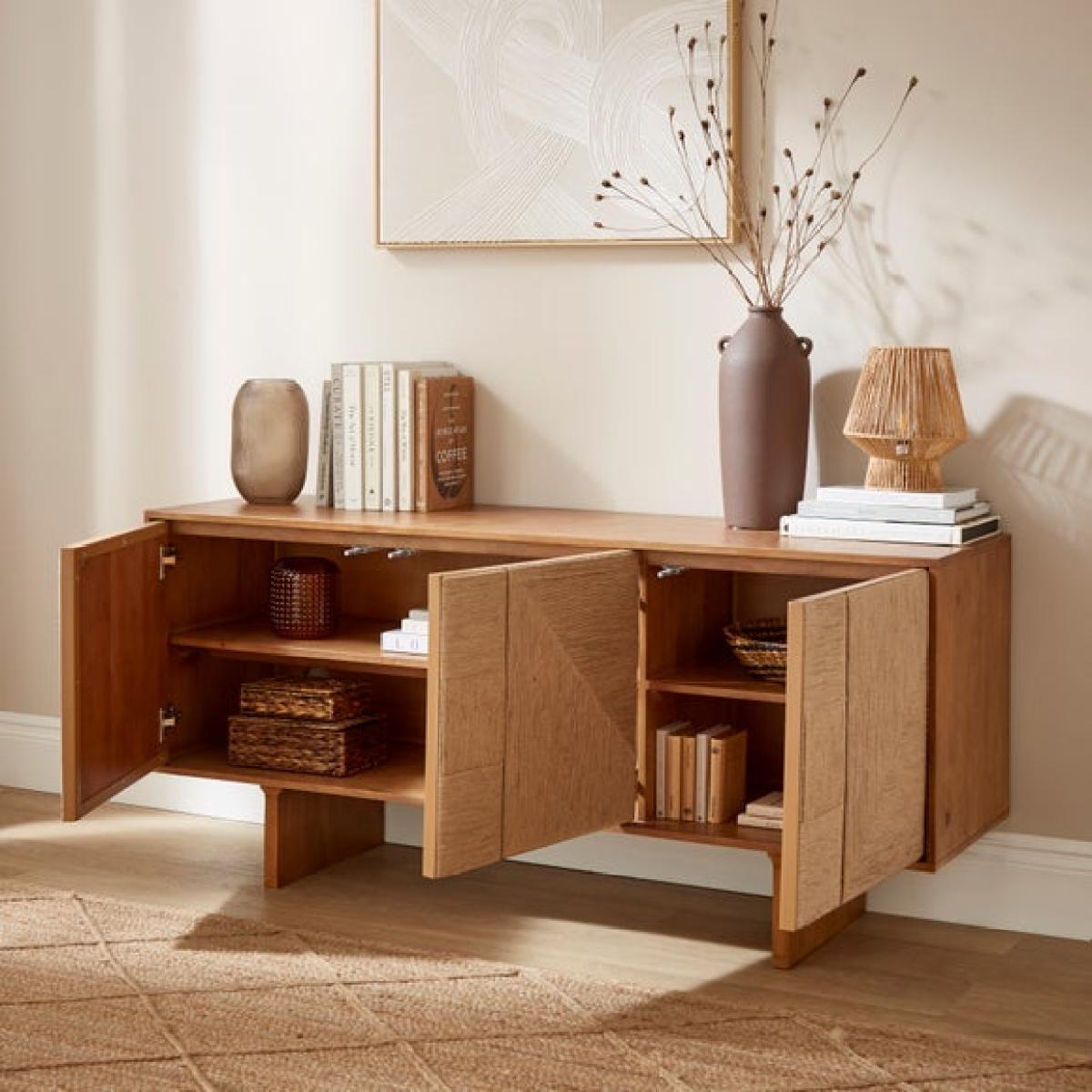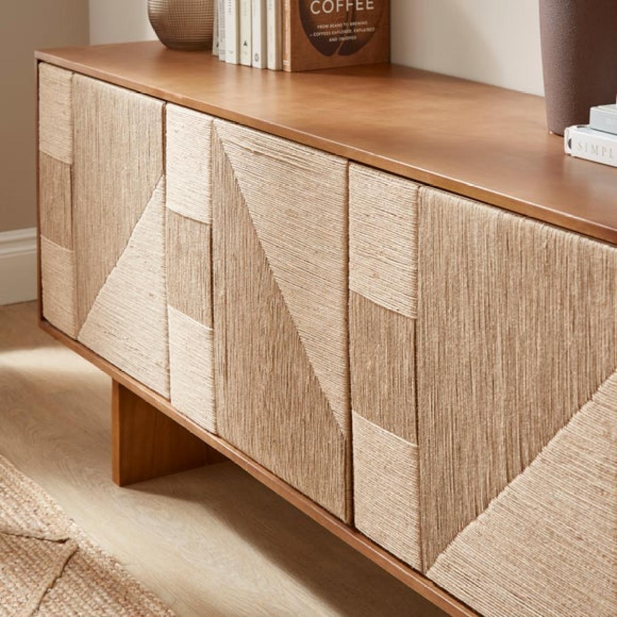 * Extra wide mango wood sideboard * Jute‑woven door panels * Push‑to‑open doors * Spacious storage * Cable management included The Nancy Extra Wide Sideboard blends the warmth of mango wood with tactile jute‑woven doors for a beautifully layered aesthetic, while push‑to‑open doors and built‑in cable management keep the design clean and practical, offering spacious storage that works seamlessly in both living and dining spaces.