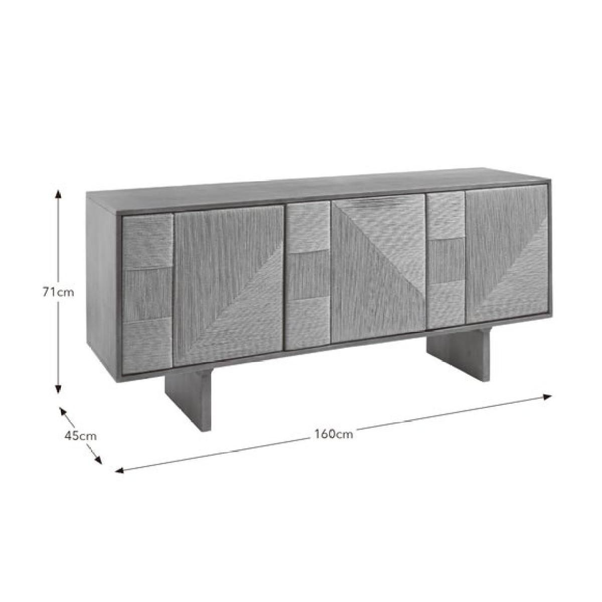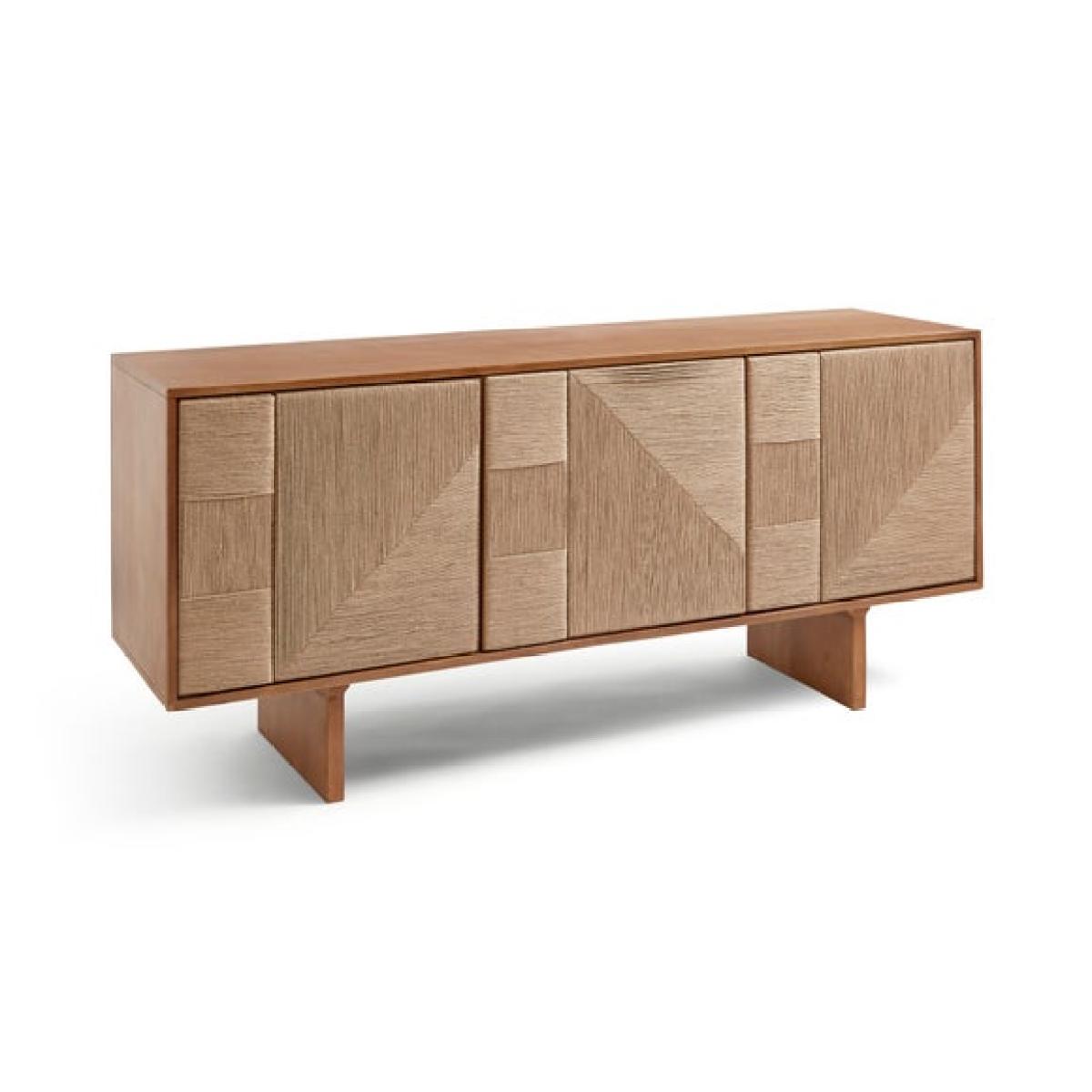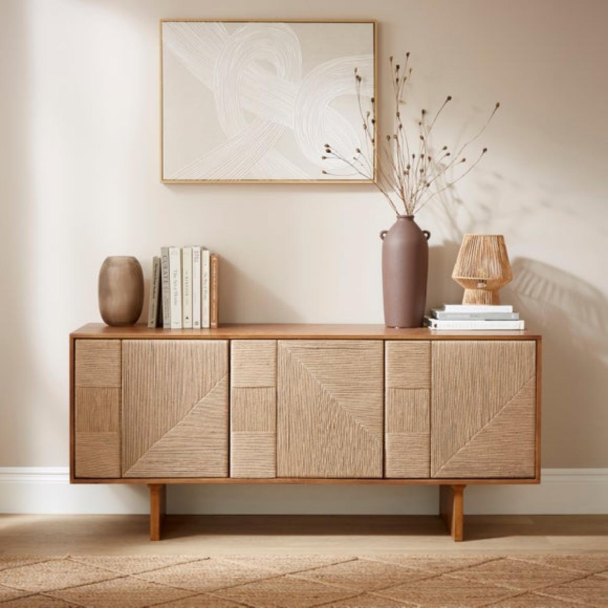 * Extra wide mango wood sideboard * Jute‑woven door panels * Push‑to‑open doors * Spacious storage * Cable management included The Nancy Extra Wide Sideboard blends the warmth of mango wood with tactile jute‑woven doors for a beautifully layered aesthetic, while push‑to‑open doors and built‑in cable management keep the design clean and practical, offering spacious storage that works seamlessly in both living and dining spaces.
