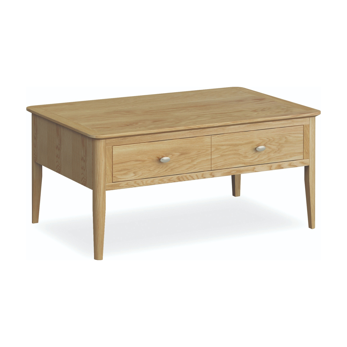I love this coffee table for its clean, understated design and warm oak tone, which adds a natural touch to both modern and traditional interiors. It works especially well in scandinavian, farmhouse, or minimalist schemes, where its simple lines and light finish complement neutral palettes and layered textures. Practical styling tips include keeping the surface clutter-free with a few sculptural books, a tray with candles or a small plant, and perhaps a cosy throw draped on the lower shelf. Its size and shape make it versatile for various living room layouts, and the drawers are perfect for storing essentials like coasters or remote controls, keeping the overall look tidy.