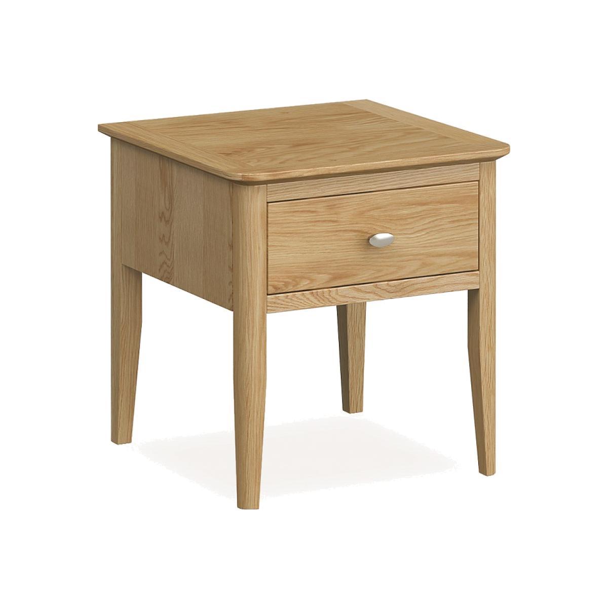 The Nancy lamp table has a lacquered oak top with a pale oak finish to the rest of the piece. Featuring one drawer with a simple silver pull handle. The softened corners of the top provide a cosy feel, yet the clean lines and pale oak add asimple modern twist.