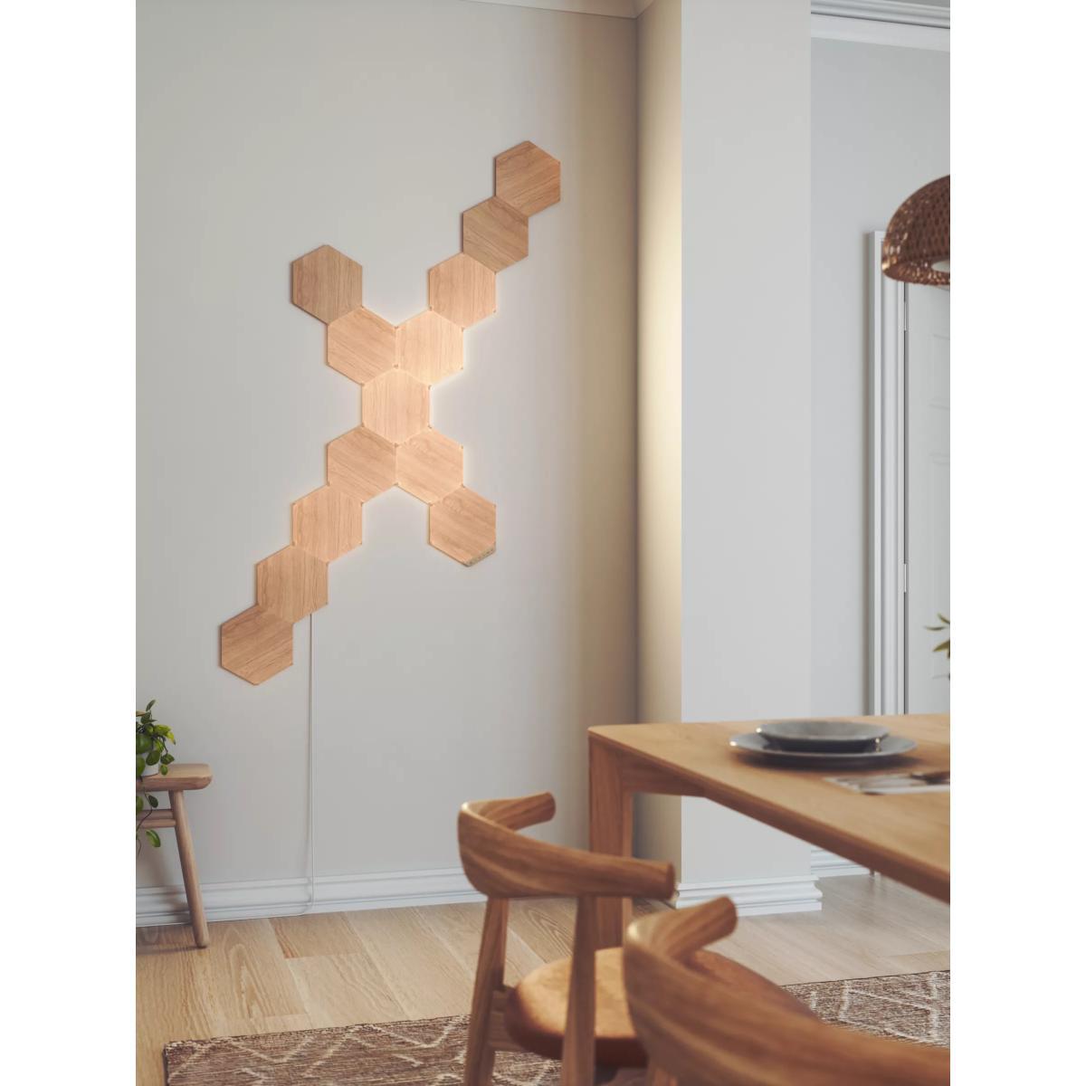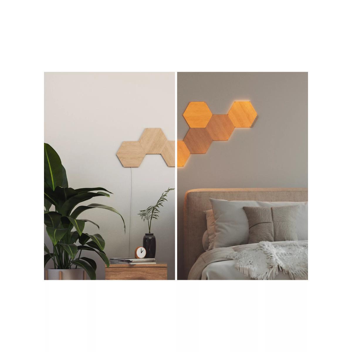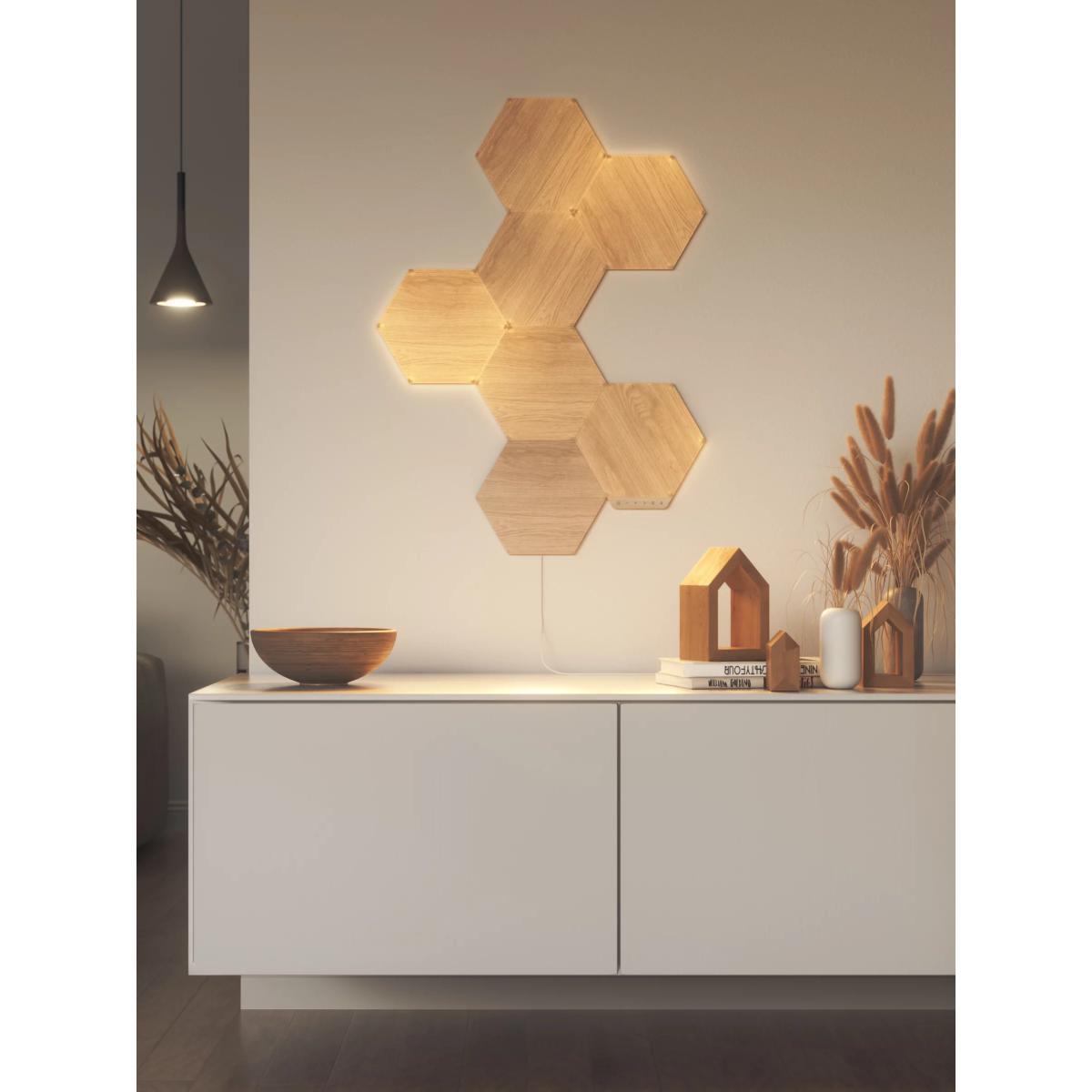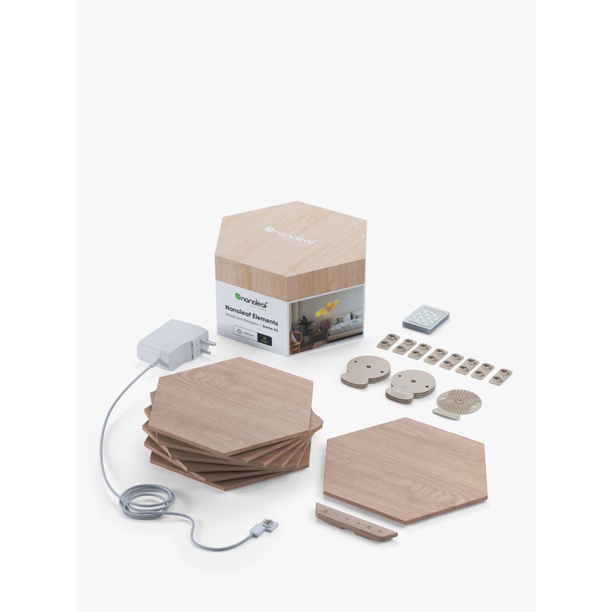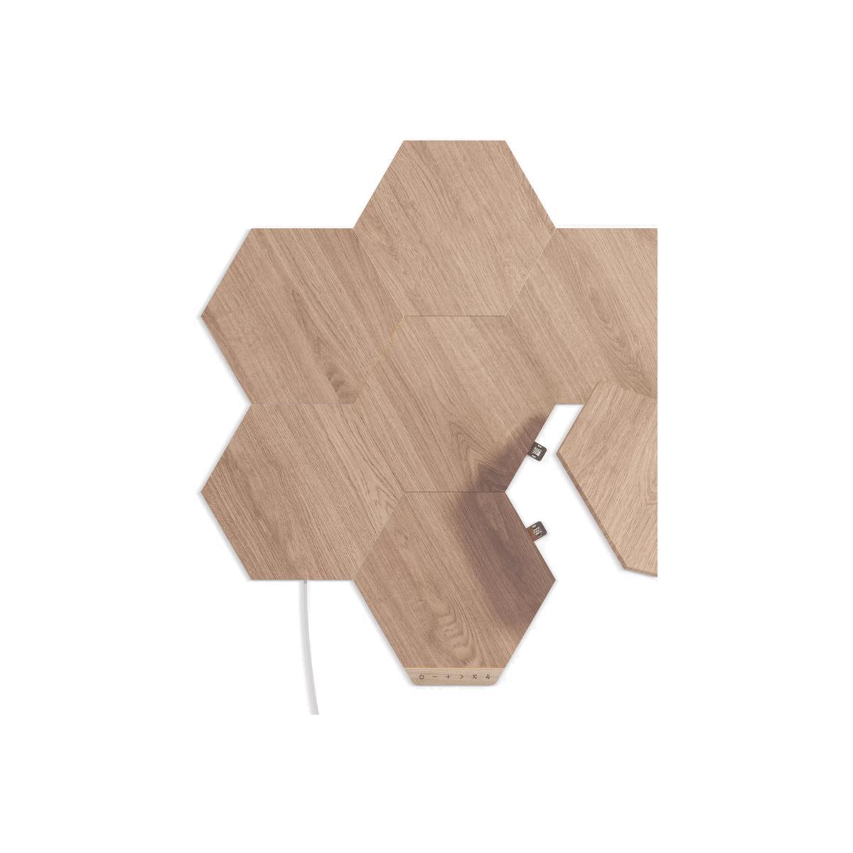 The Nanoleaf Elements Hexagons are seven wood-look, modular LED light panels that will add an elegant and organic feel to your home. Both beautiful wall art and customisable ambient lighting when it's on or off. Thanks to a combination of smart technology and sleek, ultra-thin design, they're easy to install and mount to the wall using the included adhesive mounting tape. Choose from a range of warm-to-cool lighting options to enhance your space with a natural glow and simply control it using the touch buttons, with additional smart customisations possible using the Nanoleaf App. Key features: Nanoleaf Elements comes with 11 curated light Scenes. From Calming Waterfall to glowing Ember, gently fill your space with a dynamic glowing illumination to set the ideal ambience Turn on Rhythm Music Sync to pair the lights perfectly with your favourite music playlist Personalise your layout and use the panels to create a captivating statement wall Set the ideal ambience with adjustable warm and cool whites at a temperature range of 1500-4000. K, to fill your home with soft illumination Enjoy touch-enabled experiences. Touch a panel to ignite a dynamic glow across your layout or play your favourite music and see panels dance along to the melody Enjoy full customisation with the compatible App, free to download on Android, iO. S and Desktop. Create scenes, set light schedules, or share your scenes with the user community Compatible with Apple Home. Kit, Amazon Alexa, Google Assistant and Samsung Smart. Things and will respond to simple voice commands What's included: Universal power supply unit (120 VAC- 240 VAC) x7 wood look hexagon panels x7 mounting plates x8 linkers to connect the panels and Controller Controller Double-sided adhesive mounting tape Quick start guide