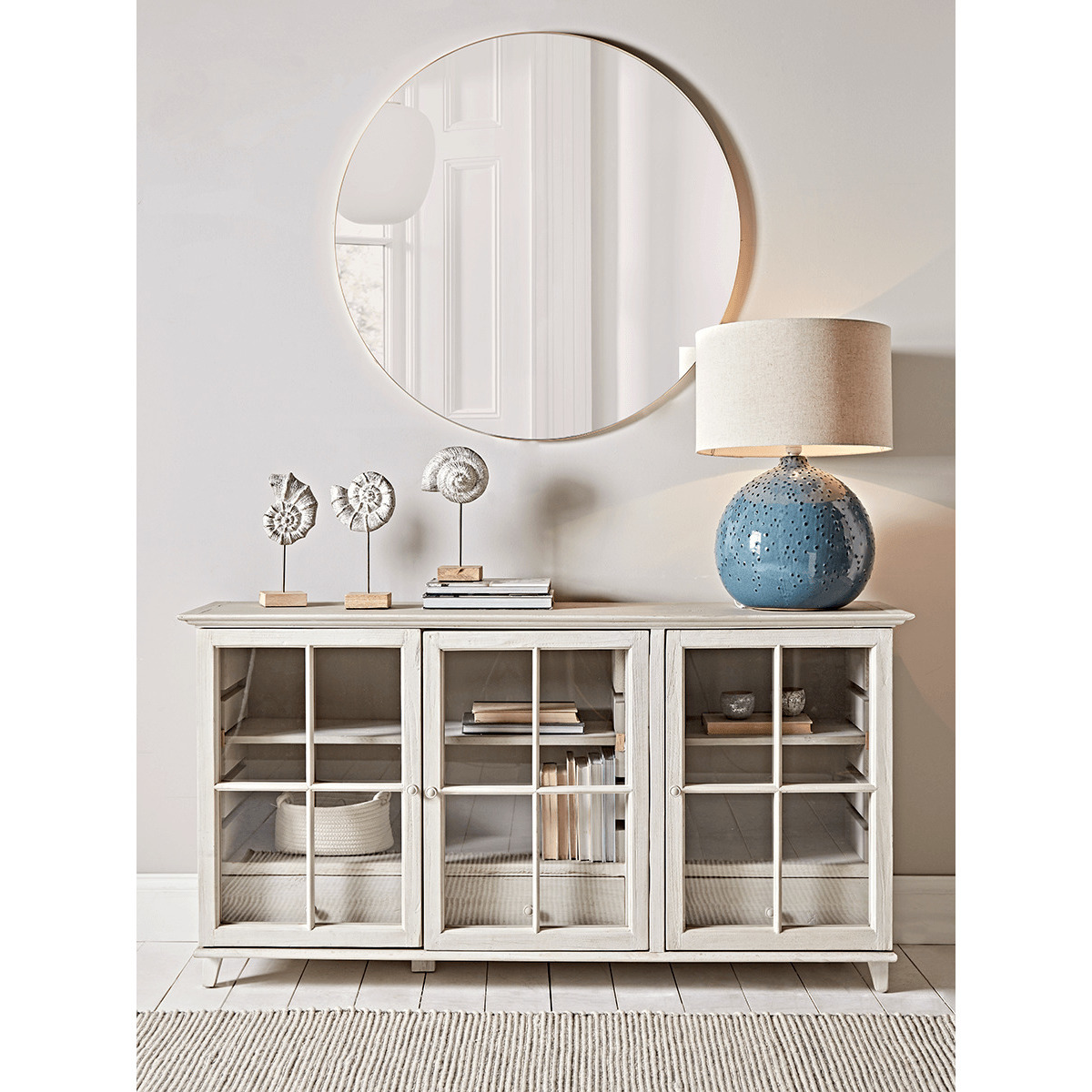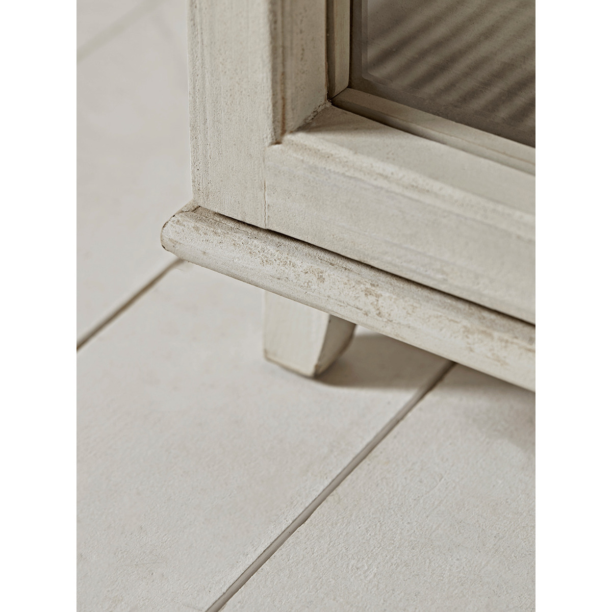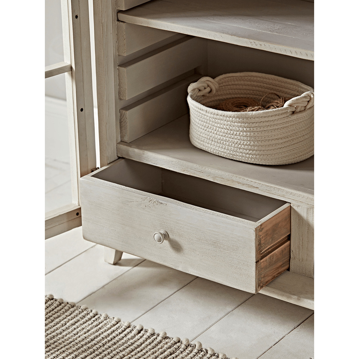 Our Nantes Sideboard speaks of the interior of a coastal retreat, white washed and airy, with a laid back quality. Crafted from repurposed pine in a white wash finish, each piece has unique markings for a natural, aged feel. Three window framed glazed doors feature to the front of the piece, to ample cupboard space beyond for both storage and display. Within each is a wonderful adjustable shelf system, and generous bottom drawer, all crafted from solid wood. Finished with a corniced top and wooden legs, this is a practical addition to the home guaranteed to add centrepiece style. Our. Nantes Cabinet. Is also available in this range.