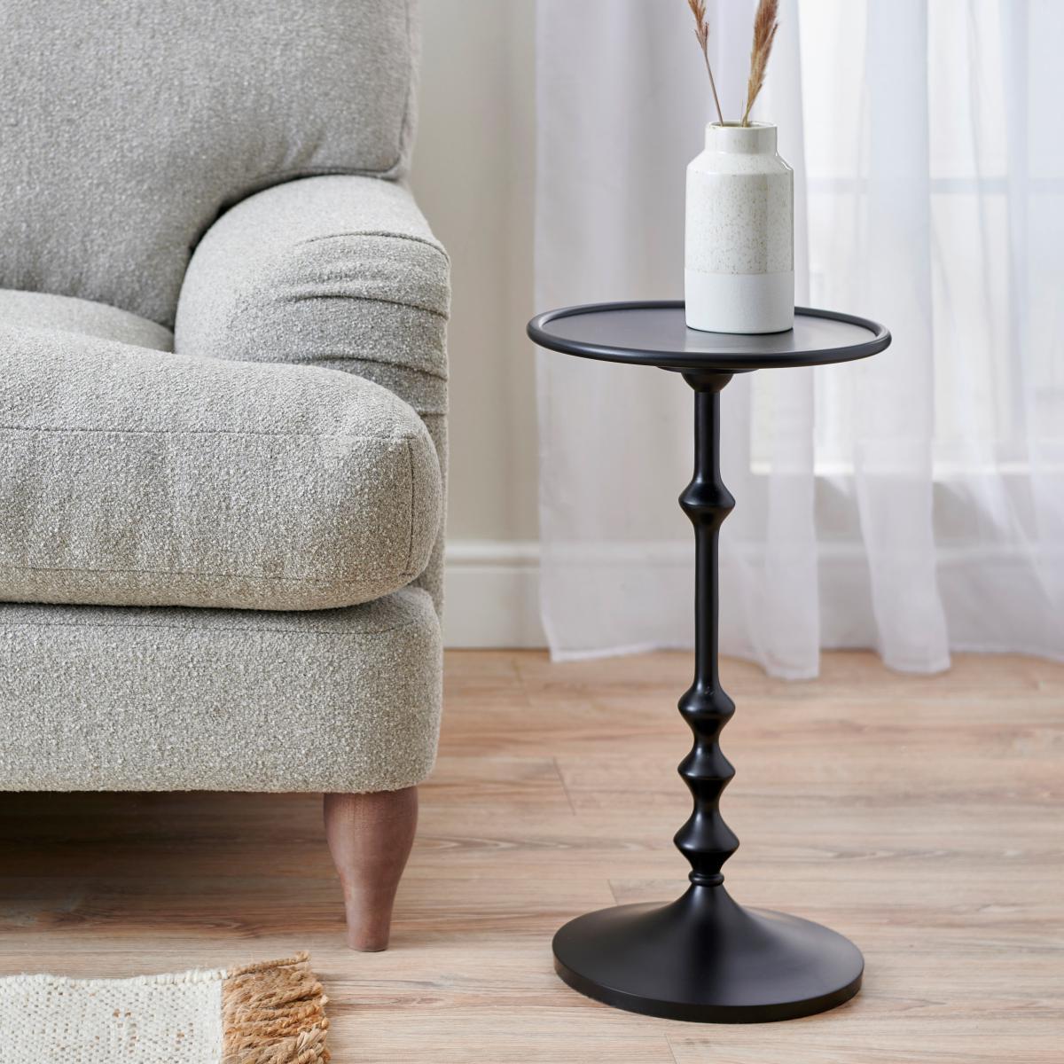 I love this little side table for its sleek, minimalist design that works well in a variety of interiors, from modern and contemporary to more eclectic schemes. Its black finish makes it a versatile piece that can anchor a corner without overpowering the space. It’s perfect for small spaces or as an accent piece alongside a sofa or armchair, providing both function and style. Practical styling tips include layering it with a small tray for organising essentials or adding a decorative object like a vase or candle to bring visual interest. Keep in mind that its slim profile makes it ideal for placing next to seating where space is limited, offering handy surface area without cluttering the room.