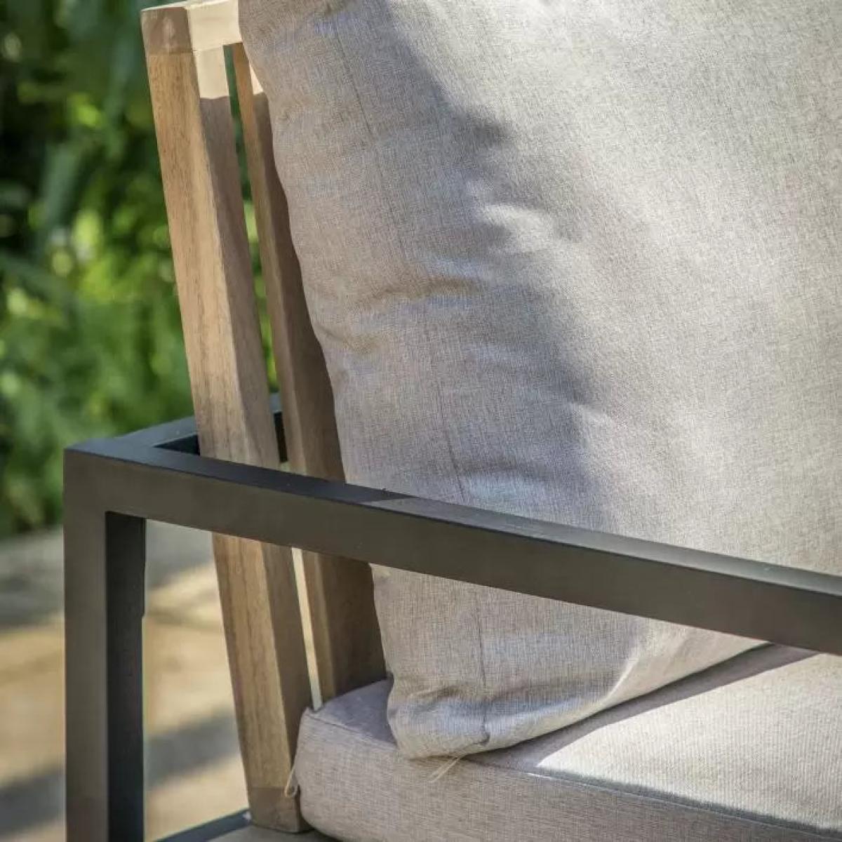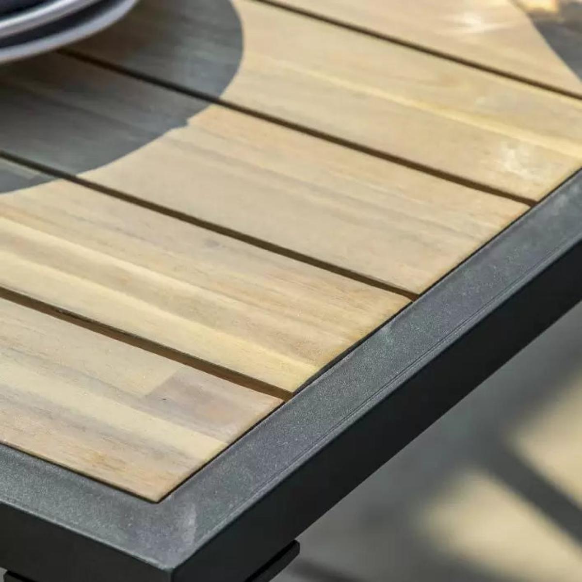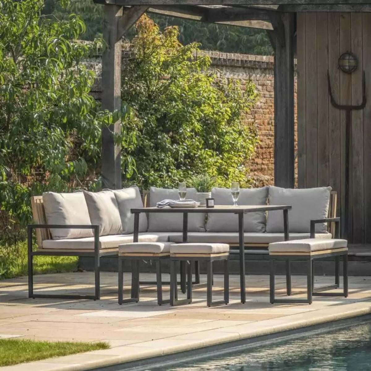 Perfect for BBQ's this corner dining set is just what you need to relax and enjoy the summer evenings. There's plenty of seating with 2 single stools, a dining bench and a corner sofa finished with comfortable grey cushions around modern a dining table, all made from Acacia wood with a simple black powder coated metal frame.