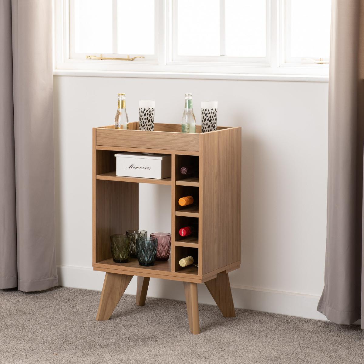 Give yourself everything you need to unwind after a long day or hard week, tuck away wine, glasses, and your favourite drinks with this Naples Mini Bar. Featuring a shelf with plenty of space to store wine glasses and also a wine bottle holder down the side. The tray style top is perfect for keeping your drink on and works great next to a dining room table or armchair. This piece is perfect for tucking away all your favorites and entertaining guests.