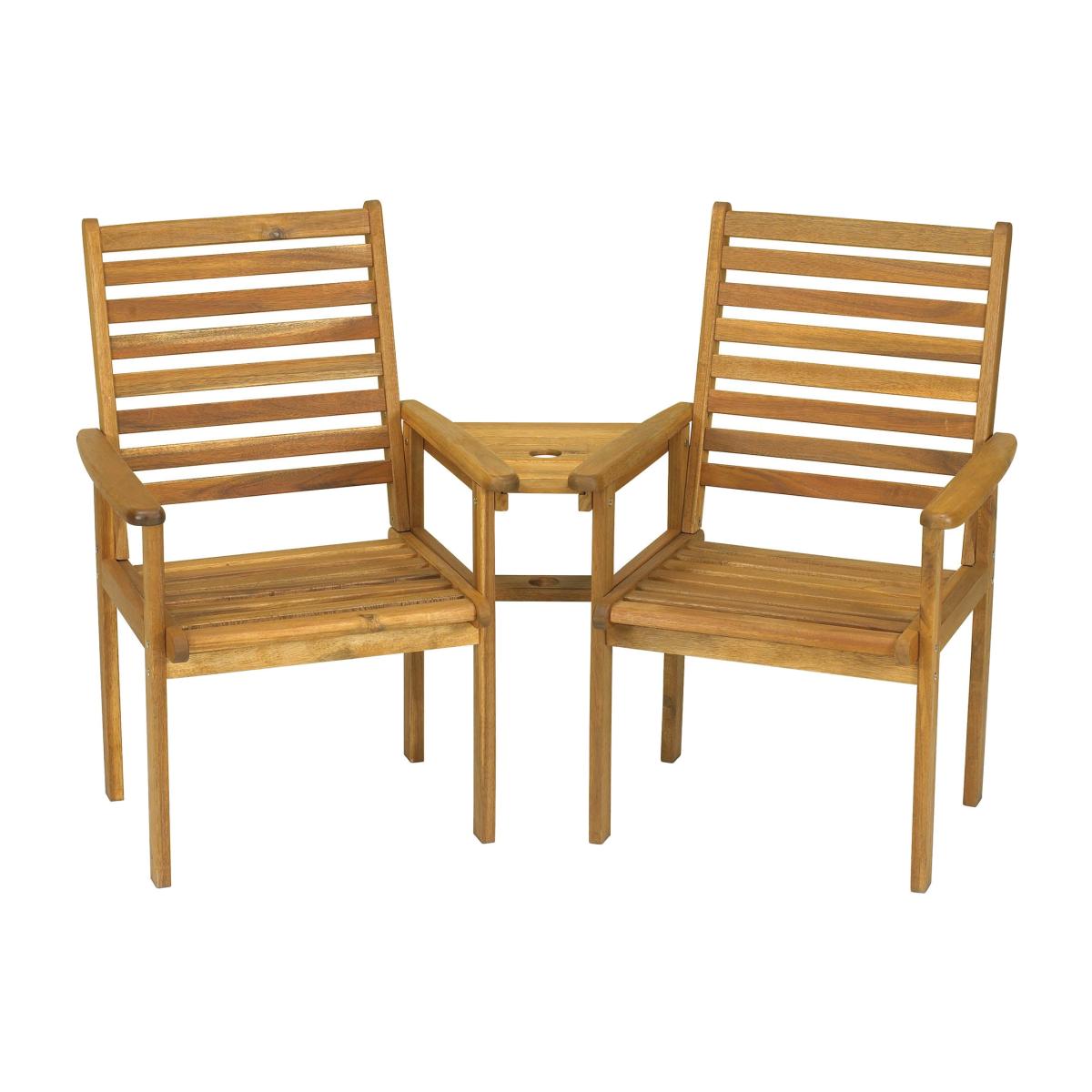 Crafted from solid acacia wood this traditional two seater companion set offers a sturdy frame and is designed with an optional parasol hole. Please note, unfortunately we cannot deliver this item to the Channel Islands.