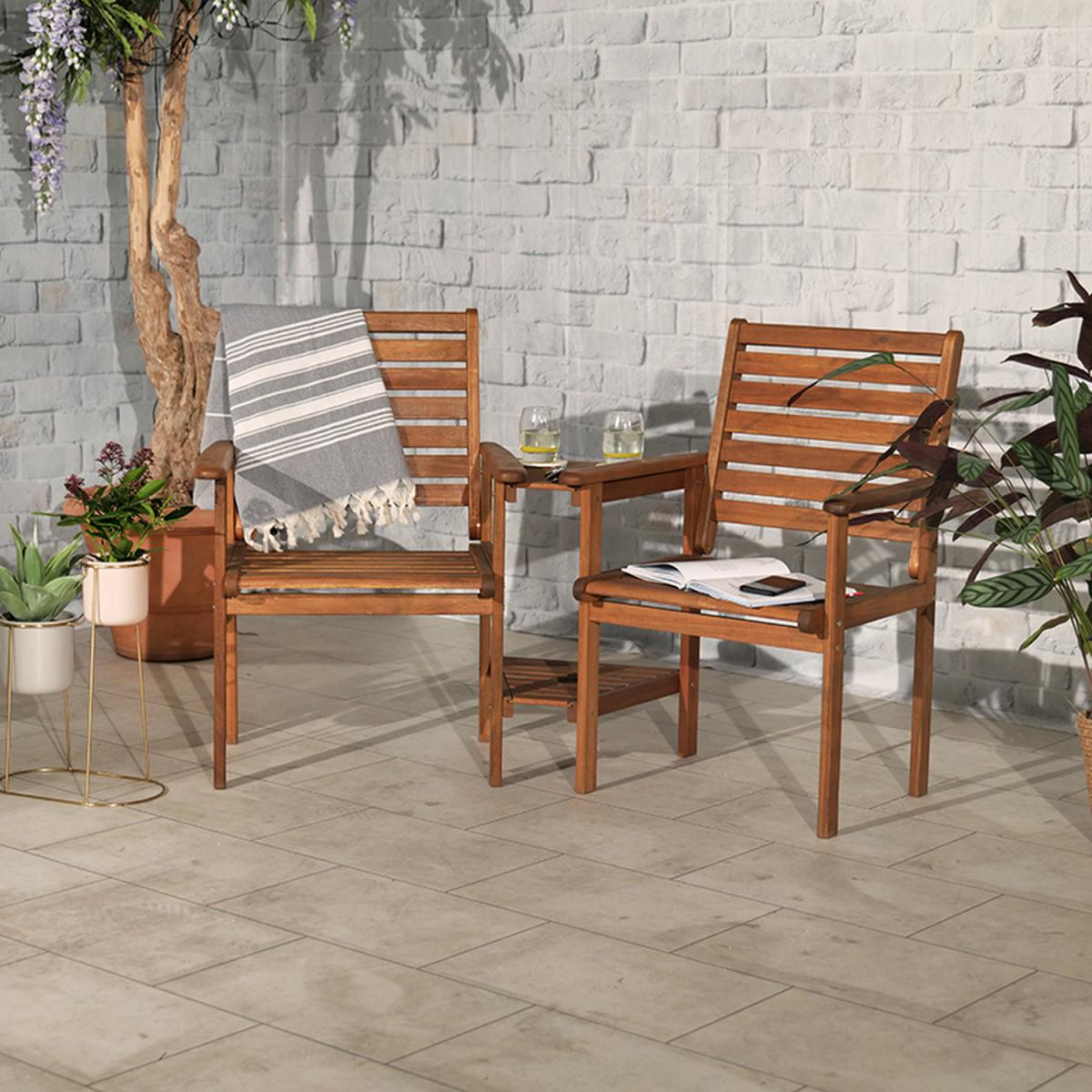 I love the Napolit duo love seat for its clean, natural aesthetic that works well in both contemporary and rustic garden settings. The acacia wood's durability makes it a practical choice for outdoor use, while its warm tone adds a welcoming touch. It pairs effortlessly with cushions in vibrant colours or neutral tones, allowing for versatile styling options. For an easily adaptable look, I recommend adding cushions in bold patterns or textured fabrics to create comfort and visual interest. This piece is particularly suitable for small patio spaces or cosy garden corners, bringing a relaxed yet elegant vibe that encourages outdoor lounging.