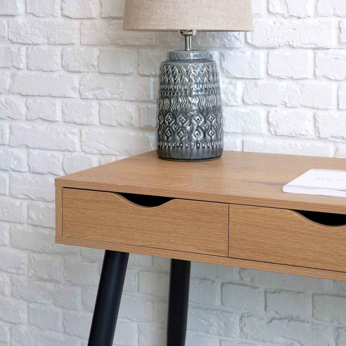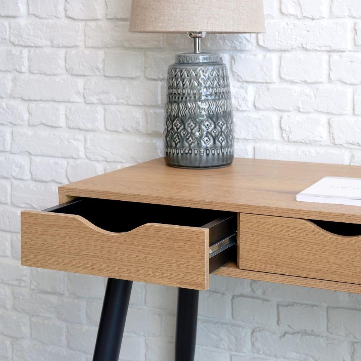 The Napoli desk is a sleek design with three drawers wrapped in a wild oak finish. Each drawer has a beautifully shaped hand hole to allow the drawer to be pulled. The desk is supported by tapered black powder-coated legs.