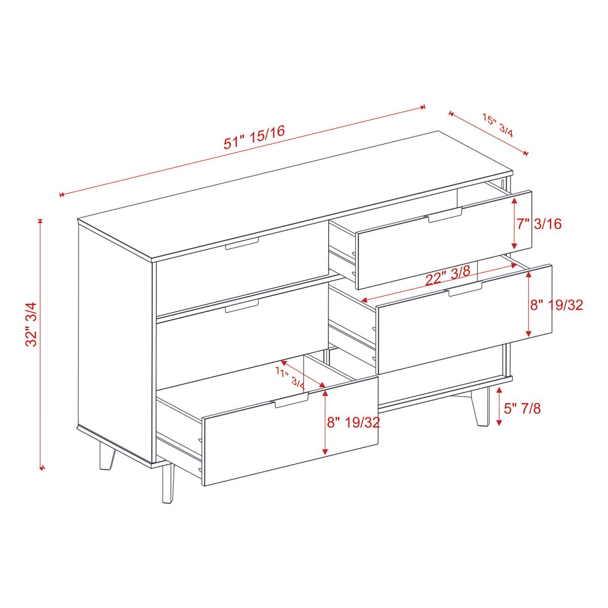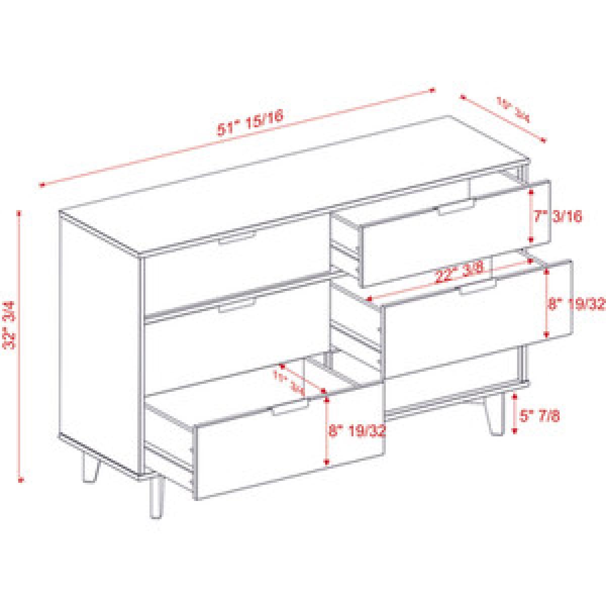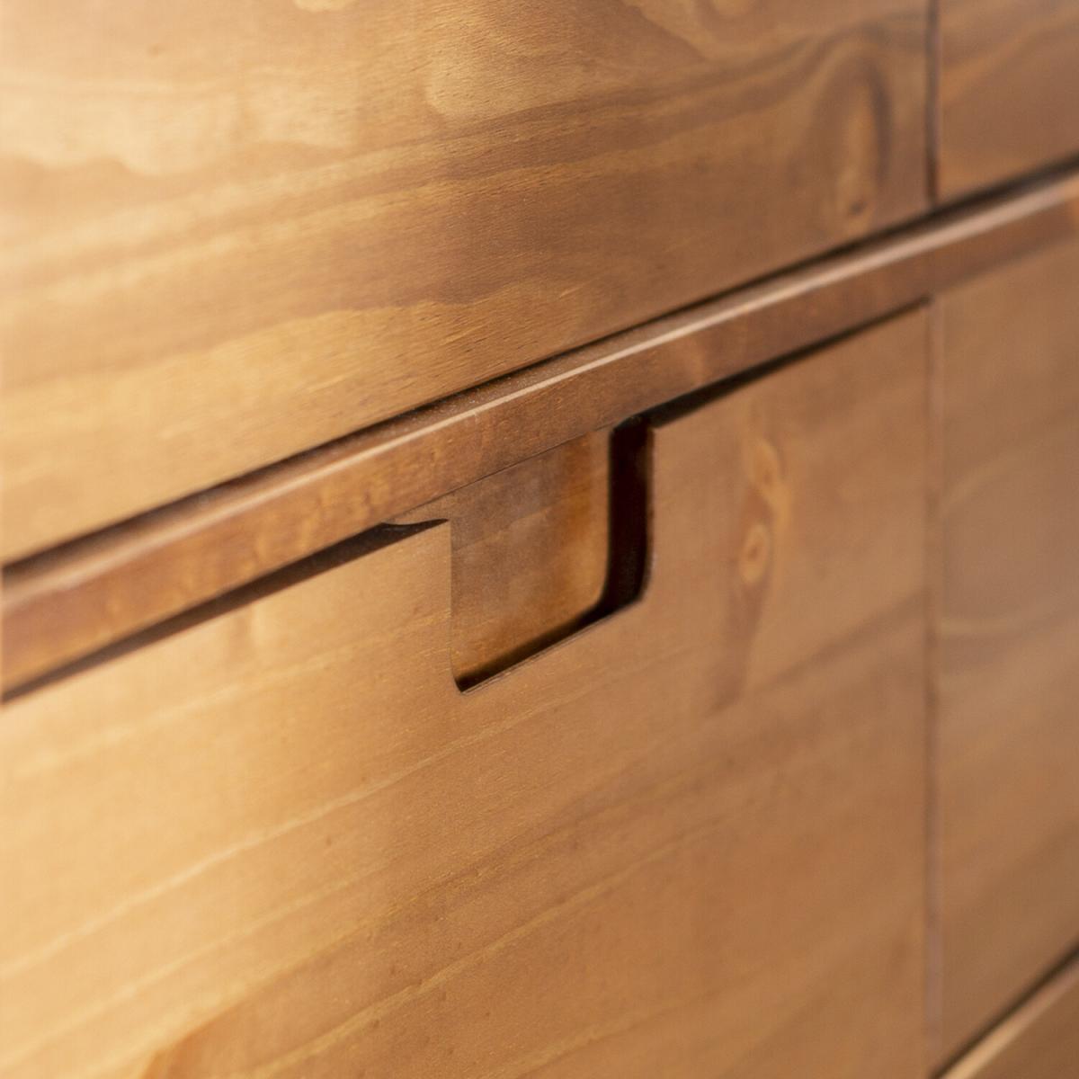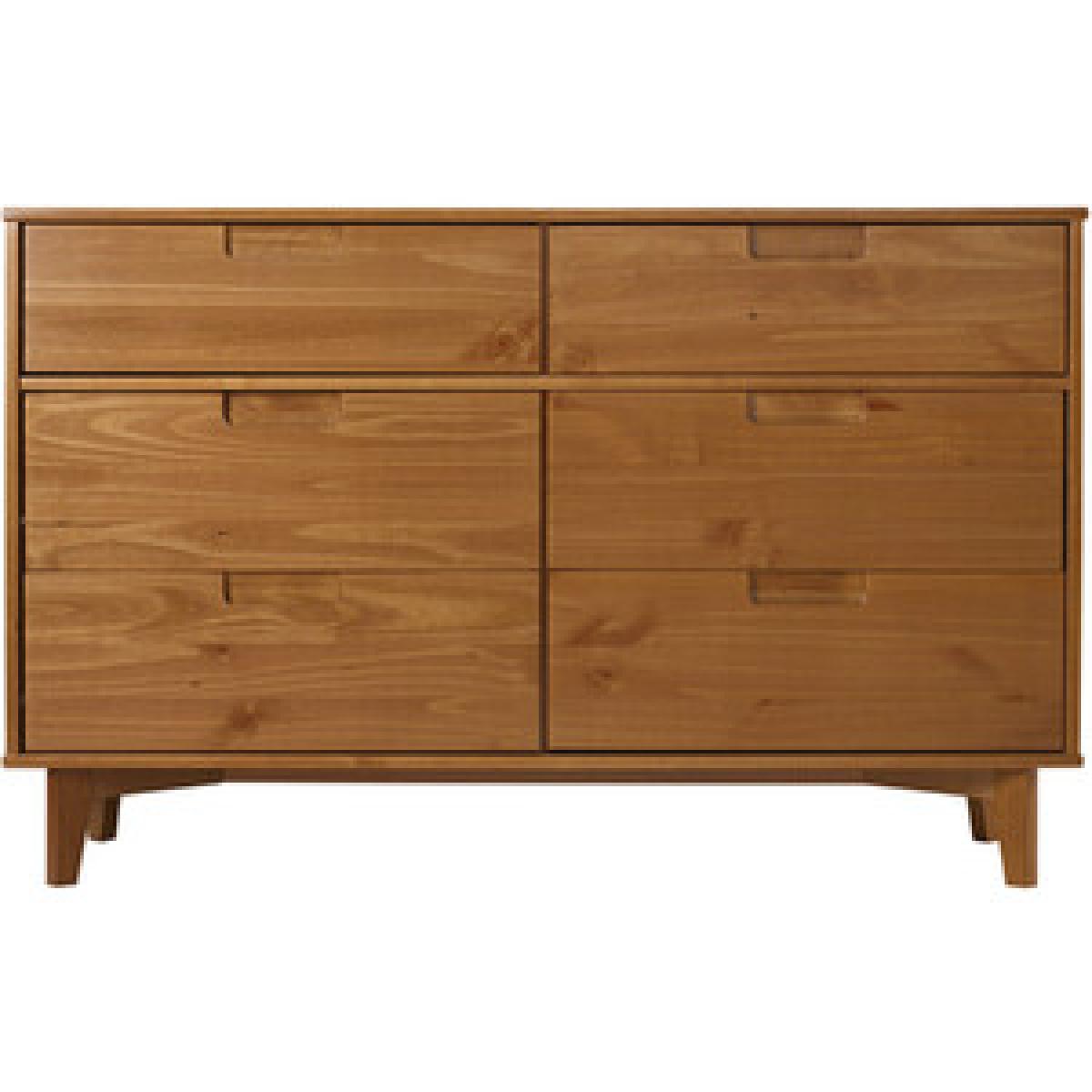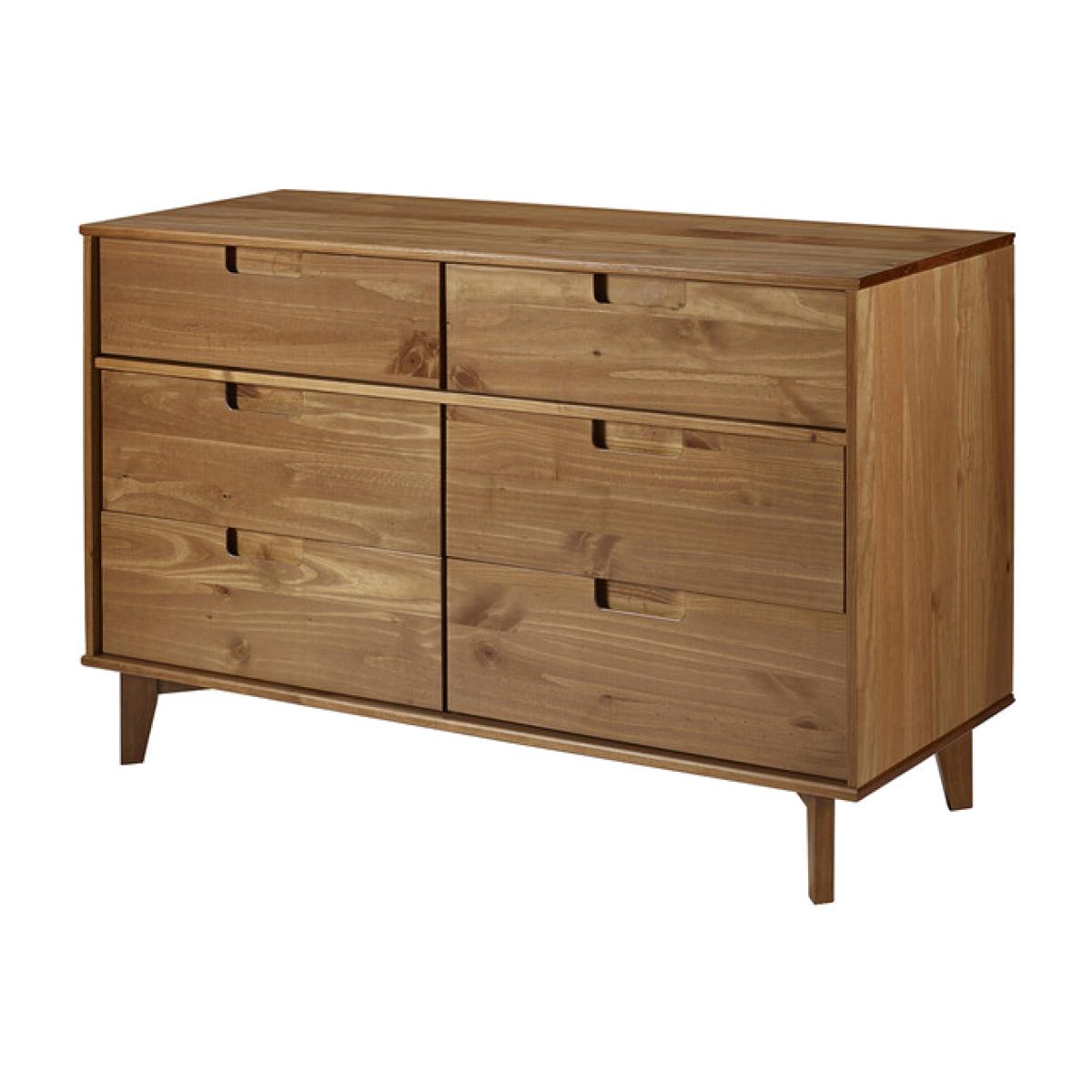 Add storage space into your home for your clothing and extra throws or pillows with the Nara 6 Drawer Dresser Chest. In a stylish, mid-century modern design featuring angled legs and cutout handles of solid pine wood in a stained finish. The intriguing design integrates a transitional aesthetic to complement your home décor. With six storage deep drawers to keep your clothing organized in your bedroom or for blankets and extra bedding in your guest room.
