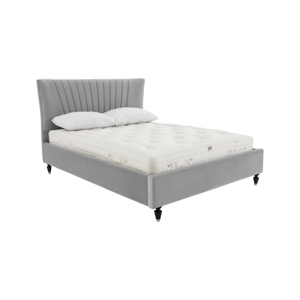 Simple, elegant and stylish, the Narla bedframe showcases a contemporary version of the classic fan-shaped headboard. Gently winged and neatly pleated, it’s matched in style by the bedframe’s wooden legs and sleek modern proportions. The beautifully-finished upholstery is available in a wide choice of luxurious fabrics and sophisticated colours. Handcrafted in Britain, this bedframe has a supportive sprung and slatted beech wood base. Headboard comes as one single piece. Elegant and sophisticated, the Narla bedframe brings traditional style with a contemporary feel to any bedroom. Beautifully upholstered in luxurious velvet, this gorgeous bedframe features a classic fan-shaped headboard accentuated with carefully-stitched decorative pleats and gently winged sides. Wooden legs – available in both light and dark finishes – elevate this bedframe literally, and in terms of style. A padded boarded base provides wonderful support to any style of mattress ensuring that this bed is every bit as comfortable as it is attractive. (Mattress shown is available separately). The Narla bedframe is handcrafted in Britain.
