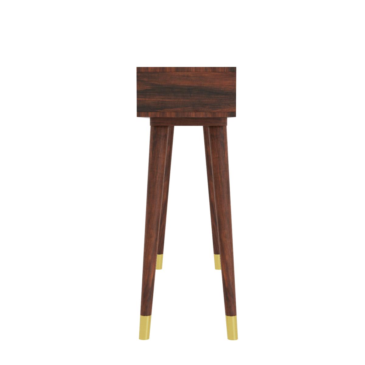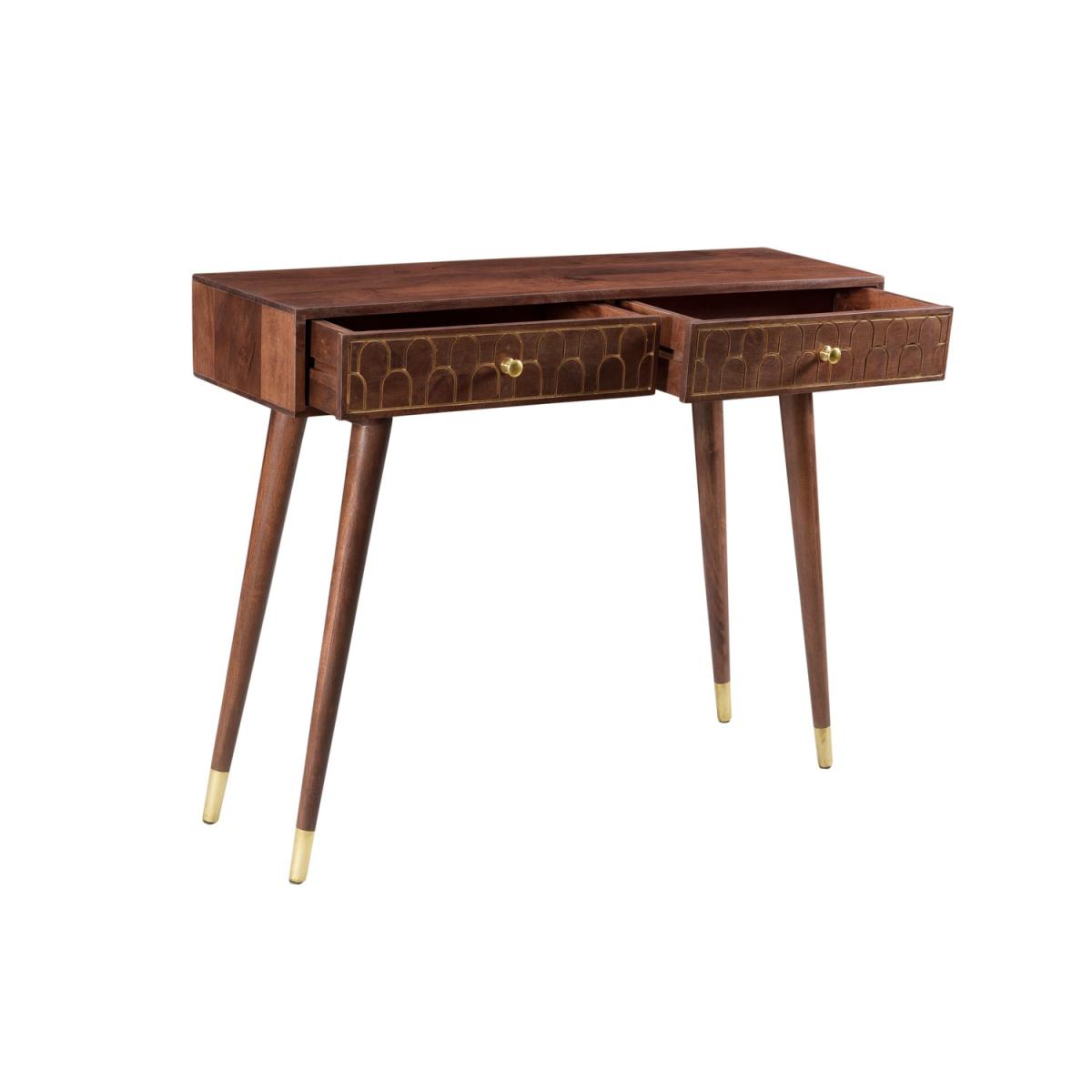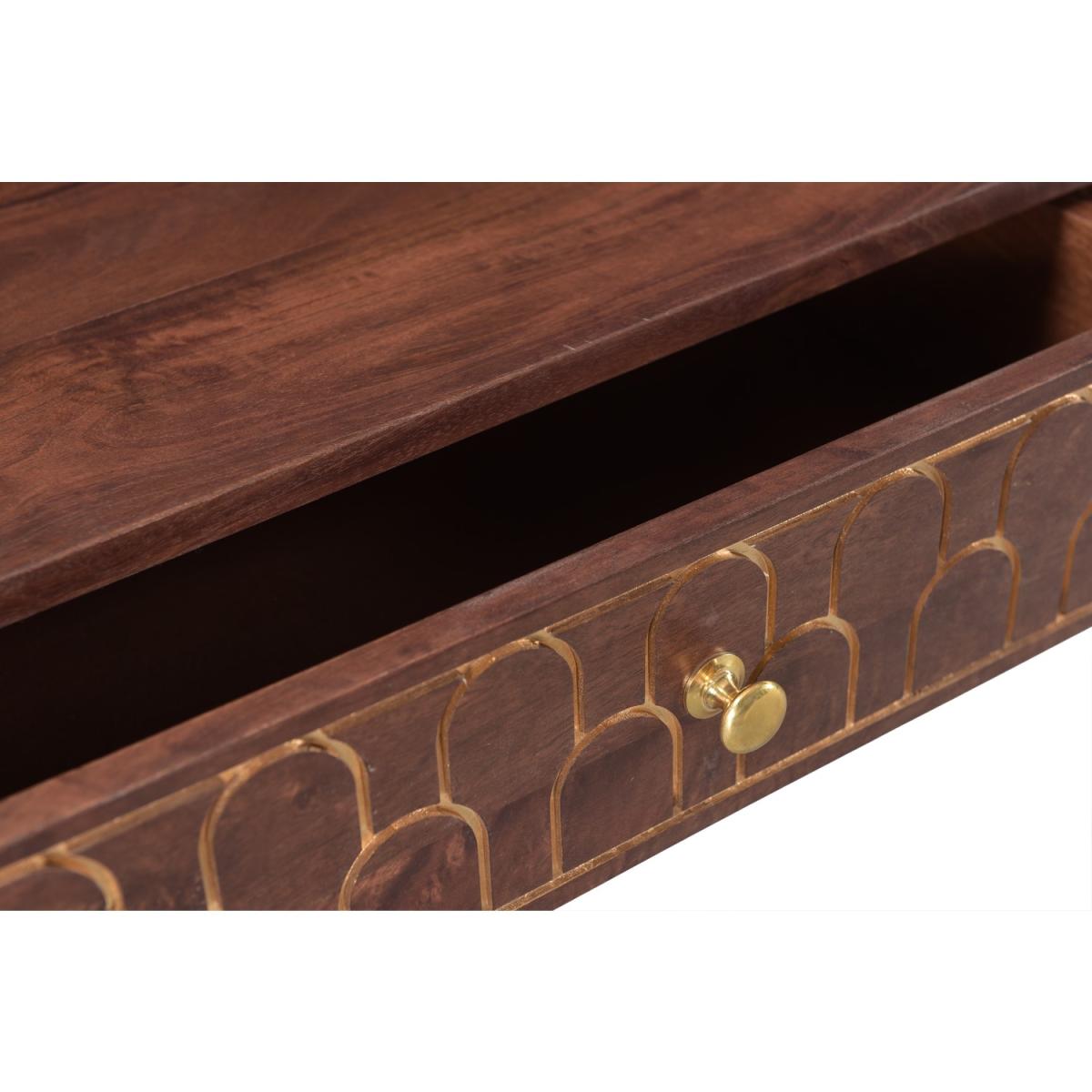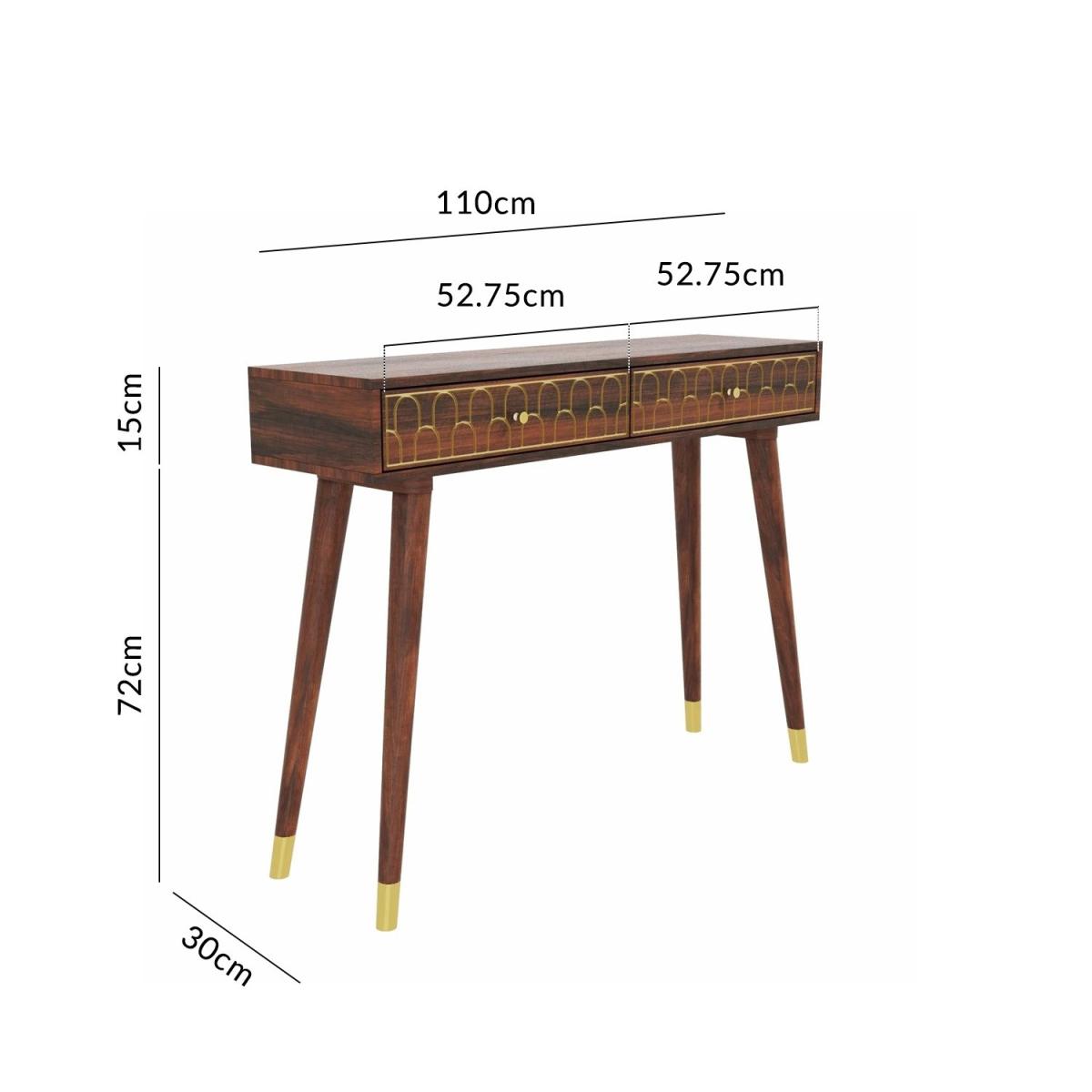 Hand crafted by experts, this mango wood console table offers wonderful craftsmanship combined with an art deco twist. Inlaid gold arches give the table a premium feel and draw your focus to the two drawers. With its narrow depth, this table offers a practical solution for your storage needs, whilst also providing that stylish interior element. Simply just attach the legs and it's ready to go.