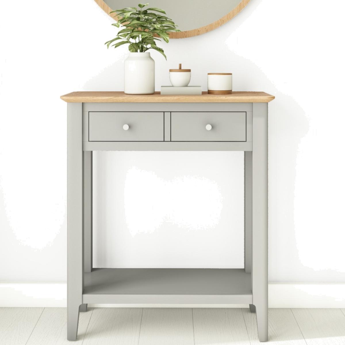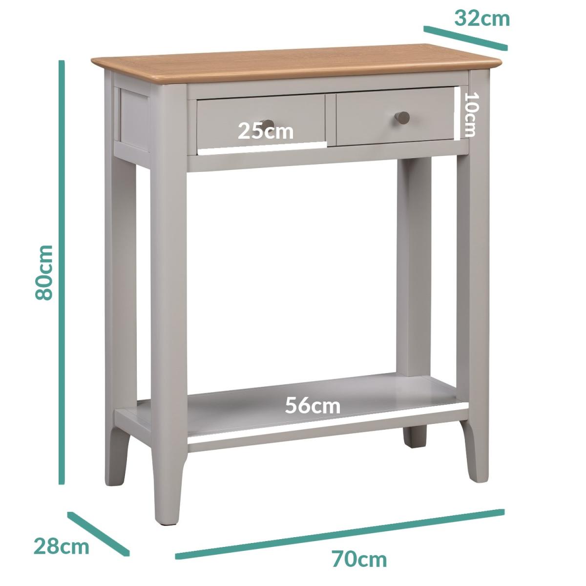 Features we love The elegant country design adds a sophisticated touch to any home. Two drawers and an exposed lower shelf for hallway essentials. Narrow design allows you to position it anywhere and save on space Oak top and grey painted finish. Assembly required All about me. This narrow grey and pale oak console table is an elegant yet practical storage solution offering a spacious drawer and an under-surface shelf for additional space which means you can keep your items out of sight. Need to know. Dimensions. H80 x W70 x D32 CM (give or take -/+ 3mm per measurement) Drawer dimensions. H10 x W61 x D14 CM Material. Oak/ Oak Veneer Finish. Grey Drawers. 1 Assembly. Yes.