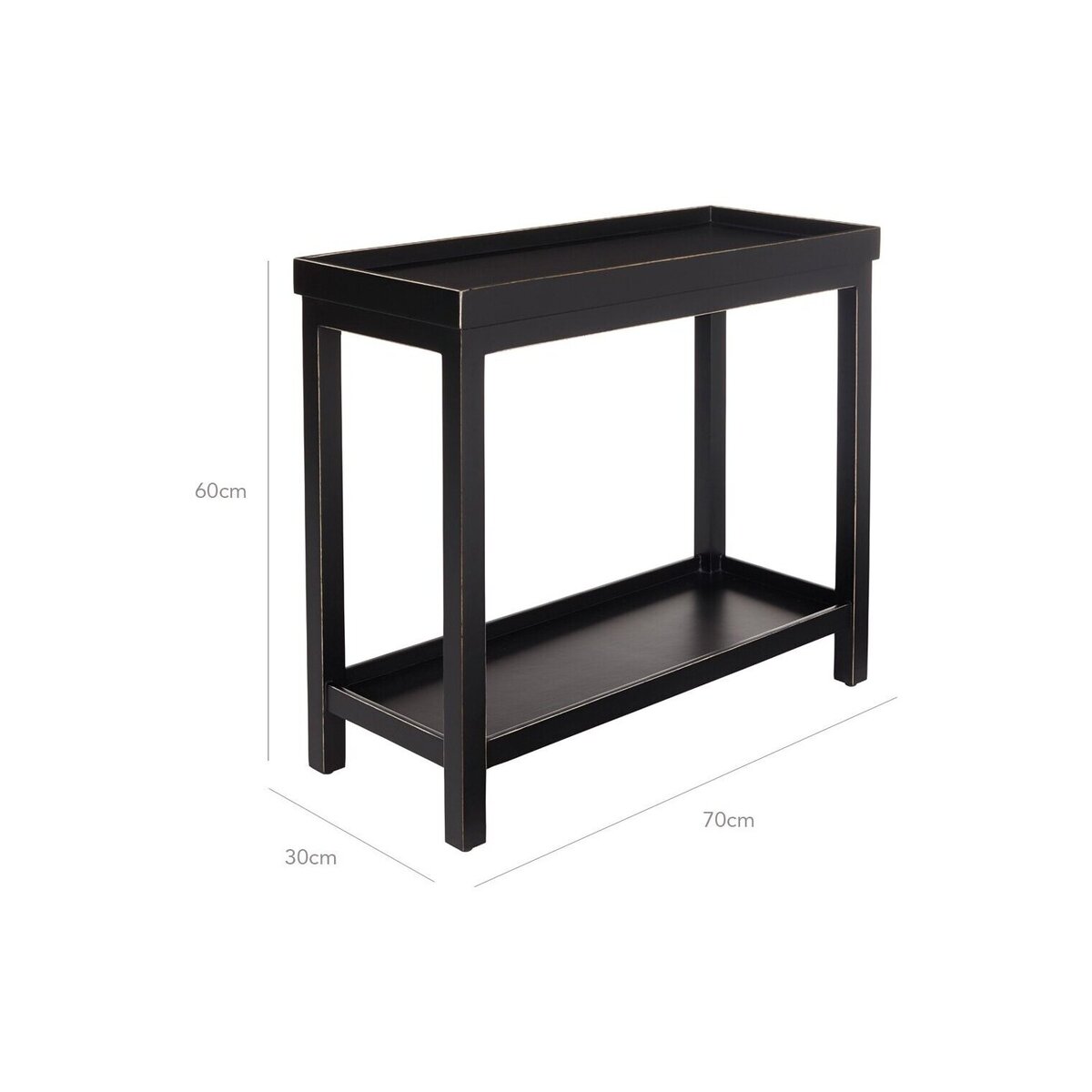 I love this side table’s sleek, understated design and its versatile black finish, which makes it a great addition to both modern and industrial interiors. The rubbed black adds a touch of texture that prevents it from feeling too stark, making it easier to pair with a variety of colour palettes and furniture styles. It works particularly well placed beside a sofa or armchair, providing a practical surface for a lamp, books, or drinks, while the lower shelf offers extra storage or display space. For styling tips, consider layering with soft textiles like a cosy throw or using decorative objects with organic shapes or metallic accents to add visual interest. Its slim profile makes it suitable for smaller spaces or as part of a flexible, multi-use setup.
