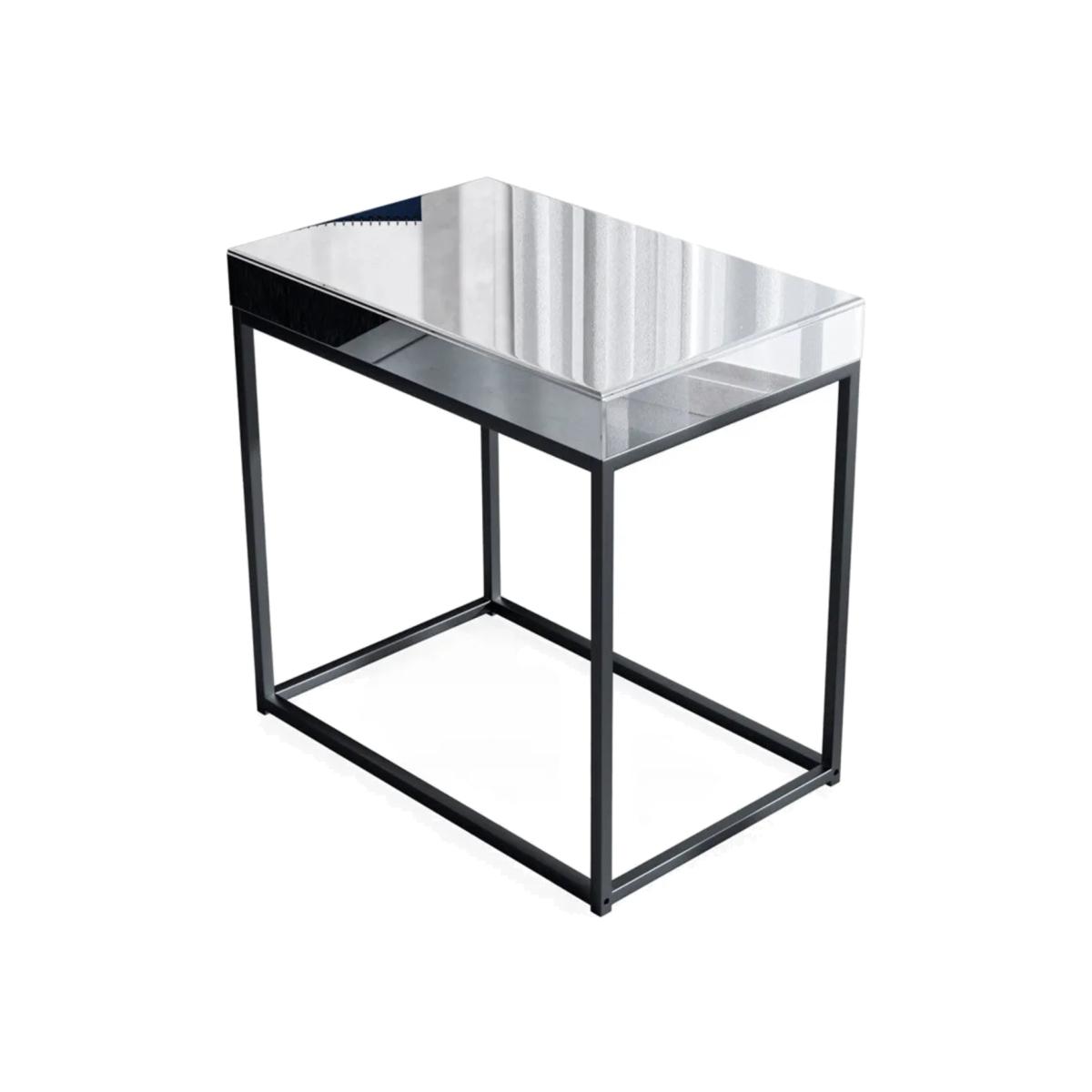 Featuring advanced anti-oxidation glass with chamfered edges, this mirror side table offers both beauty and functionality. Its sleek design elevates any space, making it a stunning statement piece in your home. The high-quality silver mirror surface reflects light to brighten up your room, creating a sense of openness. Ideal for placing beside your sofa, it provides easy access to everyday items while enhancing your living room or lounge with a sophisticated touch. The rectangular base design, reinforced with four additional brackets, ensures superior stability and durability. The black-painted finish on the table legs resists rust and adds a modern, industrial appeal to the overall structure. With its smooth, flat mirror surface, this side table is incredibly easy to clean. Simply wipe with a soft, damp cloth to remove dust and fingerprints, keeping it looking immaculate with minimal effort. Versatile and Functional This table fits seamlessly into any space, whether it's your entryway, living room, bedroom, or office. Use it as a stylish surface for lamps, plants, or decorative pieces, adding both function and elegance to any room.