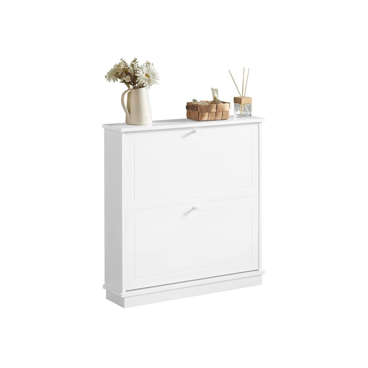 This modern design 2 flip-drawer shoe cabinet matches any home decor perfectly. It provides a shoe storage compartment of 2 flip drawers. 2 handles on the flip drawers make you open them easily. The top of the shoe cabinet is ideal for storing something like keys, a wallet you might need in reach, or photo frames and plants you want to display. Item comes in a flat pack and requires self-assembly, detailed instructions are supplied.