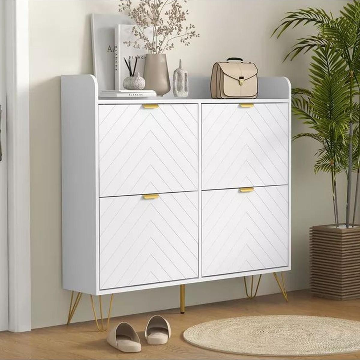 Make the most of tight spaces with this narrow shoe storage cabinet featuring four flip drawers. Its streamlined design allows it to fit easily in hallways or entryways, providing a neat and efficient way to organise your footwear collection.