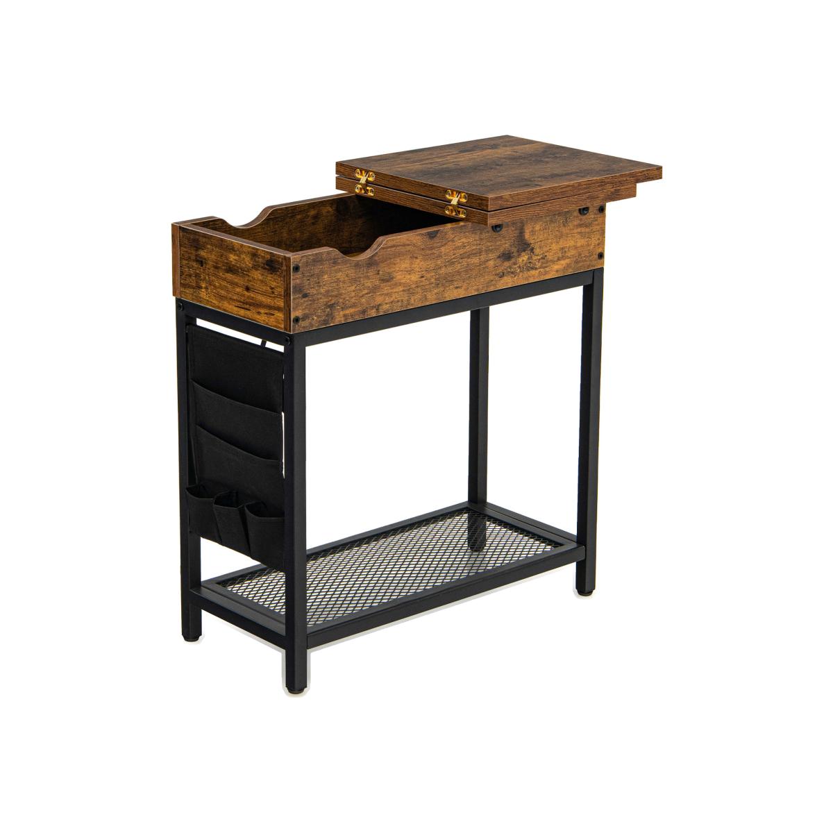 Are you sick of messed up power strips and wires by sofa or bed? This end table with charging station would help! It features an interior power strip that consists of 2 outlets and 2 USB ports, allowing you to charge the electronic devices with ease. When the tabletop is closed, the power strip is still available thanks to the 2 side grooves. What's more, the sofa side table can also provide ample storage space, including a side pocket, a concealed compartment and an open shelf, for you to organize the sundries. Besides, the nightstand is also reliable in construction. The heavy-duty steel frame with adjustable foot pads can keep good stability on the carpet or floor. Thus, being functional and stable, the narrow side table is suitable for the bedroom, living room or study.