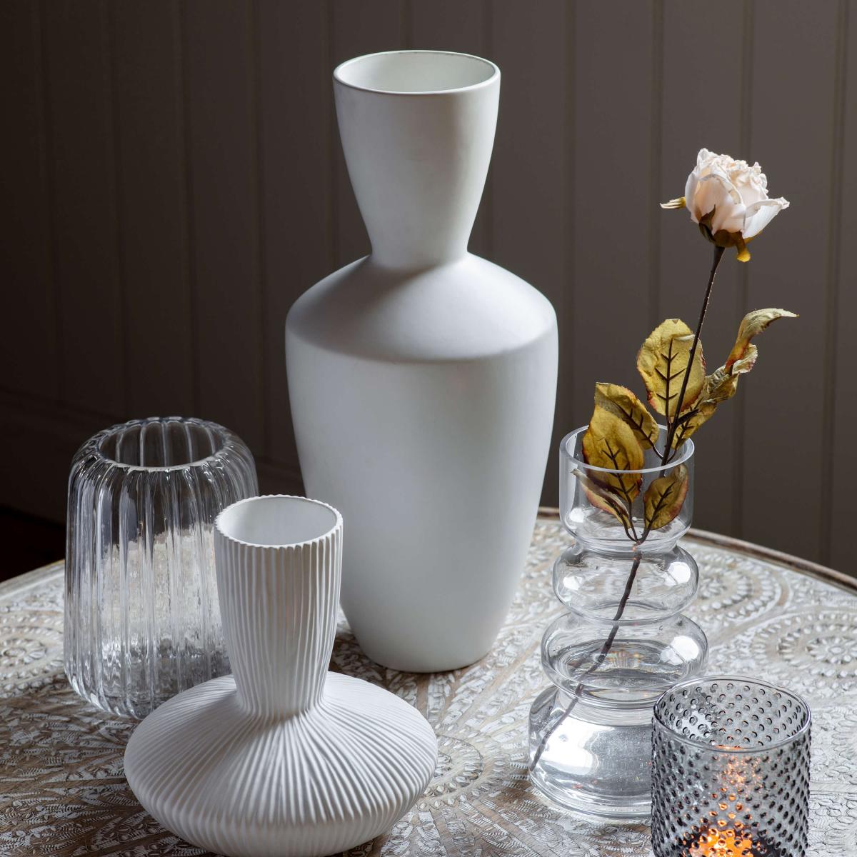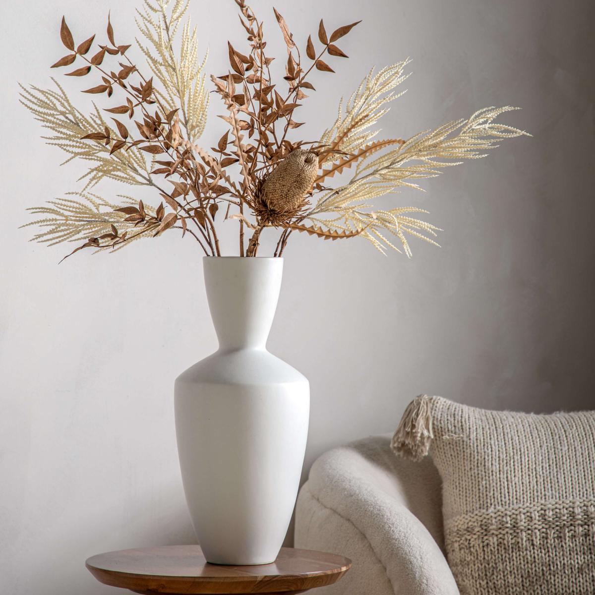 I love this sleek white vase for its minimalist, versatile appeal. It works well in contemporary spaces, particularly those with neutral tones or muted colour palettes, but it can also add a touch of modern sophistication to more eclectic interiors. Practical styling tips include using it as a standalone statement piece or filling it with dried botanicals, like pampas grass or stems, to enhance its clean lines. Its understated elegance makes it ideal for placing on side tables, mantels, or even on kitchen counters to bring a subtle yet stylish focal point to any room.