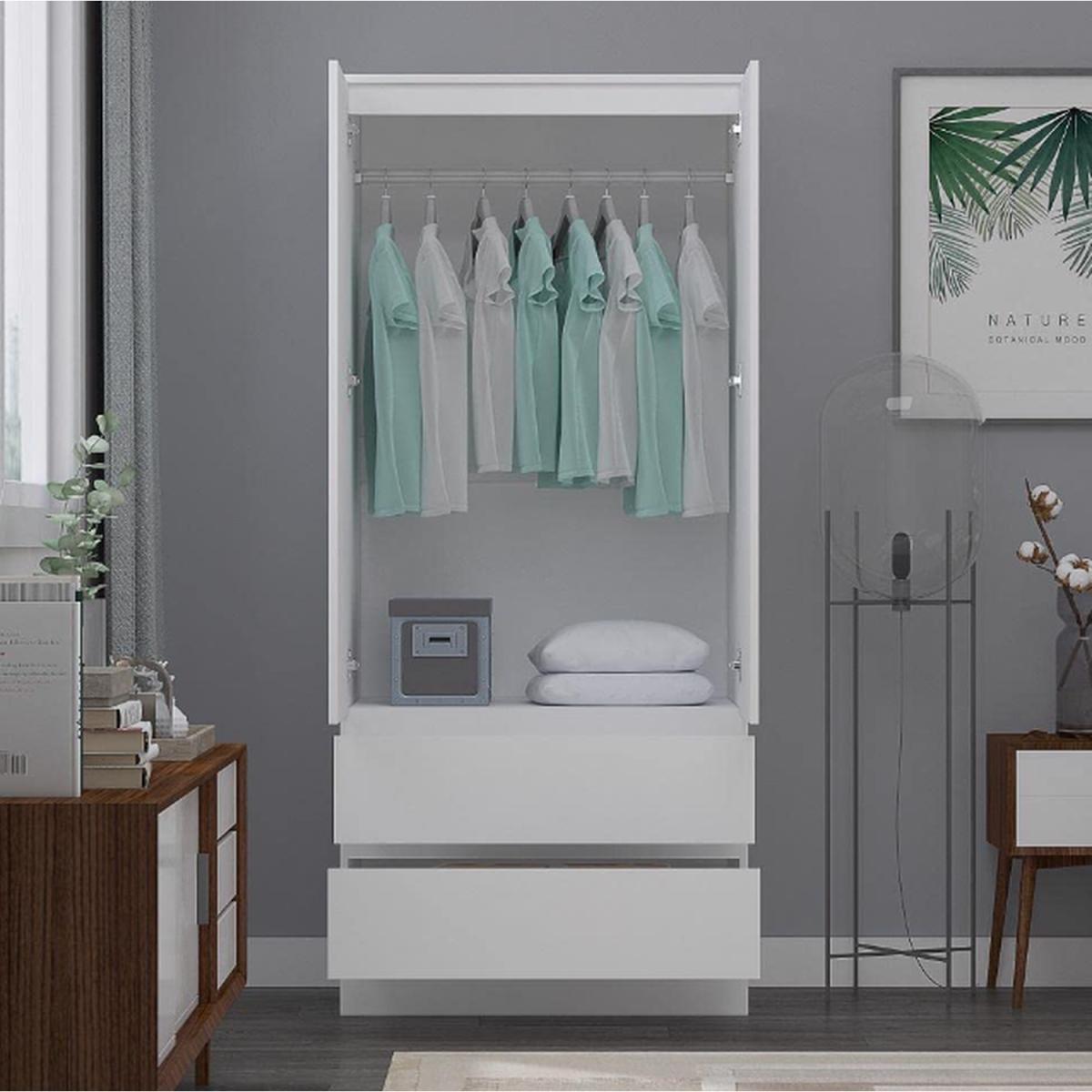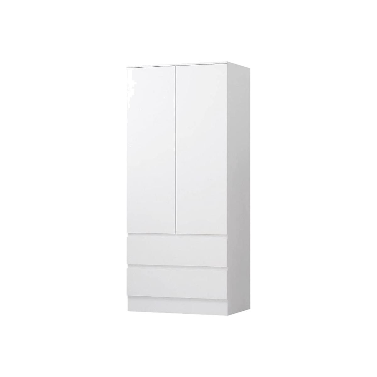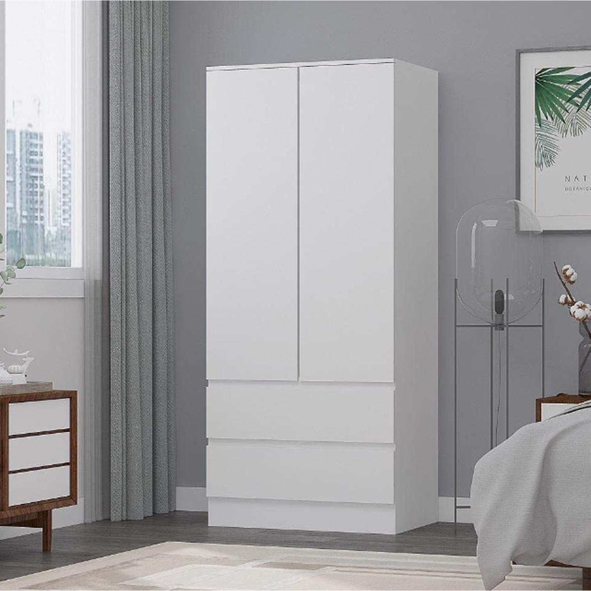 White 2-Door 2-Drawer Combination Wardrobe. This crisp white wardrobe has 2 doors above 2 full-width drawers. Behind the 2 Doors is a metal hanging rail. Delivered flat-packed for Home Assembly.