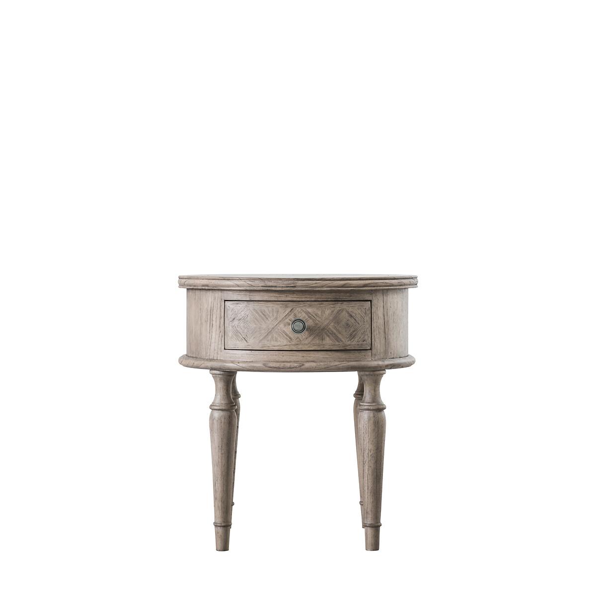 With a nod towards the french colonial style this round side table is made from mindy ash and features parquet inlaid vaneer work in a lightly brushed natural finish with single drawer. Product details1 Drawer Assembly required. Product Composition - Mindy Ash. Product Dimensions - 53 cm x 53 cm x 55 cm , Weight - 8.6 KGInternal Drawer Size- 29.2 x 48 x 80 cm Package Dimensions - 74 cm x 59 cm x 28 cm, Weight - 15 kg. This product will be dispatched by one of our trusted suppliers. You’ll be contacted by their selected courier about your delivery. Please note: this product cannot be delivered to all Offshore Islands, Northern Ireland or Republic of Ireland. GALLE01