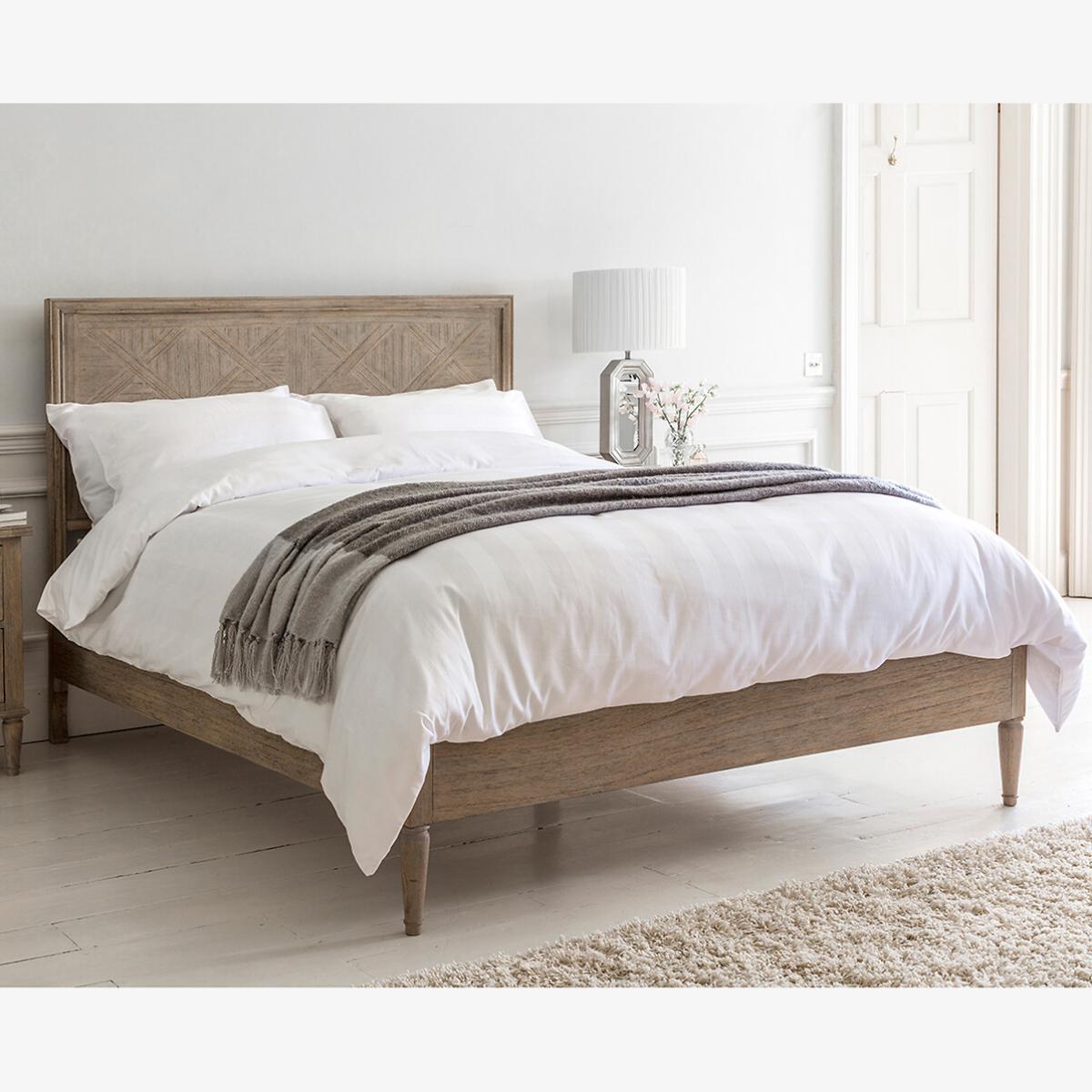 This parquet distressed wood bed is made from mindy ash and lightly brushed to recreate the natural ageing of a beach side veranda, open to the elements of sun and sand. The herringbone design and textured finish would suit a modern or boho interior. Mattress not included, supplied with slatted base. Actual Sizes of Beds-L217 x W161 x H127cm (King)L217 x W191 xH127cm (Superking)Footboard Height - 38cm. Underbed Storage Height - 20cm. Mattress size: 140 x 190cm (Double), 160 x 200cm (King), 180 x 200cm (Superking)Parcel Dimensions:King:Box 1 - 166 x 20 x 14cm. Box 2 - 208 x 40 x 33cmSuperking:. Box 1 - 197 x 20 x 14cm. Box 2 - 208 x 34 x 33cm. Full Assembly Required. Please note: this product cannot be delivered to all Offshore Islands, Northern Ireland or Republic of Ireland. This product will be dispatched by one of our trusted suppliers. You’ll be contacted by their selected courier about your delivery.