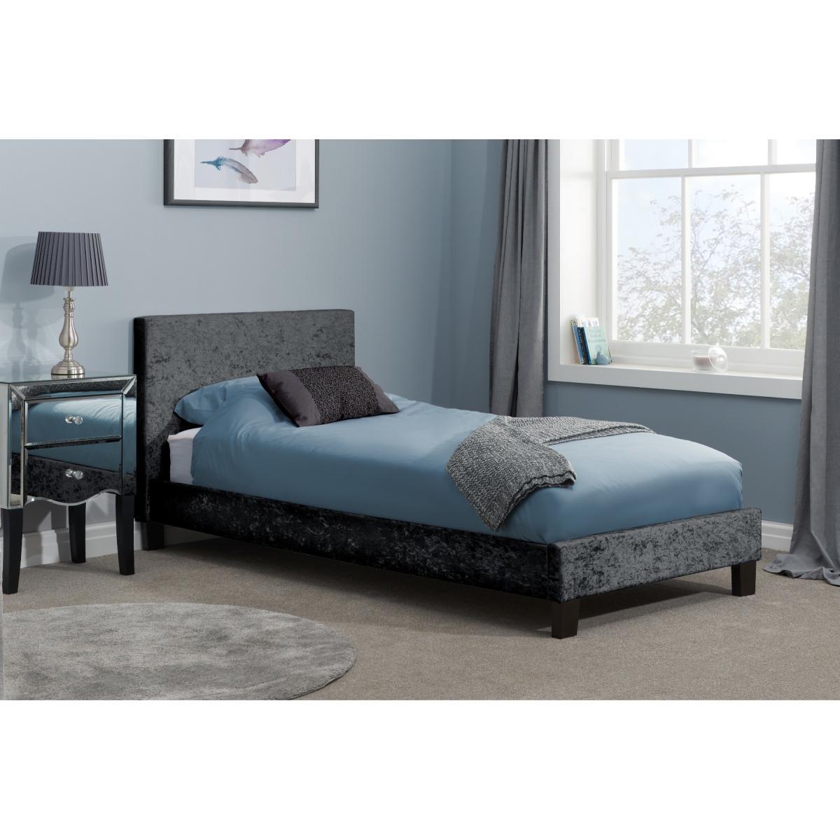 Upholstered in hard-wearing yet elegant black polyester and featuring complementary dark feet for an understated finish, the Natalia velvet bed brings glamour to any bedroom. The frame is sprung slatted - providing extra comfort and adjusting to pressure to ensure a great night’s sleep. Upholstered in black polyester - available in three colours. Sprung slatted base for ultimate comfort Easy to assemble202cm long, other sizes available