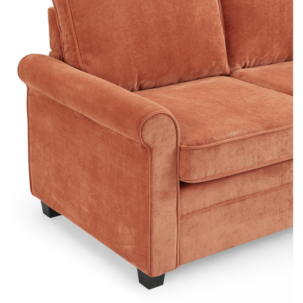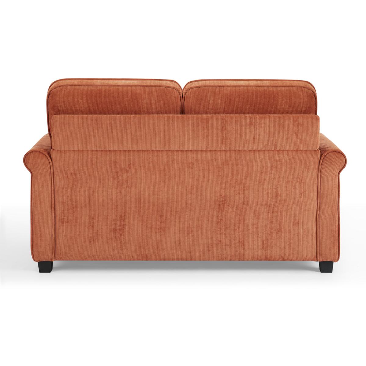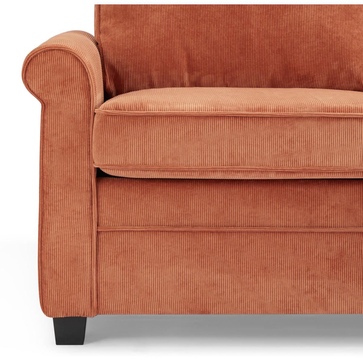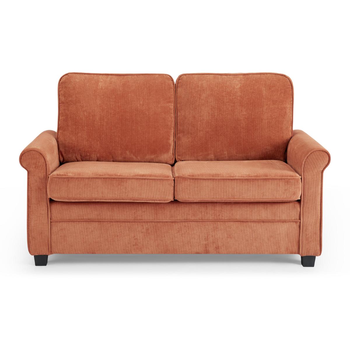 Introducing NATHAN our compact pull out sofa bed with mattress available in burnt orange and grey cord and blue and grey velvet. NATHAN can seat up to 2 people as a sofa and the sleeping area converts to the size of a small double as a sofa bed. NATHAN has a compact boxy design ideal for small spaces where living and sleeping are needed in one place. It has removeable cushions and 2 matching throw pillows and stands on dark wooden block feet. NATHAN has a convertible design with a simple lift out mechanism with a fold out mattress supported by metal framework. Cord is a woven material made of polyester. Cord is incredibly warm as it has the ability to trap air between its fibres, it is also hard wearing yet soft and durable. Cord is known for it striped patterning and its raised brushed pile that adds texture. Velvet is one of the most desirable upholstery fabrics. Its soft texture perfectly suits any piece of furniture and adds a touch of opulence and elegance. It is a woven polyester fabric with a short, thick, plush pile.