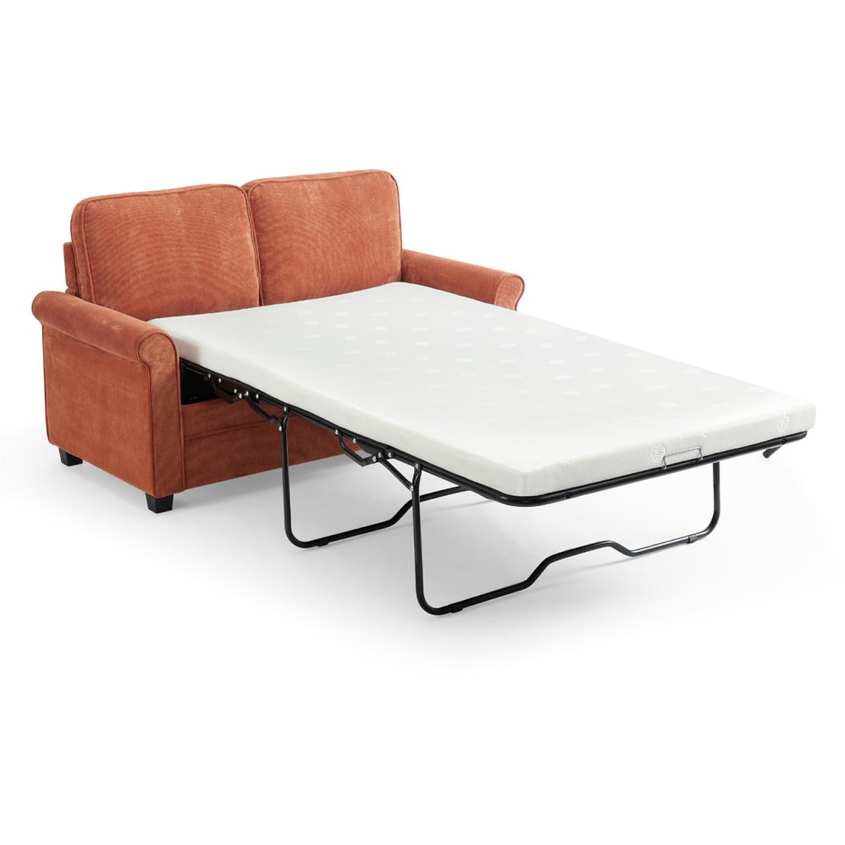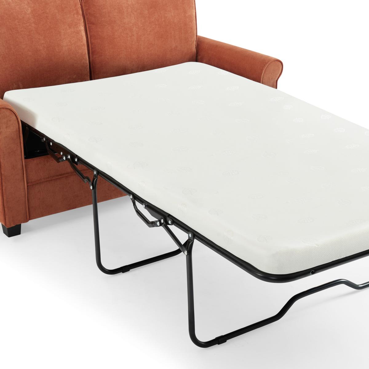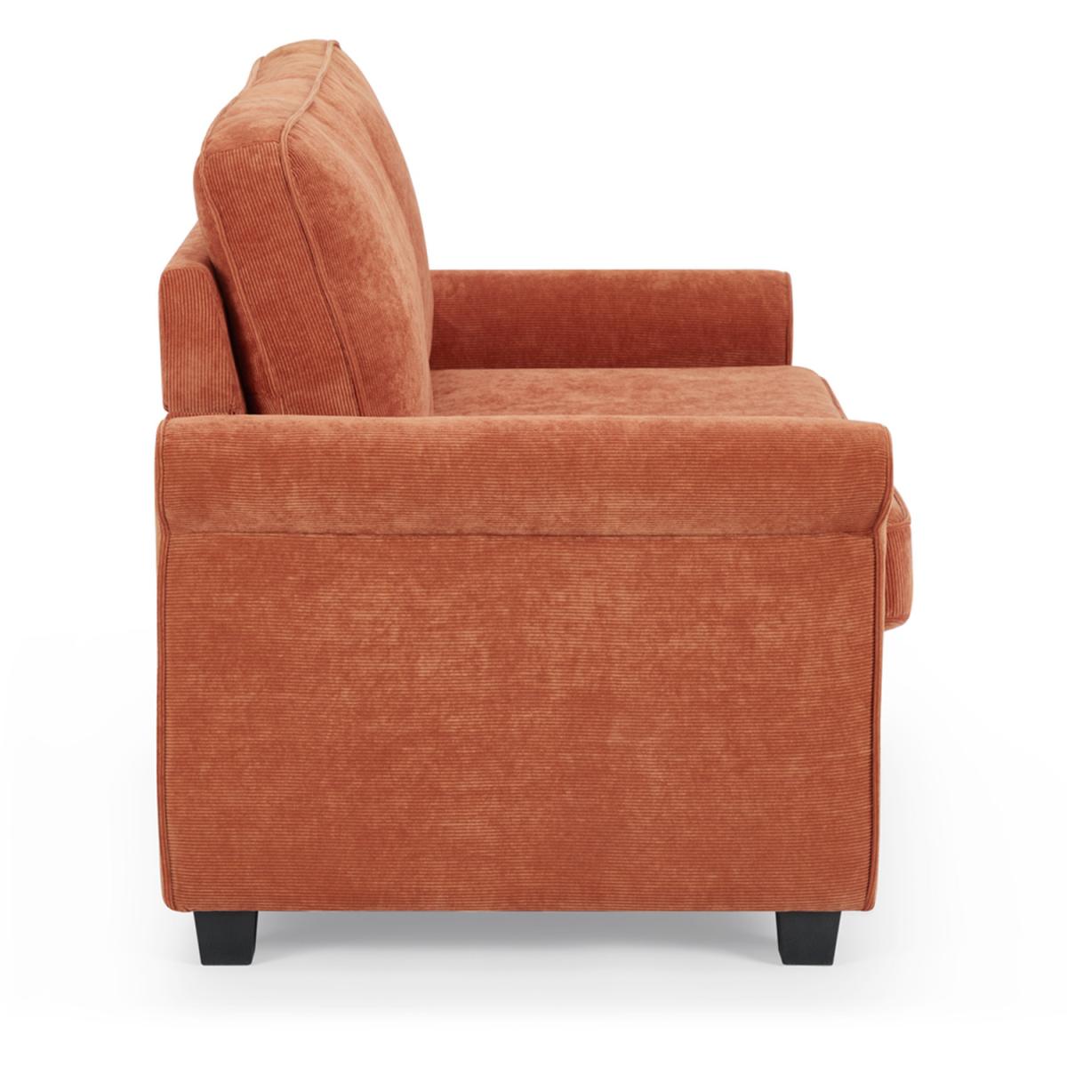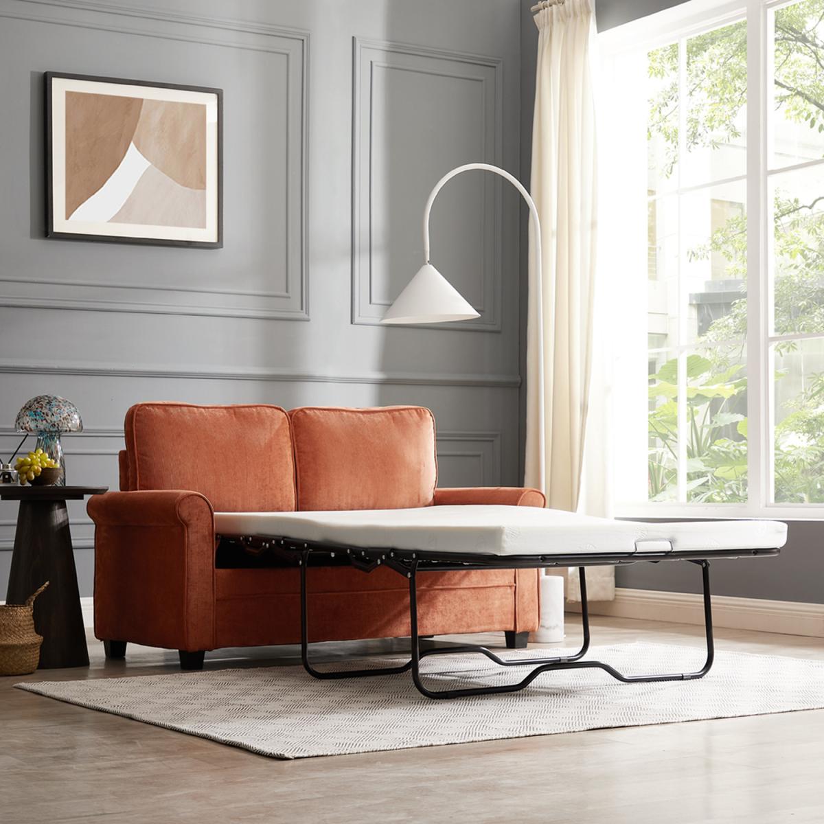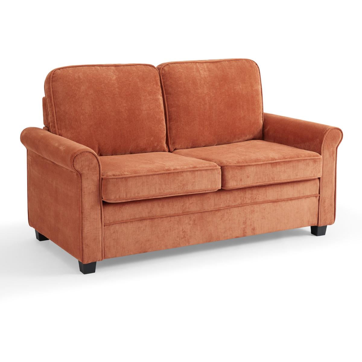Introducing NATHAN our compact pull out sofa bed with mattress available in burnt orange and grey cord and blue and grey velvet. NATHAN can seat up to 2 people as a sofa and the sleeping area converts to the size of a small double as a sofa bed. NATHAN has a compact boxy design ideal for small spaces where living and sleeping are needed in one place. It has removeable cushions and 2 matching throw pillows and stands on dark wooden block feet. NATHAN has a convertible design with a simple lift out mechanism with a fold out mattress supported by metal framework. Cord is a woven material made of polyester. Cord is incredibly warm as it has the ability to trap air between its fibres, it is also hard wearing yet soft and durable. Cord is known for it striped patterning and its raised brushed pile that adds texture. Velvet is one of the most desirable upholstery fabrics. Its soft texture perfectly suits any piece of furniture and adds a touch of opulence and elegance. It is a woven polyester fabric with a short, thick, plush pile.