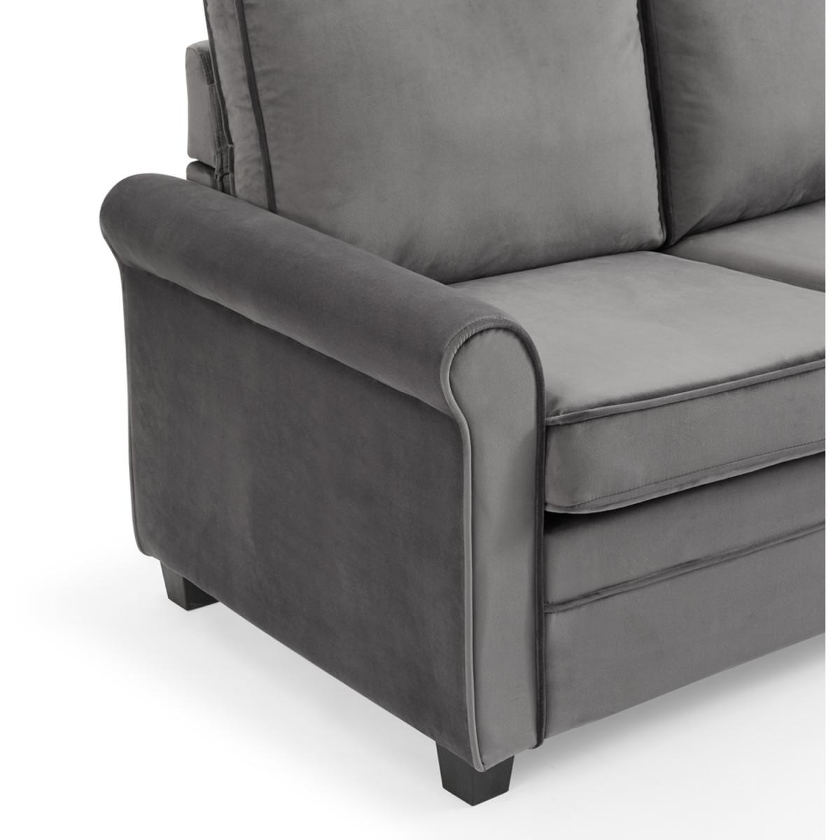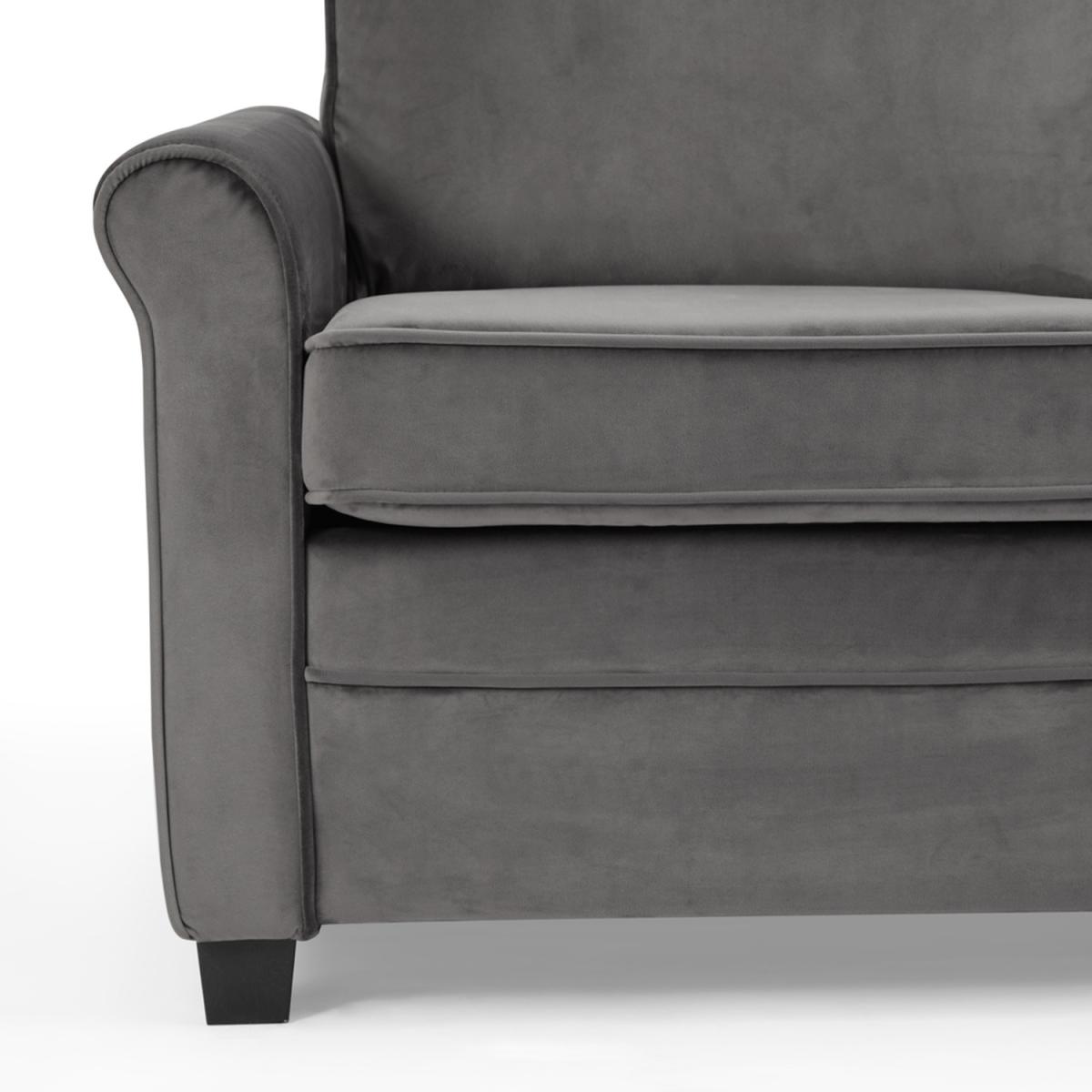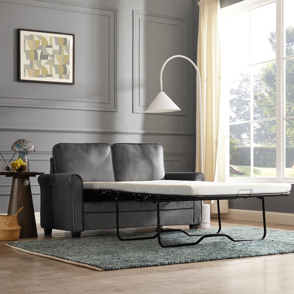 Introducing NATHAN our compact pull out sofa bed with mattress available in burnt orange and grey cord and blue and grey velvet. NATHAN can seat up to 2 people as a sofa and the sleeping area converts to the size of a small double as a sofa bed. NATHAN has a compact boxy design ideal for small spaces where living and sleeping are needed in one place. It has removeable cushions and 2 matching throw pillows and stands on dark wooden block feet. NATHAN has a convertible design with a simple lift out mechanism with a fold out mattress supported by metal framework. Cord is a woven material made of polyester. Cord is incredibly warm as it has the ability to trap air between its fibres, it is also hard wearing yet soft and durable. Cord is known for it striped patterning and its raised brushed pile that adds texture. Velvet is one of the most desirable upholstery fabrics. Its soft texture perfectly suits any piece of furniture and adds a touch of opulence and elegance. It is a woven polyester fabric with a short, thick, plush pile.
