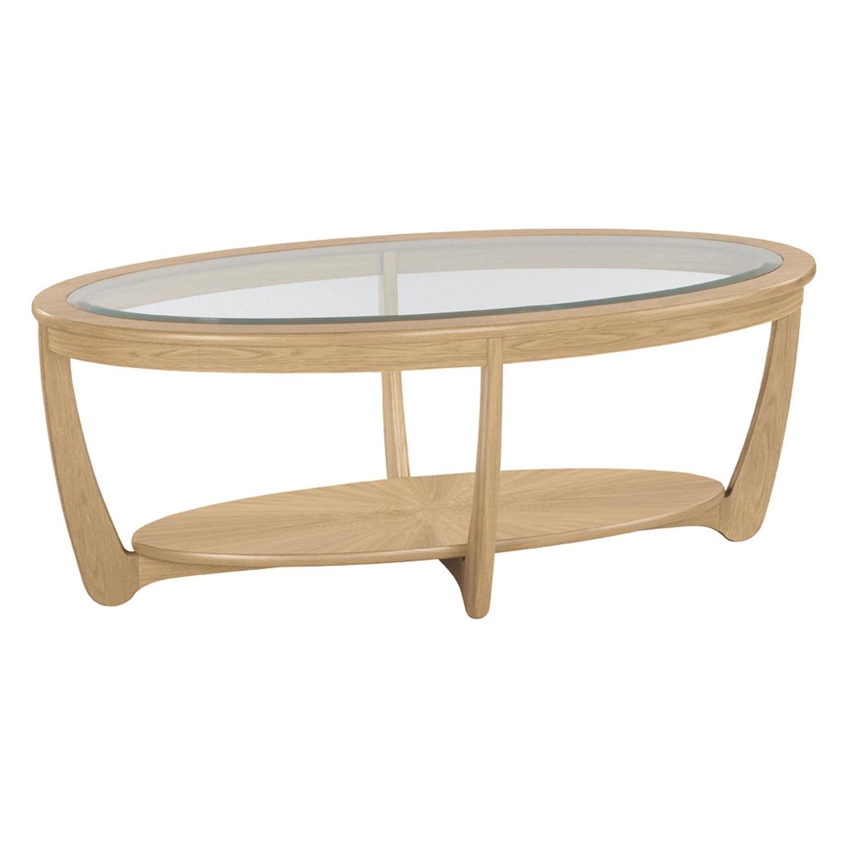 Elegant living and dining room furniture. Classic style with contemporary curves in oak or teak. Beautifully crafted in Britain by Nathan. With its organic curves and beautifully sleek lines, the Nathan Shades glass top oval coffee table is a coffee table for all homes, and for all time. The perfect combination of classic craftsmanship and contemporary design, this distinctive coffee table is beautifully crafted from solid wood and veneer and has shaped legs that curve inwards and downwards to support a large oval-shaped lower shelf featuring the precisely-rendered Nathan Shades signature sunburst motif. The top is made of bevelled glass, framed by the wood of the table, which offers a practical surface for beverages, books and board games. Graceful and charming, this coffee table is offered in your choice of oak or teak. The Nathan Shades glass top oval coffee table is part of the Nathan Shades collection and is made in Britain. This well-priced and beautifully-designed range includes a wide choice of extending dining tables and dining chairs as well as display and storage pieces. Pair this coffee table with the Nathan Shades glass top round lamp table. Did you know? Natural wood has unique markings, with some colour variation. The colour and tone of wood improves with age.