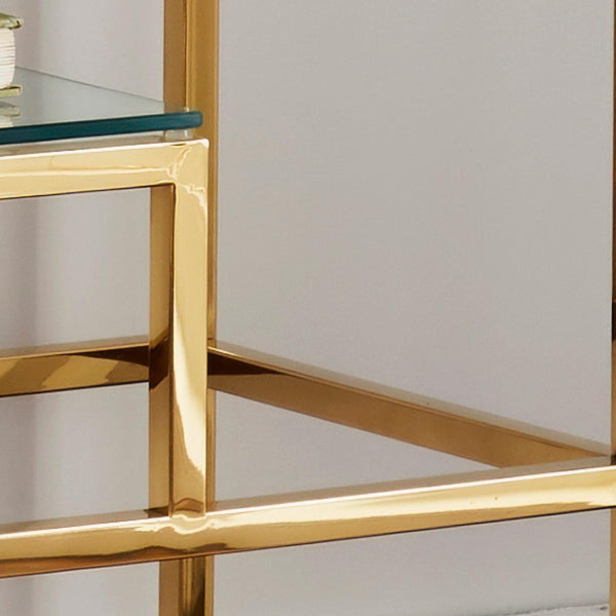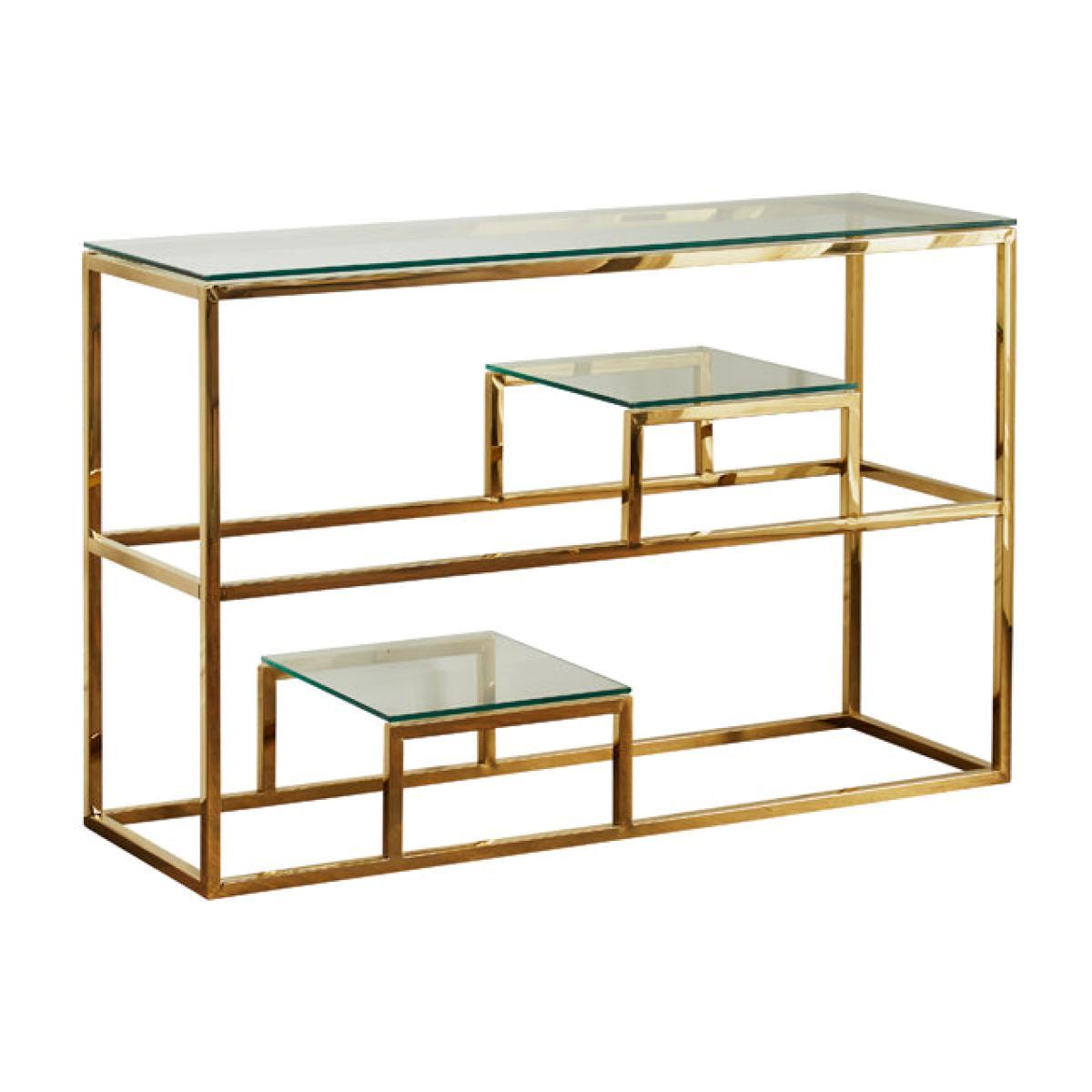 Display stack console table. Finished with golden plated stainless steel. Easy to assemble (comes in 6 pieces). Size: 130 x 70 x 45cm8mm clear tempered glass top. *Moot Trading Ltd is not a lender and acts only as an introducer. The credit product is provided by Klarna Bank AB (publ). Credit is only available to permanent UK residents aged 18 and over, subject to status. Terms and conditions apply. Please note that the following products are not regulated by the FCA: Pay in 30 days and Pay in 3 instalments. Read More.