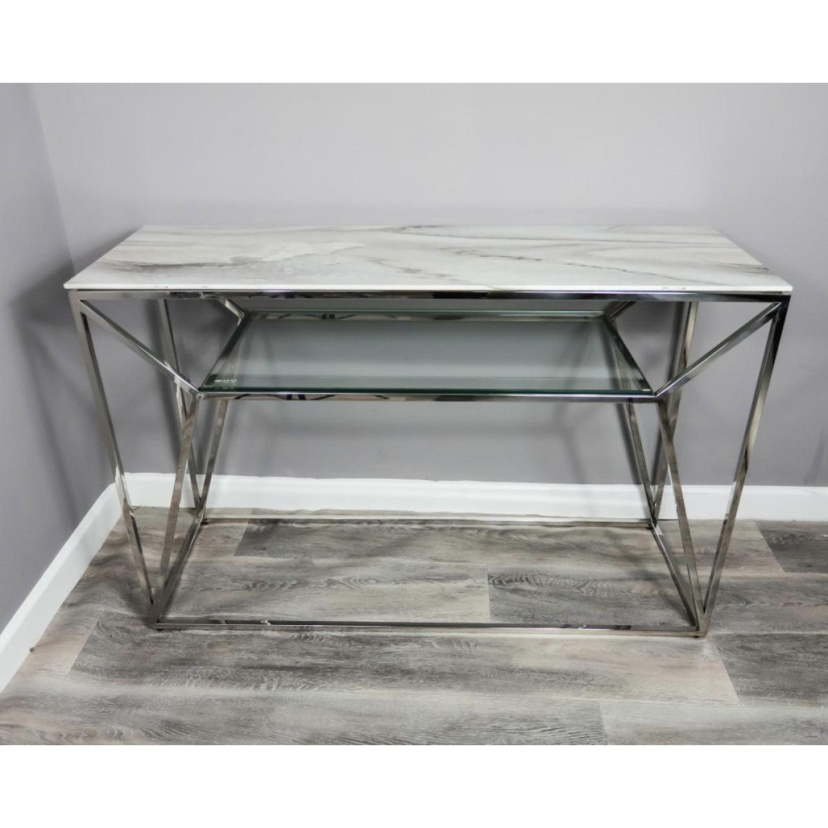 Beautiful stainless steel console table with marble glass top and clear glass shelf. Marble glass is a premium glass printed throughout layers. The glass does not stain easy like stone Marble, it's easily wipeable and will retain it's look. *Moot Trading Ltd is not a lender and acts only as an introducer. The credit product is provided by Klarna Bank AB (publ). Credit is only available to permanent UK residents aged 18 and over, subject to status. Terms and conditions apply. Please note that the following products are not regulated by the FCA: Pay in 30 days and Pay in 3 instalments. Read More.