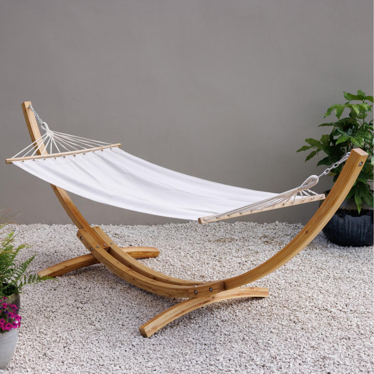 Relax in style in your garden this summer with this sophisticated wooden hammock stand. This eye-catching handcrafted stand is made from high quality pine wood finished with a unique natural colour featuring trend and elegance in your garden space. With two sturdy feet so you can feel free to relax in safety. Pair this with the hammock colour of your choice for your desired relaxation space. All hammock stands include accessory fittings to attach most hammocks. The Tortola Hammock offers the perfect escape for those looking to unwind and relax. Crafted from a durable, cotton-rich fabric, this hammock is designed for both comfort and strength. The braided cords add a touch of elegance while providing superior support, ensuring a peaceful and restful experience. The pine wood spreader bars contribute to its sturdy construction, allowing the hammock to be easily strung up between trees or mounted on one of our quality wooden stands. Whether you're lounging in the garden or enjoying a serene moment outdoors, the Tortola Hammock delivers ultimate relaxation.