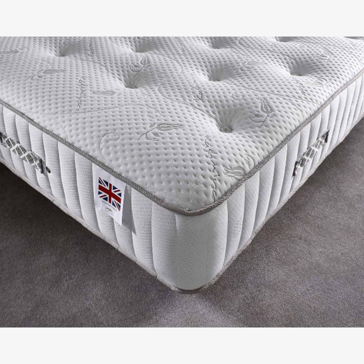 Natural Cashmere Pocket Mattress. Orthopaedic style support to ease back, neck and joint pain as well as improving circulation. Individual Pocket Springs mean movement on one side of the mattress doesn't affect the other side. The mattress contains deep layers of natural fillings for a long lifespan and features a premium breathable outer fabric cover and ventilation system that forces moist air out of the mattress this ensures the mattress remains cool and fresh. Finished with convenient transport handles and suitable for all types of bed basesframes and meets all UK quality and safety standards and comes with a 5 Year Aspire Warranty.