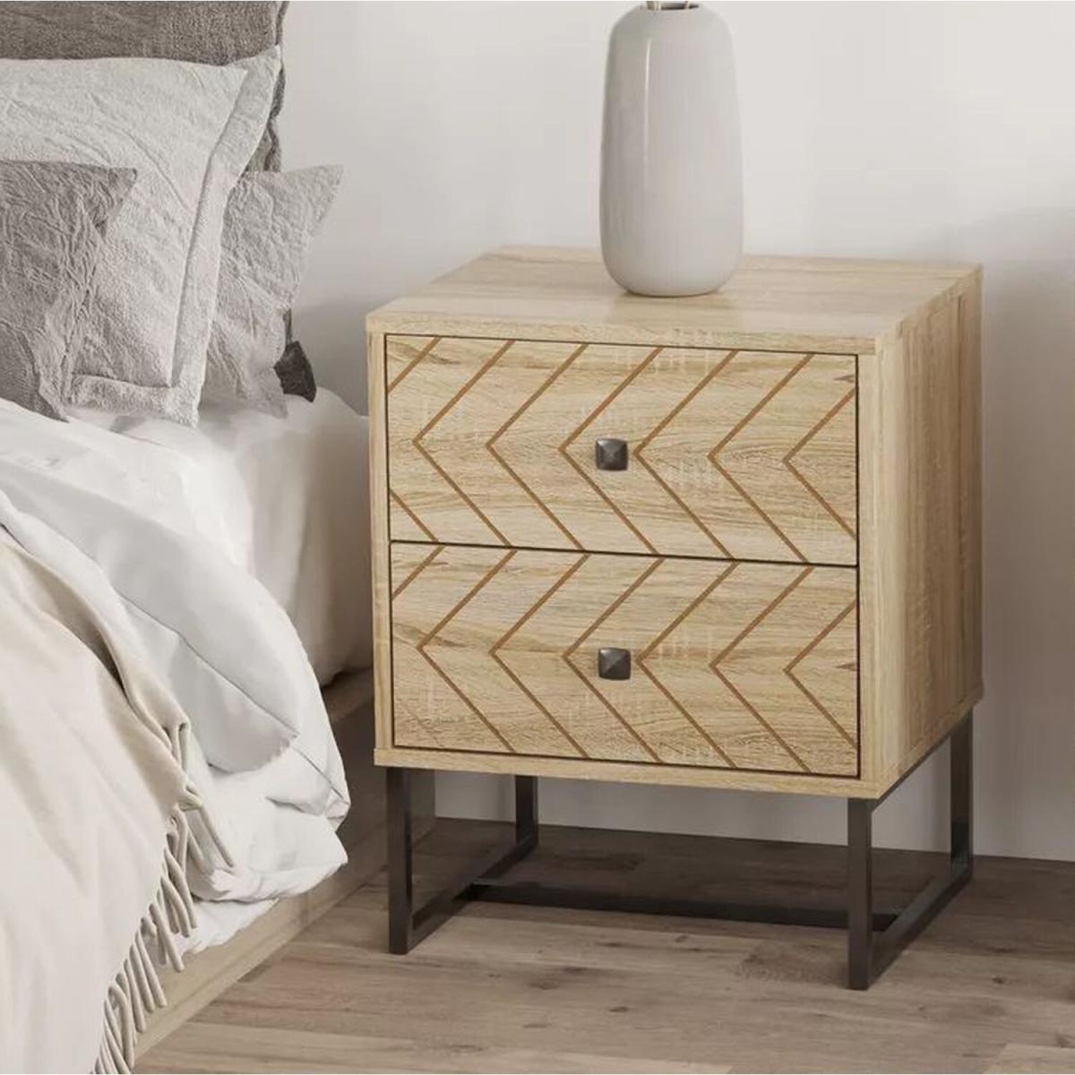 I love this natural bedside for its light oak-effect finish and subtle chevron inlay - it adds texture without overwhelming a space. It works particularly well in Scandi, modern farmhouse or coastal schemes, and the two drawers are perfect for stashing books, chargers or bedside essentials while keeping surfaces clear. For styling, pair it with a simple ceramic lamp, a small potted plant and a neat stack of current reads. To balance the low profile, hang a slim mirror or artwork just above, and you can echo the chevron motif in a cushion or runner elsewhere in the room.