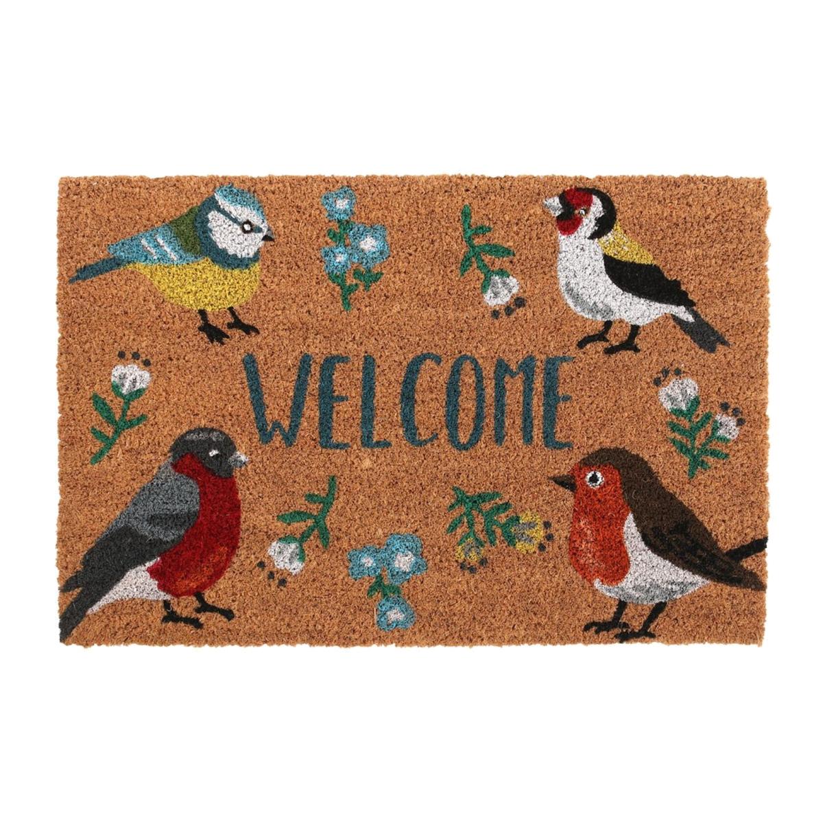 Welcome guests of all varieties with this charming coir doormat. Features classic Welcome text and adorable illustrations of common British garden birds, a Blue Tit, Robin, Goldfinch and Bullfinch. Perfect for covered porches and back garden entrances. Please note that the printed design may fade when left outside in extreme weather.
