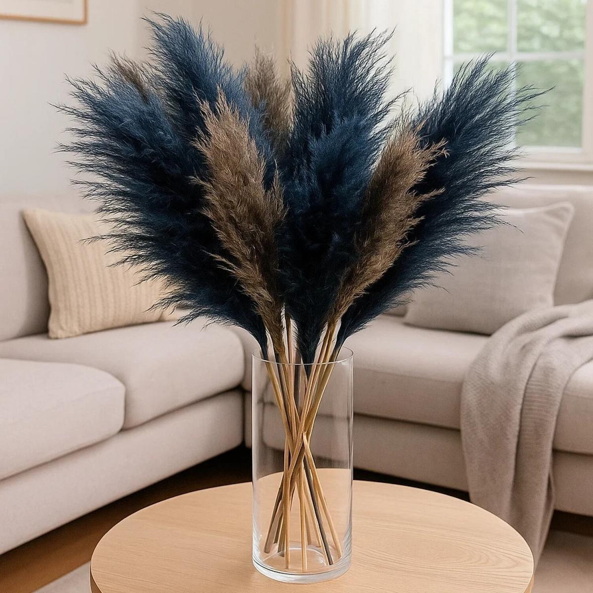The dried pampas flowers in blue and brown are a versatile addition to many interiors, offering a natural yet contemporary touch. I love how their neutral tones blend easily into both modern and boho decor schemes, adding texture without overwhelming the space. They work particularly well in minimalist settings or as statement pieces in vases on side tables or mantels. For styling tips, consider pairing them with earthy tones or monochrome schemes for a cohesive look. To keep them looking their best, give them a gentle shake every so often to remove dust and maintain their fluffy appearance.
