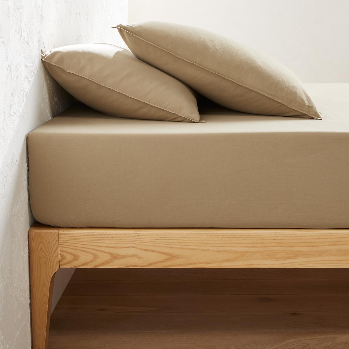 The Natural Dye range is made from 20% recycled cotton and 80% virgin cotton canvas, which is then dyed using white mulberry leaves for the Pastel Green colour, pomegranate peel for the Golden Khaki colour,Catechu acacia wood for the Smoked Pink colour and Kerria Lacca sticks for the Pastel Pink colour. This natural dye technique gives it a particular patina and subtle nuances that can vary and alter over time.. Cotton is part of our daily lives. We love it for its suppleness and softness. Easy Care, it is ideal for the beds of young and old alike!Product Details • 100% cotton • Contains 20% recycled cotton • Flap height 30cm for thick mattresses • 4 elasticated corners Care Advice • Machine washable at 30°C • Wash and dry inside out • Do not dry in the sun • Wash similar colours together • Use a gentle detergent. Dimensions • 90 x 190cm: Single • 140 x 190cm: Super King • 160 x 200cm: Super King • 180 x 200cm: King • Recycled cotton. Using recycled cotton is all about conserving resources and reducing waste.